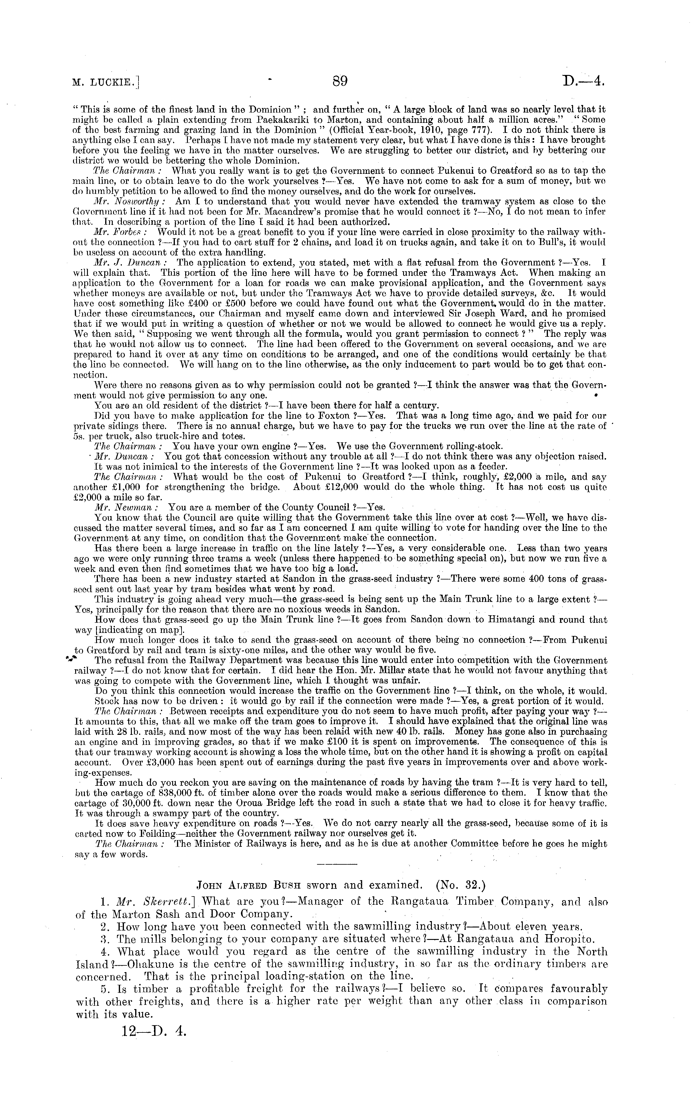 John Alfbed Bush sworn and examined. (No. 32.) 1. Mr. Sherrett."] What are you?— Manager of the Rangataua Timber Company, and also of the Marton Sash and Door Company. 2. How long have you been connected with the sawmilling industry?— About eleven years. ?>. The mills belonging to your company are situated where?—At Rangataua and Horopito. 4. What place would you regard as the centre of the sawmilling industry in the North Island? —Ohakune is the centre of the sawmilling industry, in so far as the ordinary timbers arc concerned. That is the principal loading-station on the line, l>. Is timber a profitable freight for the railways?—l believe so. It compares favourably with other freights, and thero is a higher rate per weight than any other class in comparison with its value.