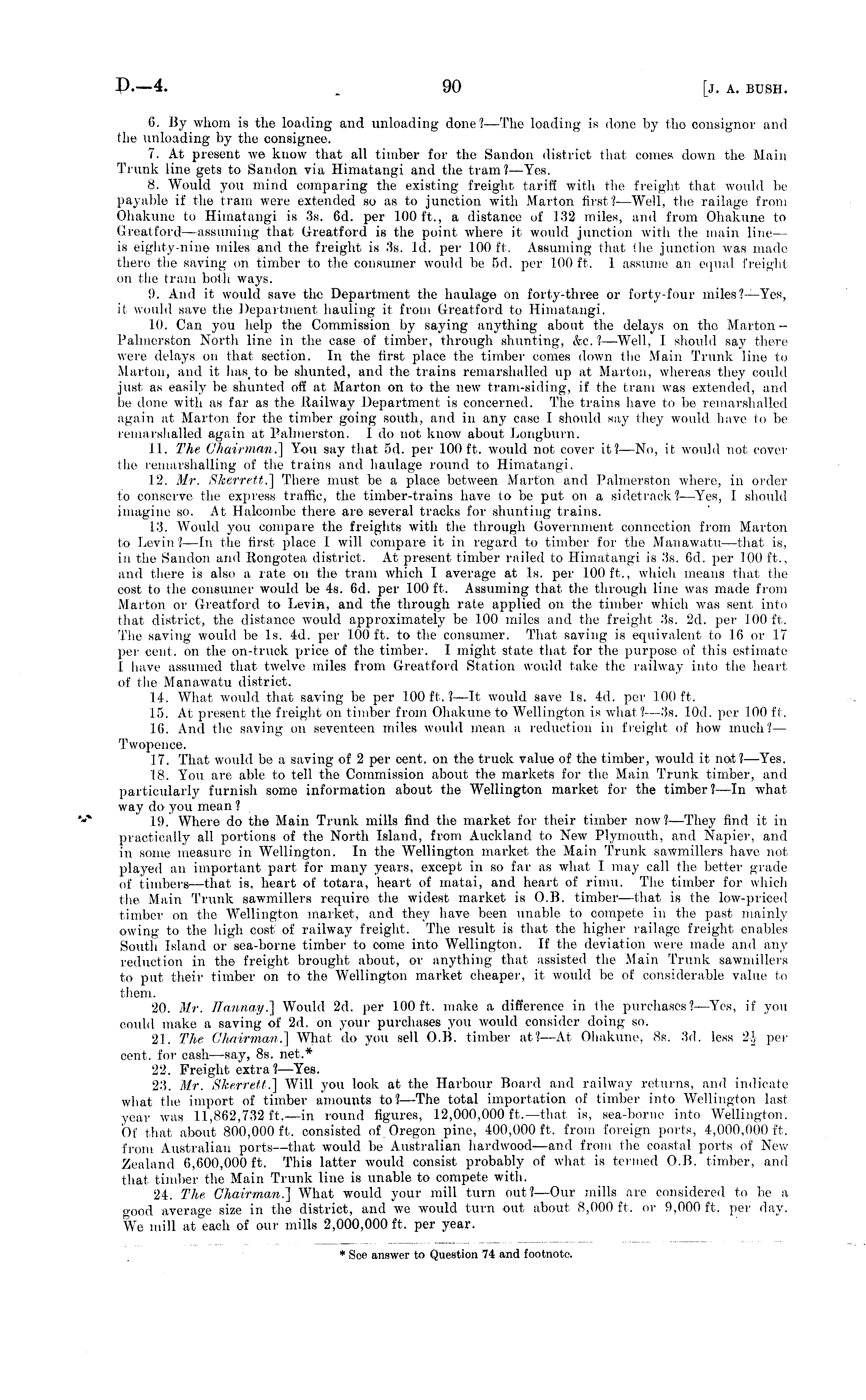 6. By whom is the loading and unloading done?— The loading is done by the consignor and the unloading by the consignee. 7. At present we know that all timber for the Sandon district that comes down the Main Trunk line gets to Sandon via Himatangi and the tram?— Yes. 8. Would you mind comparing the existing freight, tariff with the freight that would be payable if the tram were extended so as to junction with Marton first? —Well, the railage from Ohakuno to Himatangi is 3s. 6d. per 100 ft., a distance of 132 miles, and from Ohakune to Greatford—assuming that Greatford is the point where it would junction with the main line — is eighty-nine miles and the freight is 3s. Id. per 100 ft. Assuming that the junction was made there the saving on timber to the consumer would be sd. per 100 ft. 1 assume an equal freight on (he tram both ways. 9. And it would save the Department the haulage on forty-three or forty-four miles?— Yes, it would save the Department hauling it from Greatford to Himatangi. 10. Can you help the Commission by saying anything about the delays on the Marton - Palmerston North line in the case of timber, through shunting, &,c. ?—Well, I should say there were delays on that section. In the first place the timber comes down the Main Trunk line to Marton, and it has_ to be shunted, and the trains remarshalled up at Marlon, whereas they could just as easily be shunted off at Marton on to the new tram-siding, if the tram was extended, and be done with as far as the Railway Department is concerned. The trains have to bo remarshalled again at Marton for the timber going south, and in any case I should say they would have to be remarshalled again at Palmerston. Ido not know about Longburn. 11. The Chairman.] You say that sd. per 100 ft. would not cover it?—No, it would not cover the remarshalling of the trains and haulage round to Himatangi. 12. Mr. BheTVttt,] There must be a place between Marton and Palmerston where, in order to conserve the express traffic, the timber-trains have to be put on a sidetrack ?—Yes, I should imagine so. At Halcombe there are several tracks for shunting trains. 13. Would you compare the freights with the through Government connection from Marton to Levin ? —ln the first place I will compare it in regard to timber for the Manawatu—that is, in the Sandon and Rongotea district. At present timber railed to Himatangi is 3s. 6d. per 100 ft., and there is also a rate on the tram which I average at Is. per 1.00 ft., which means that the cost to the consumer would be 4s. 6d. per 100 ft. Assuming that the through line was made from Marton or Greatford to Levin, and the through rate applied on the timber which was sent into that district, the distance would approximately be 100 miles and the freight 3s. 2d. per 100 ft. The saving would be Is. 4d. per 100 ft. to the consumer. That saving is equivalent to 16 or 17 per cent, on the on-truck price of the timber. I might state that for the purpose of this estimate I have assumed that twelve miles from Greatford Station would take the railway into the heart of the Manawatu district. 14. What would that saving be per 100 ft. ?—lt would save Is. 4d. per 100 ft. 15. At present the freight on timber from Ohakune to Wellington is what?—3s. 10d. per 100 ft. 16. And the saving on seventeen miles would mean a reduction in freight of how much?— Twopence. 17. That would be a saving of 2 per cent. on. the truck value of the timber, would it not?— Yes. 18. You are able to tell the Commission about the markets for the Main Trunk timber, and particularly furnish some information about the Wellington market for the timber?—ln what way do you mean ? •* 19. Where do the Main Trunk mills find the market for their timber now?— They find it in practically all portions of the North Island, from Auckland to New Plymouth, and Napier, and in some measure in Wellington. In the Wellington market the Main Trunk sawmillers have not played an important part for many years, except in so far as what I may call the better grade of timbers —that is, heart of totara, heart of matai, and heart of rimu. The timber for which the Main Trunk sawmillers require the widest market is 0.8. timber—that is the low-priced timber on the Wellington market, and they have been unable to compete in the past mainly owing to the high cost of railway freight. The result is that the higher railage freight enables South Island or sea-borne timber to come into Wellington. If the deviation were made and any reduction in the freight brought about, or anything that assisted the Main Trunk sawmillers to put their timber on to the Wellington market cheaper, it would lie of considerable value to them. 20. Mr. Ilannay.] Would 2d. per 100 ft. make a difference in the purchases? —Yes, if you could make a saving of 2d. on your purchases you would consider doing so. 21. The Chairman.] What do you sell 0.8. timber at?—At Ohakune, Bs. 3d. less 2J per cent, for cash —say, Bs. net.* 22. Freight extra t —Yes. 23. Mr. Skerrett.] Will you look at the Harbour Board and railway returns, and indicate what the import of timber amounts to? —The total importation of timber into Wellington last year was 11,862,732 ft.—in round figures, 12,000,000 ft.— that is, sea-borne into Wellington. Of that about 800,000 ft. consisted of Oregon pine, 400,000 ft. from foreign ports, 4,000,000 ft. from Australian ports —that would be Australian hardwood—and from the coastal ports of New Zealand 6,600,000 ft. This latter would consist probably of what is termed 0.8. timber, and that timber the Main Trunk line is unable to compete with. 24. The Chairman.] What would your mill turn out?— Our mills are considered to he a good average size in the district, and we would turn out about B,oooft. or 9,000 ft. per day. We mill at each of our mills 2,000,000 ft, per year.