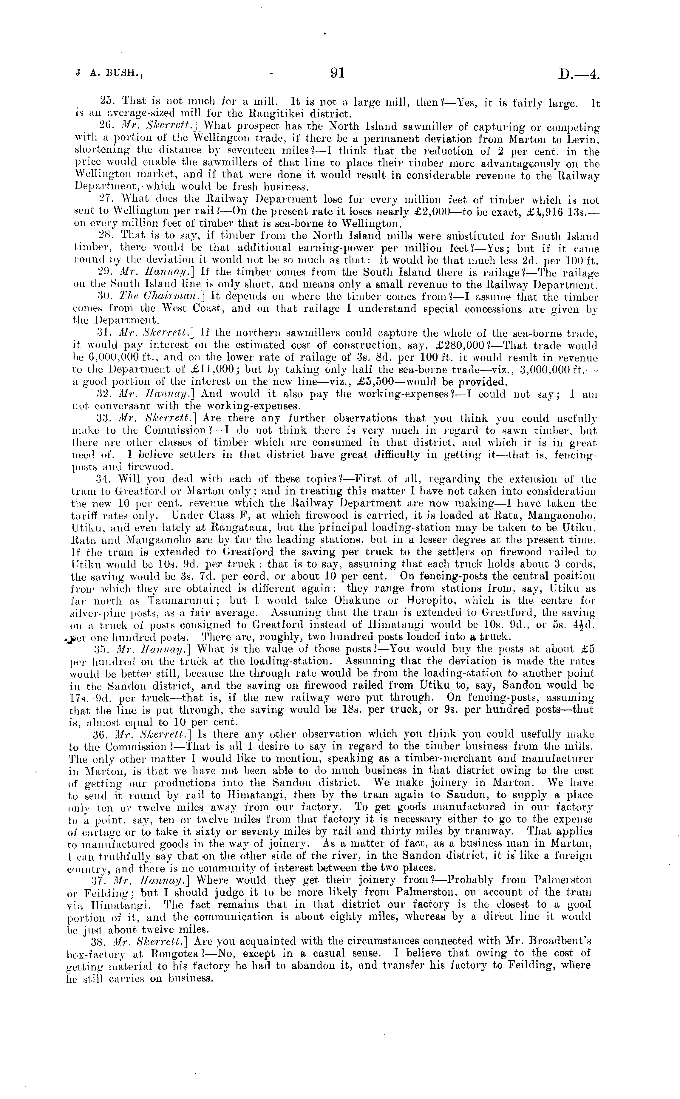 25. That is not much for a mill. It is not a largo mill, then?— Yes, it is t'airlv large. It is an average-sized mill for the Rangitikei district. 26. Mr. Skerrett,] What prospect has the North Island sawmiller of capturing or competing with a portion of the Wellington trade, if there be a permanent deviation from Marton to Levin, shortening the distance by seventeen miles?—l think that the reduction of 2 per cent, in the price would enable the sawmillers of that line to place their timber more advantageously on the Wellington market, and if that were done it would result in considerable revenue to the Railway Department, ■ which would be fresh business. 27. What does the Railway Department lose for every million feet of timber which is not sent to Wellington per rail?—On the present rate it loses nearly .£2,000 —to lie exact, £L 916 13s.— on every million feet of timber that is sea-borne to Wellington. 28. That is to say, if timber from the North Island mills were substituted for South Island timber, there would be that additional earning-power per million feet?— Yes; but if it came round by the deviation it would not be so much as that: it would be that much less 2d. per 100 ft. 29. Mr. Hannai/.] If the timber comes from the South Island there is railage) — The railage on the South Island line is only short, and means only a small revenue to the Railway Department. 30. The Chairman.] It depends on where the timber comes from? —I assume that the timber conies from the West Coast, and on that railage I understand special concessions are given by the Department. .'3l. Mr. Skerrett.] If the northern sawmillers could capture the whole of the sea-borne trade, i( would pay interest on the estimated cost of construction, say, £280,000? —That trade would be 6,000,000 ft., and on the lower rate of railage of 3s. Bd. per 100 ft. it would result in revenue to the Department of £11,000; but by taking only half the sea-borne trade—viz., 3,000,000 ft. — a good portion of the interest on the new line—viz., £5,500 —would be provided. 32. Mr. Hannai/.] And would it also pay the working-expenses?—l could not say; lam not conversant with the working-expenses. 33. Mr. Skerrett.] Are there any further observations that you think you could usefully make to the Commission? —1 do not think there is very much in regard to sawn timber, but there are other classes of timber which are consumed in that district, and which it is in great need of. I believe settlers in that district have great difficulty in getting it—that is, fencingposts and firewood. 3<t. Will you deal with each of these topics?— First of all, regarding the extension of the tram to (ireatford or Marton only; and in treating this matter I have not taken into consideration the new 10 per cent, revenue which the Railway Department are now making—l have taken the tariff rates only. Under Class F, at which firewood is carried, it is loaded at Rata, Mangaonoho, Utiku, and even lately at ltangataua, but the principal loading-station may be taken to be Utiku. Rata and Mangaonoho are by far the leading stations, but in a lesser degree at the present time. If the train is extended to Greatford the saving per truck to the settlers on firewood railed to Utiku would be 10s. 9d, per truck: that is to say, assuming that each truck holds about 3 cords, the saving would be 3s. 7d. per cord, or about 10 per cent. On fencing-posts the central position from which they are obtained is different again: they range from stations from, say, Utiku as far north as Taumarunui; but I would take Ohakunc or lloropilo, which is the centre for silver-pine posts, as a fair average. Assuming that the tram is extended to Greatford, the saving on a truck of posts consigned to Greatford instead of Himatangi would be 10s. 9d., or ss. 4Jd. .jicv one hundred posts. There arc, roughly, two hundred posts loaded into a truck. 35. Mr. llannay.] What is the value of those posts?— You would buy the posts at about £5 per hundred on the truck at the loading-station. Assuming that the deviation is made the rates would be better still, because the through rate would be from the loading-station to another pointin the Sandon district, and the saving on firewood railed from Utiku to, say, Sandou would be 17s. 9d. pei' truek —that is, if the new railway were put through. On fencing-posts, assuming that the line is put through, the saving would be 18s. per truck, or 9s. per hundred posts—that is, almost equal to 10 per cent. 36. Mr. Skerrett.] Is there any other observation which you think you could usefully make to the Commission ?—That is all I desire to say in regard to the timber business from the mills. The only other matter 1 would like to mention, speaking as a timber-merchant and manufacturer in Marton, is that we have not been able to do much business in that district owing to the cost of getting our productions into the Sandon district. We make joinery in Marton. We have to send it round by rail to Himatangi, then by the tram again to Sandon, to supply a place only ten or twelve miles away from our factory. To get goods manufactured in our factory to a point, say, ten or twelve miles from that factory it is necessary either to go to the expense of cartage or to take it sixty or severity miles by rail and thirty miles by tramway. That applies to manufactured goods in the way of joinery. As a matter of fact, as a business man in Marton, I can truthfully say that on the other side of the river, in the Sandon district, it is" like a foreign country, and there is no community of interest between the two places. 37. Mr. 11 an nay .] Where would they get their joinery from? —Probably from Palmerston or Feilding; but I should judge it to be more likely from Palmerston, on account of the tram via, Himatangi. The fact remains that in that district our factory is the closest to a good portion of it, and the communication is about eighty miles, wherea
