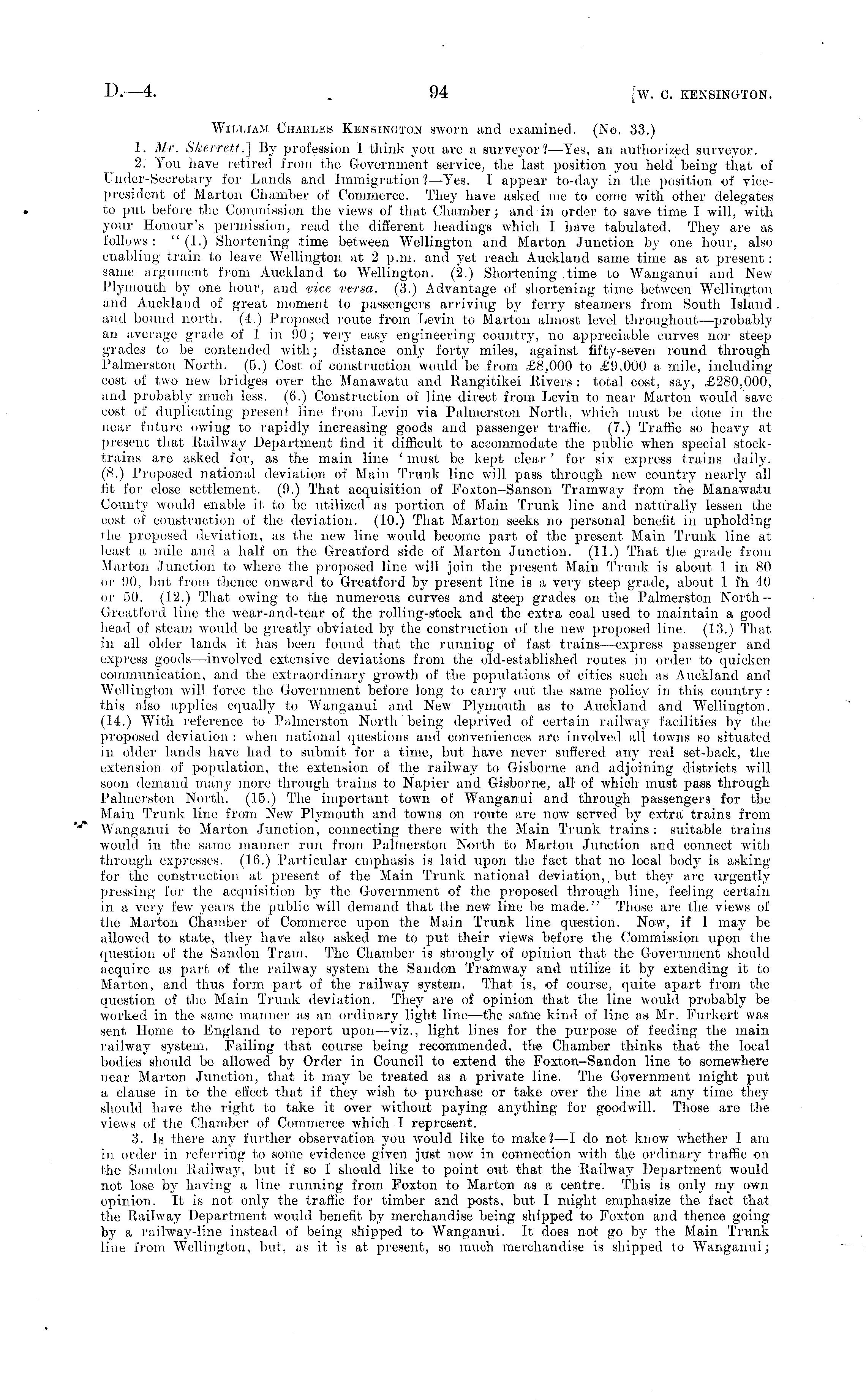 William Charles Kensinliton sworn and examined. (No. 33.) l> Mr. Skerrett.] By profession 1 think you live a surveyor?— Yes, an authorized surveyor. 2. You have retired from the Government service, the last position you held being that of Under-Secretary for Lands and Immigration I —Yes. I appear to-day in the position of vicepresident of Marton Chamber of Commerce. They have asked me to come with other delegates . to put before the Commission the views of that Chamber; and in order to save time I will, with your Honour's permission, read the different headings which I have tabulated. They are as follows: "(1.) Shortening time between Wellington and Marton Junction by one hour, also ■ enabling train to leave Wellington at. 2 p.m. and yet reach Auckland same time as at present: same argument from Auckland to Wellington. (2.) Shortening time to Wanganui and New Plymouth by one hour, and vice versa. (3.) Advantage of shortening time between Wellington and Auckland of great moment to passengers arriving by ferry steamers from South Island and bound north. (4.) Proposed route from Levin to Marton. almost level throughout—probably an average grade of 1 in 90; very easy engineering country, no appreciable curves nor steep grades to be contended with; distance only forty miles, against fifty-seven round through Palmerston North. (5.) Cost of construction would be from £8,000 to £9,000 a mile, including cost of two new bridges over the Manawatu and Rangitikei Rivers : total cost, say, £280,000, and probably much less. (6.) Construction of line direct from Levin to near Marton would save cost of duplicating present line from Levin via Palmerston North, which must be done in the near future owing to rapidly increasing goods and passenger traffic. (7.) Traffic so heavy at present that Railway Department find it difficult to accommodate the public when special stocktrains are asked for, as the main line ' must be kept clear ' for six express trains daily. (iS.) Proposed national deviation of Main Trunk line will pass through new country nearly all fit for close settlement, (9.) That acquisition of Foxton-Sanson Tramway from the Manawatu County would enable it to be utilized as portion of Main Trunk line and naturally lessen the cost of construction of the deviation. (10.) That Marton seeks no personal benefit in upholding the proposed deviation, as the new line would become part of the present Main Trunk line at least a mile and a half on the Greatford side of Marton Junction. (II.) That the grade from Marton Junction to where the proposed line will join the present Main Trunk is about 1 in 80 or 90, but from thence onward to Greatford by present line is a very cteep grade, about 1 fh 40 or 50. (12.) That owing to the numerous curves and steep grades on the Palmerston North — Greatford line the wear-and-tear of the rolling-stock and the extra coal used to maintain a good head of steam would be greatly obviated by the construction of the new proposed line. (13.) That in all older lands it has been found that the running of fast trains—express passenger and express goods —involved extensive deviations from the old-established routes in order to quicken communication, and the extraordinary growth of the populations of cities such as Auckland and Wellington, will force the Government before long to carry out the same policy in this country : this also applies equally to Wanganui and New Plymouth as to Auckland and Wellington. (14.) With reference to Palmerston North being deprived of certain railway facilities by the proposed deviation : when national questions and conveniences are involved all towns so situated in older lands have had to submit for a time, but have never suffered any real set-back, the extension of population, the extension of the railway to Gisborne and adjoining districts will soon demand many more through trains to Napier and Gisborne, all of which must pass through Palmerston North, (15.) The important town of Wanganui and through passengers for the Main Trunk line from New Plymouth and towns on route are now served by extra trains from Wanganui to Marton Junction, connecting there with the Main Trunk trains : suitable trains would in the same manner run from Palmerston North to Marton Junction and connect with through expresses. (16.) Particular emphasis is laid upon the fact that no local body is asking for the construction at present of the Main Trunk national deviation,, but they are urgently pressing for the acquisition by the Government of the proposed through Hue, feeling certain in a very few years the public will demand that the new line be made." Those are the views of the Marton Chamber of Commerce upon the Main Trunk line question. Now, if 1 may be allowed to state, they have also asked me to put their views before the Commission upon the question of the Sandon Tram. The Chamber is strongly of opinion that the Government should acquire as part of the railway system the Sandon Tramway and utilize it by extending it to Marton, and thus form part of the railway system. That is, of course, quite apart from the question of the Main Trunk deviation. They are of opinion that the line would probably be worked in the same manner as an ordinary light line —the same kind of line as Mr. Furkert was sent Home to England to report upon—viz., light lines for the purpose of feeding the main railway system. Failing that course being recommended, the Chamber thinks that the local bodies should be allowed by Order in Council to extend the Foxton-Sandon line to somewhere near Marton Junction, that it may be treated as a private line. The Government might put a clause in to the effect that if they wish to purchase or take over the line at any time they should have the right to take it over without paying anything for goodwill. Those are the views of the Chamber of Commerce which I represent. 3. Is there any further observation you would like to make?—l do not know whet