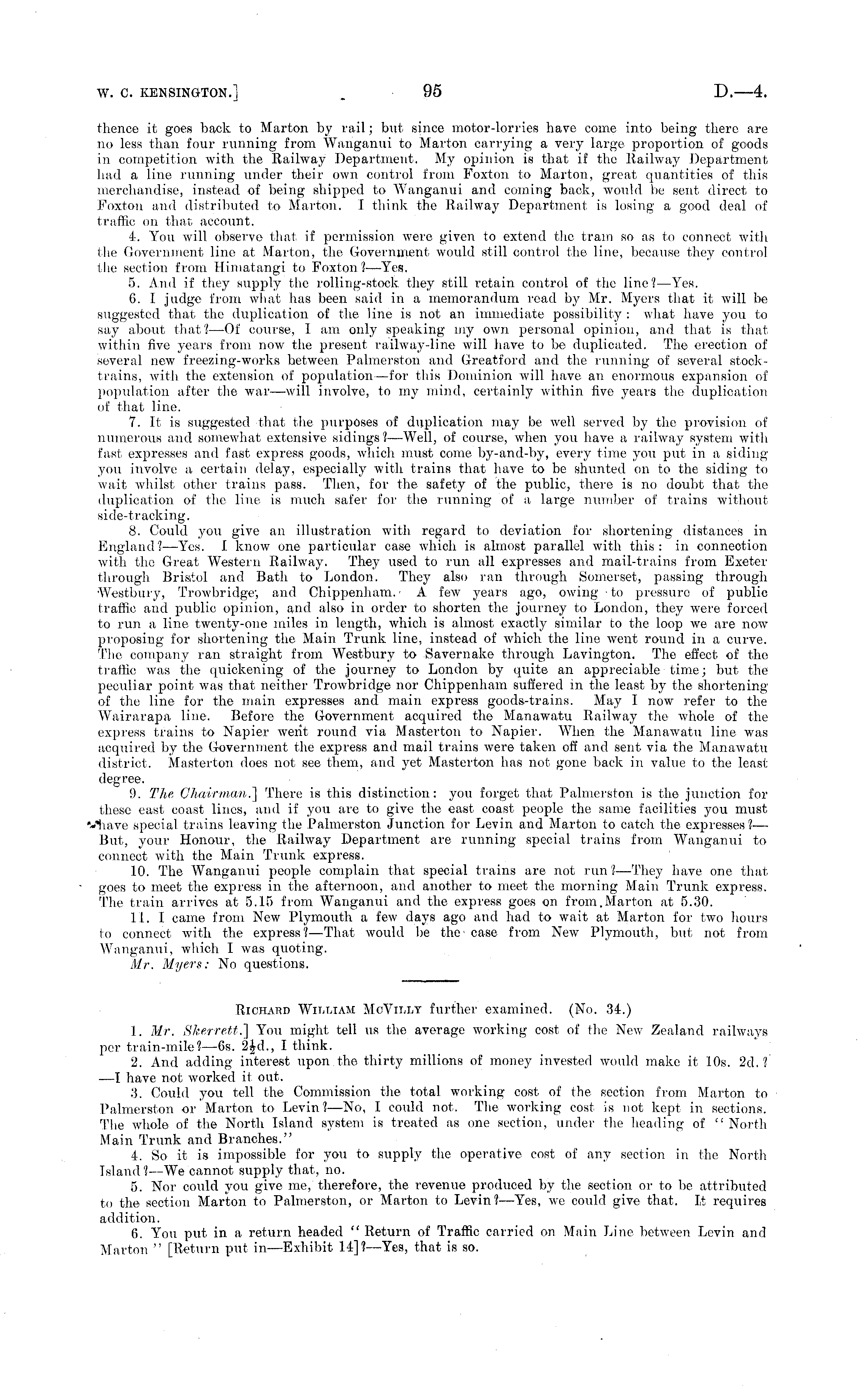 thence it goes back to Marton by rail; but since motor-lorries have come into being there are no less than four running from Wanganui to Marton carrying a very large proportion of goods in competition with, the Kailway Department. My opinion is that if the Railway Department had a line running under their own control from Foxton to Marton, great quantities of this merchandise, instead of being shipped to Wanganui and coming back, would be sent direct to Foxton and distributed to Marton. I think the Railway Department is losing a good deal of traffic on that, account. 4. You will observe that if permission were given to extend the tram so as to connect with the Government line at Marton, the Government would still control the line, because they control the section from Himatangi to Foxton'l—-Yes. 5. And if they supply the rolling-stock they still retain control of the line?— Yes. 6. I judge from what has been said in a memorandum read by Mr. Myers that it will be suggested that the duplication of the lino is not an immediate possibility : what have you to say about that/.'—Of course, 1 am only speaking my own personal opinion, and that is that within five years from now the present railway-line will have to be duplicated. The erection of several new freezing-works between Palmerston and Greatford and the running of several stocktrains, with the extension of population—for this Dominion will have an enormous expansion of population after the war —will involve, to my mind, certainly within five years the duplication of that line. 7. It is suggested that the purposes of duplication may be well served by the provision of numerous and somewhat extensive sidings?— Well, of course, when you have a railway system with fast expresses and fast express goods, which must come by-and-by, every time you put in a siding you involve a certain delay, especially with trains that have to be shunted on to the siding to wait whilst other trains pass. Then, for the safety of the public, there is no doubt that the duplication of the line is much safer for the running , of a, large number of trains without side-tracking. 8. Could you give an illustration with regard to deviation for shortening distances in England? —Yes. I. know one particular case which is almost parallel with this: in connection with the Great Western Railway. They used to run all expresses and mail-trains from Exeter through Bristol and Bath to London. They also pan through Somerset, passing through Westbury, Trowbridge', and Chippenham. ■ A few years ago, owing to pressure of public traffic and public opinion, and also in order to shorten the journey to London, they were forced to run a line twenty-one miles in length, which is almost exactly similar to the loop we are now proposing for shortening the Main Trunk line, instead of which the line went round in a curve. The company ran straight from Westbury to Savernake through Lavington. The effect of the traffic was the quickening of the journey to London, by quite an appreciable time; but the peculiar point was that neither Trowbridge nor Chippenham suffered in the least by the shortening of the line for the main expresses and main express goods-trains. May 1 now refer to the Wairarapa line. Before the Government acquired the Manawatu Railway the whole of the express trains to Napier went round via Masterton to Napier. When the Manawatu line was acquired by the Government the express and mail trains were taken off and sent via the Manawatu district. Masterton does not see them, and yet Masterton has not gone back in value to the least degree. 9. The Chairman.] There is this distinction: you forget that Palmerston is the junction for these east coast lines, and if you are to give the east coast people the same facilities you must vhave special trains leaving the Palmerston Junction for Levin and Marton to catch the expresses?— But, your Honour, the Railway Department are running special trains from Wanganui to connect with the Main Trunk express. 10. The Wanganui people complain that special trains are not run?— They have one that goes to meet the express in the afternoon, and another to meet the morning Main Trunk express. The train arrives at 5.15 from Wanganui and the express goes on from Marton at 5.,50. 11. I came from New Plymouth a few days ago and had to wait at Marton for two hours to connect with the express?— That would be the case from New Plymouth, but not from Wanganui, which I was quoting. Mr. Myers: No questions.