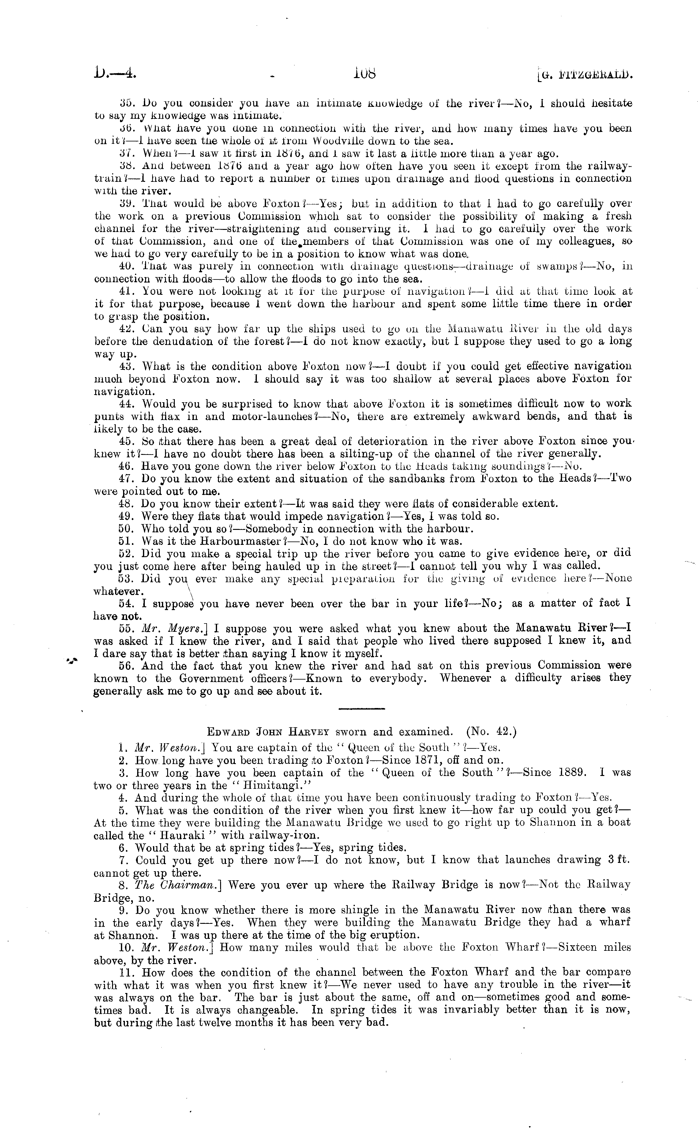 Edward John Harvey sworn and examined. (No. 42.) 1. Mr. Weston.] You are captain of the " Queen of the South " ?—Yes. 2. How long have you been trading ,to Foxton I—Since 1871, off and on. 3. How long have you been captain of the "Queen of the South"? —Since 1889. 1 was two or three years in the " Himitangi." 4. And during the whole of that time you have been continuously trading to Foxton 'I —Yes. 5. What was the condition of the river when you first knew it—how far up could you get? — At the time they were building the Manawatu Bridge we used to go right up to Shannon in a boat called the " Hauraki " with railway-iron. 6. Would that be at spring tides?— Yes, spring tides. 7. Could you get up there now?—l do not know, but I know that launches drawing 3 ft. cannot get up there. 8. The Chairman.] Were you ever up where the Eailway Bridge is now? —Not the Railway Bridge, no. 9. Do you know whether there is more shingle in the Manawatu River now rthan there was in the early days? —Yes. When they were building the Manawatu Bridge they had a wharf at Shannon. I was up there at the time of the big eruption. 10. Mr. Western.] How many miles would that be above the Foxton Wharf? —Sixteen miles above, by the river. 11. How does the condition of the channel between the Foxton Wharf and the bar compare with what it was when you first knew it?—We never used to have any trouble in the river—it was always on the bar. The bar is just about the same, off and on —sometimes good and sometimes bad. It is always changeable. In spring tides it was invariably better than it is now, but during (the last twelve months it has been very bad.