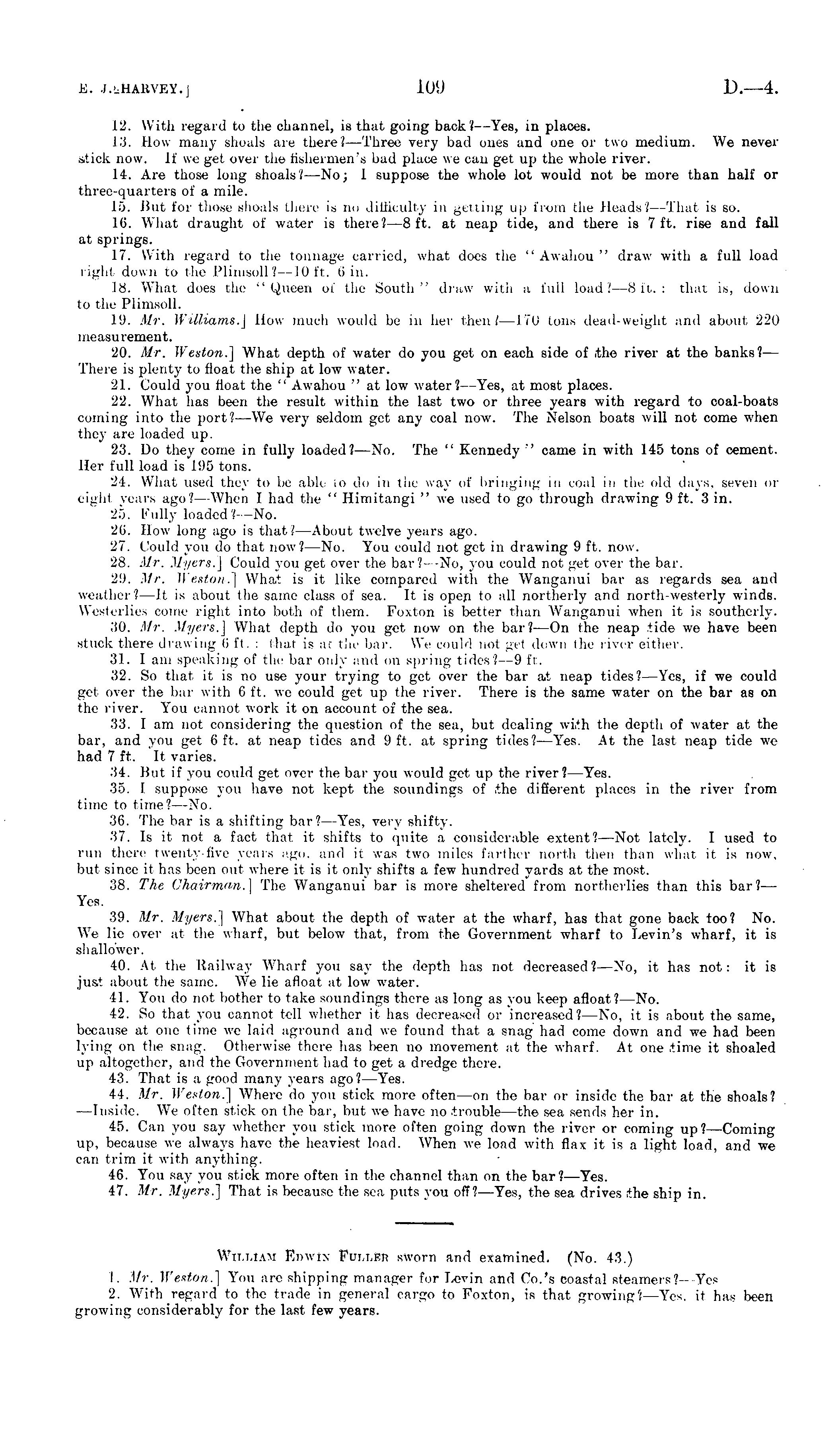 William Edwin Fuller sworn and examined, (No. 43.) 1. Mr. Weston.] You are shipping manager for Levin and Co.'s coastal steamers? —Yes 2. With regard to the trade in general cargo to Foxton, is that growing?— Yes, it has been growing considerably for the last few years.
