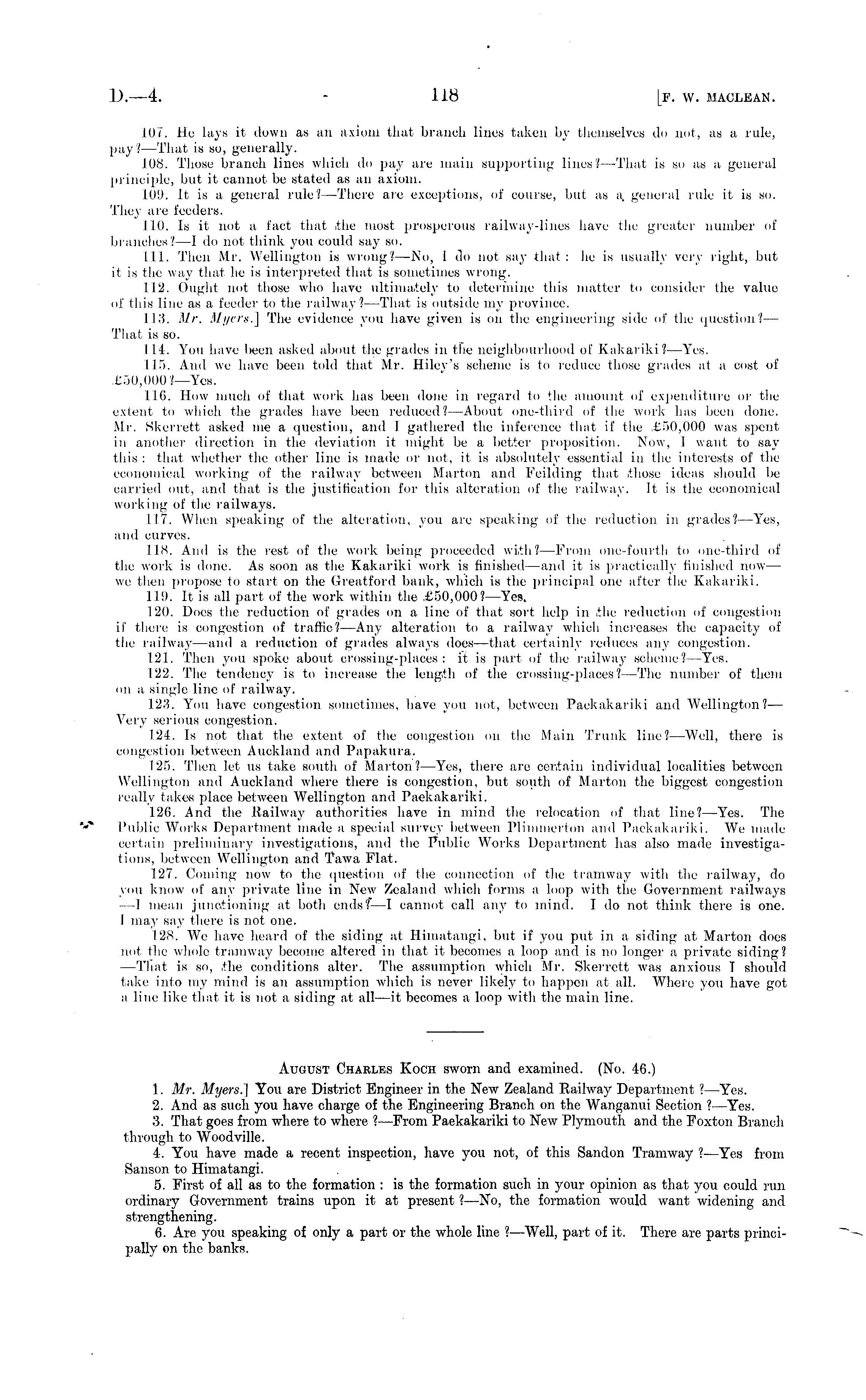 August Charles Koch sworn and examined. (No. 46.) 1. Mr. Myers.'] You arc District Engineer in the New Zealand Railway Department ? —Yes. 2. And as such you have charge, of the. Engineering Branch on the Wanganui Section ?—Yes. 3. That goes from where to where ? —From Paekakariki to New Plymouth and the Foxton Branch through to Woodville. 4. You have made a recent inspection, have you not, of this Sandon Tramway ? —Yes from Sanson to Himatangi. 5. First of all as to the formation : is the formation such in your opinion as that you could run ordinary Government trains upon it at present ? —No, the formation would want widening and strengthening. 6. Are you speaking of only a part or the whole line ? —Well, part of it. There arc parts principally on the banks.