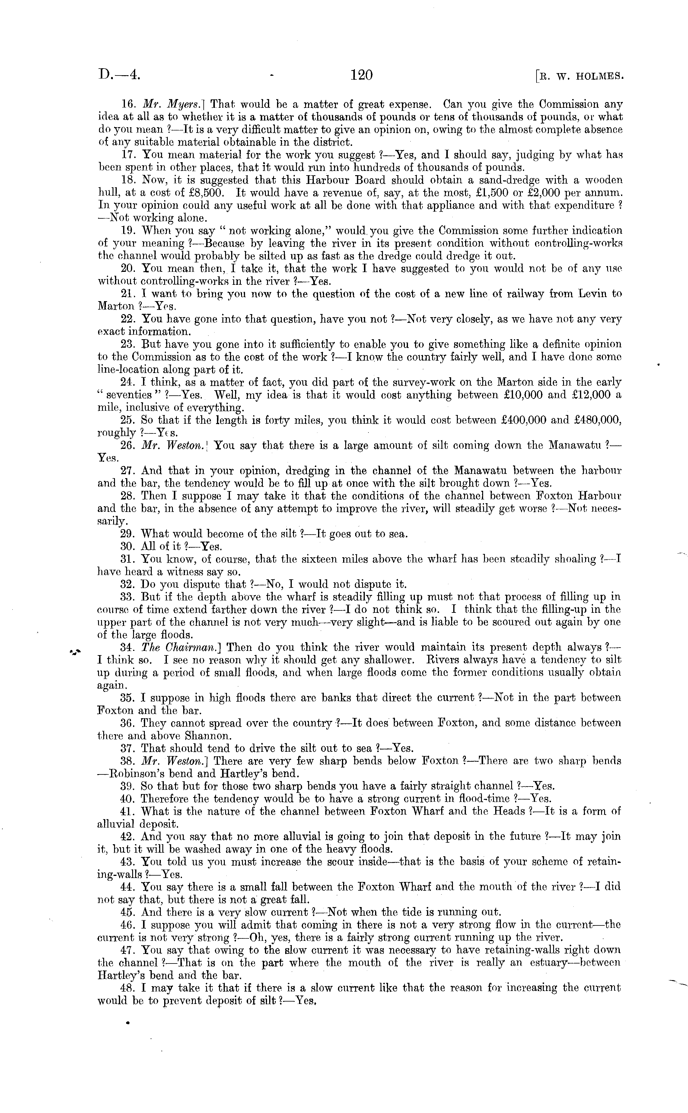 16. Mr. Myers.] That would he a matter of great expense. Can you give the Commission any idea at all as to whether it is a matter of thousands of pounds or tens of thousands of pounds, or what do you mean ?—lt is a very difficult matter to give an opinion on, owing to the almost complete absence of any suitable material obtainable in the district. 17. You mean material for the work you suggest ?—Yes, and I should say, judging by what has been spent in other places, that it would run into hundreds of thousands of pounds. 18. Now, it is suggested that this Harbour Board should obtain a sand-dredge with a wooden hull, at a cost of £8,500. It would have a revenue of, say, at the most, £1,500 or £2,000 per annum. In your opinion could any useful work at all be done with, that appliance and with that expenditure ? - -Not working alone. 19. When you say " not working alone," would you give the Commission some further indication of your meaning ?—Because by leaving the river in its present condition without controlling-works the channel would probably be silted up as fast as the dredge could dredge it out. 20. You mean then, I take it, that the work I have suggested to you would not be of any use without controlling-works in the river ?■ —Yes. 21. I want to bring you now to the question of the cost of a new line of railway from Levin to Marton ? —Yes. 22. You have gone into that question, have you not ?—Not very closely, as we have not any very exact information. 23. But have you gone into it sufficiently to enable you to give something like a definite opinion to the Commission as to the cost of the work ? —I know the country fairly well, and I have done some line-location along part of it. 24. I think, as a matter of fact, you did part of the survey-work on the Marton side in the early " seventies " ?—Yes. Well, my idea is that it would cost anything between £10,000 and £12,000 a mile, inclusive of everything. 25. So that if the length is forty miles, you think it would cost between £400,000 and £480,000, roughly ?—Yts. 26. Mr. Weston. ' You say that there is a large amount of silt coming down the Manawatu ? — Yes. 27. And that in your opinion, dredging in the channel of the Manawatu between the harbour and the bar, the tendency would be to fill up at once with the silt brought down ? —Yes. 28. Then I suppose I may take it that the conditions of the channel between Foxton Harbour and the bar, in the absence of any attempt to improve the river, will steadily get worse ? —Not necessarily. 29. What would become of the silt ? —lt goes out to sea. 30. All of it ?— Yes. 31. You know, of course, that the sixteen miles above the wharf has been steadily shoaling ?■ —I have heard a witness say so. 32. Do you dispute that I —No, I would not dispute it. 33. But if the depth above the wharf is steadily filling up must not that process of filling up in course of time extend farther down the river % —I do not think so. I think that the filling-up in the upper part of the channel is not very much—very slight—and is liable to be scoured out again by one of the large floods. 34. The Chairman.] Then do you think the river would maintain its present depth always ?■— I think so. I see no reason why it should get any shallower. Rivers always have a tendency to silt up during a period of small floods, and when large floods come the former conditions usually obtain again. 35. I suppose in high, floods there arc banks that direct the current ?—Not in the part between Foxton and the bar. 36. They cannot spread over the country? —It does between Foxton, and some distance between there and above Shannon. 37. That should tend to drive the silt out to sea ?—Yes. 38. Mr. Weston.] There are very few sharp bends below Foxton ?—There are two sharp bends — Eobinson's bend and Hartley's bend. 39. So that but for those two sharp bends you have a fairly straight channel ? —Yes. 40. Therefore the tendency would be to have a strong current in flood-time ? —Yes. 41. What is the nature of the channel between Foxton Wharf and the Heads ? —lt is a form of alluvial deposit. 42. And you say that no more alluvial is going to join that deposit in the future ?—lt may join it, but it will be washed away in one of the heavy floods. 43. You told us you must increase the scour inside—that is the basis of your scheme of retain-ing-walls ?■ —Yes. 44. You say there is a small fall between the Foxton Wharf and the mouth of the river ? —I did not say that, but there is not a great fall. 45. And there is a very slow current ?—Not when the tide is running out. 46. I suppose you will admit that coming in there is not a very strong flow in the current—the current is not very strong ? —Oh, yes, there is a fairly strong current running up the river. 47. You say that owing to the slow current it was necessary to have retaining-walls right down the channel ?■ —That is on the part where the mouth of the river is really an estuary —between Hartley's bend and the bar. 48. I may take it that if there is a slow current like that the reason for increasing the current would be to prevent deposit of silt ? —Yes,