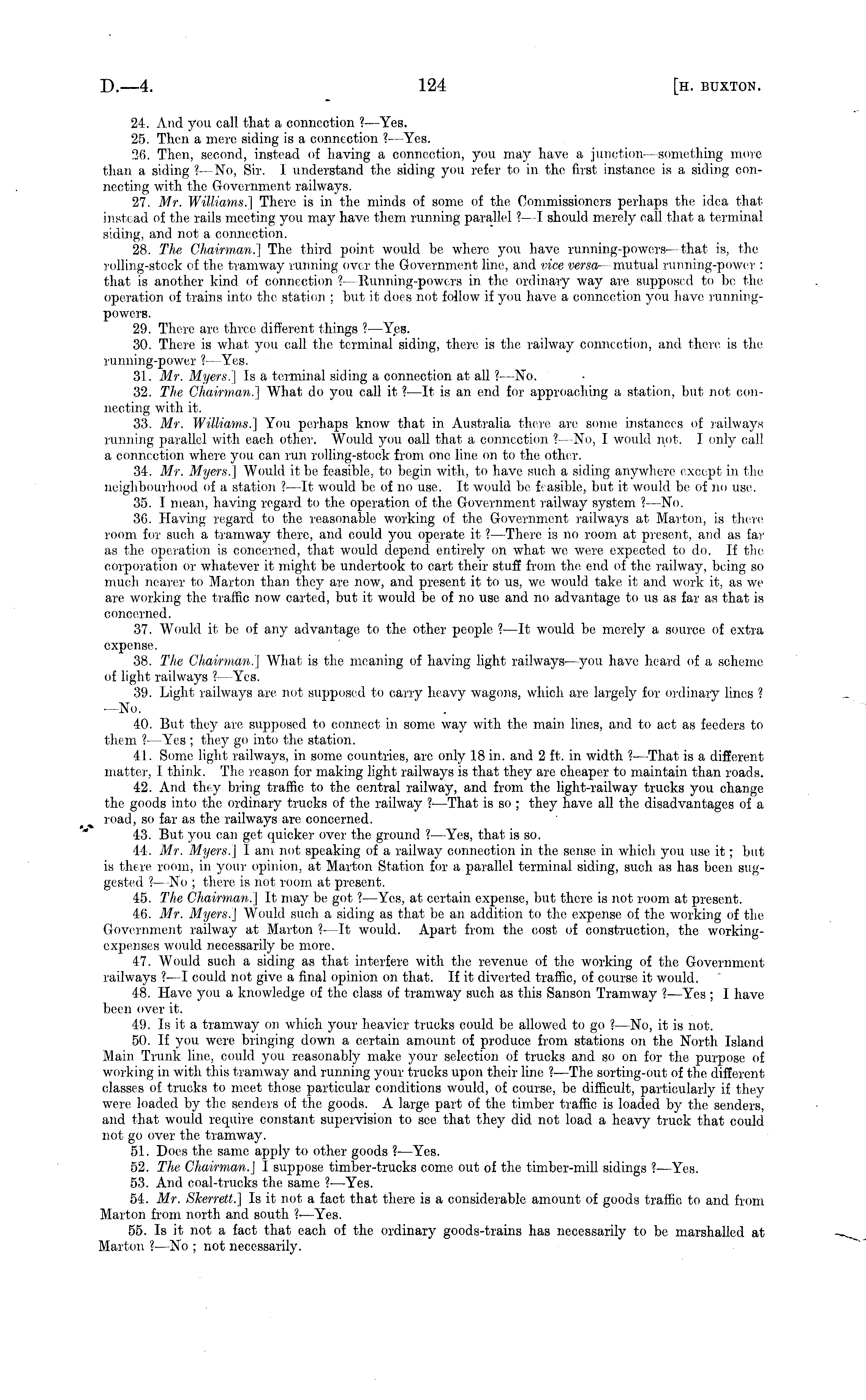 24. And you call that a connection ?—Yes. 25. Then a mere siding is a connection ? —Yes. 26. Then, second, instead of having a connection, you may have a junction —something more than a siding ? —No, Sir. 1 understand the siding you refer to in the first instance is a siding connecting with the Government railways. 27. Mr. Williams.] There is in the minds of some of the Commissioners perhaps the idea that instead of the rails meeting you may have them running parallel ? —I should merely call that a terminal siding, and not a connection. 28. The Chairman.] The third point would be where you have running-powers—that is, the rolling-stock of the tramway running over the Government line, and vice versa —mutual running-power : that is another kind of connection ?—Running-powers in the ordinary way are supposed to be the operation of trains into the station ; but it does not follow if you have a connection you have ranningpowere. 29. There are three different things ? —Yes. 30. There is what you call the terminal siding, there is the railway connection, and there is the running-power ? —Yes. 31. Mr. Myers.] Is a terminal siding a connection at all ?- - No. 32. The Chairman.] What do you call it ? —lt is an end for approaching a station, but not connecting with it. 33. Mr. Williams.] You perhaps know that in Australia there are some instances of railways running parallel with each other. Would you oall that a connection ?- No, I would not. 1 only call a connection where you can run rolling-stock from one line on to the other. 34. Mr. Myers.] Would it be feasible, to begin with, to have such a siding anywhere except in the neighbourhood of a station ?—lt would be of no use. It would be feasible, but it would be of no use. 35. I mean, having regard to the operation of the Government railway system ?—No. 3G. Having regard to the reasonable working of the Government railways at Marton, is there room for such a tramway there, and could you operate it ? —There is no room at present, and as far as the operation is concerned, that would depend entirely on what we were expected to do. If the corporation or whatever it might be undertook to cart their stuff from the end of the railway, being so much nearer to Marton than they are now, and present it to us, we would take it and work it, as we are working the traffic now carted, but it would be of no use and no advantage to us as far as that is concerned. 37. Would it be of any advantage to the other people ? —lt would be merely a source of extra expense. 38. The Chairman.] What is the meaning of having light railways- you have heard of a scheme of light railways ? —Yes. 39. Light railways are not supposed to cany heavy wagons, which are largely for ordinary linos ? —No. 40. But they are supposed to connect in some way with the main lines, and to act as feeders to them ? —Yes ; they go into the station. 41. Some light railways, in some countries, arc only 18 in. and 2 ft. in width ? —That is a different matter, I think. The reason for making light railways is that they are cheaper to maintain than roads. 42. And they bring traffic to the central railway, and from the light-railway trucks you change the goods into the ordinary trucks of the railway V —That is so ; they have all the disadvantages of a road, so far as the railways are concerned. 43. But you can get quicker over the ground ? —Yes, that is so. 44. Mr. Myers.] lam not speaking of a railway connection in the sense in which you use it; but is there room, in your opinion, at Marton Station for a parallel terminal siding, such as has been suggested ? —No ; there is not room at present. 45. The Chairman.] It may be got ?—Yes, at certain expense, but there is not room at present. 46. Mr. Myers.] Would such a siding as that be an addition to the expense of the working of the Government railway at Marton ? —lt would. Apart from the cost of construction, the workingexpenses would necessarily be more. 47. Would such a siding as that interfere with the revenue of the working of the Government railways ?■ —I could not give a final opinion on that. If it diverted traffic, of course it would. 48. Have you a knowledge of the class of tramway such as this Sanson Tramway ? —Yes ; I have been over it. 49. Is it a tramway on which your heavier trucks could be allowed to go ? —No, it is not. 50. If you were bringing down a certain amount of produce from stations on the North Island Main Trunk line, could you reasonably make your selection of trucks and so on for the purpose of working in with this tramway and running your trucks upon their line % —The sorting-out of the different classes of trucks to meet those particular conditions would, of course, be difficult, particularly if they were loaded by the senders of the goods. A large part of the timber traffic is loaded by the senders, and that would require constant supervision to see that they did not load a heavy truck that could not go over the tramway. 51. Does the same apply to other goods ? —Yes. 52. The Chairman.] I suppose timber-trucks come out of the timber-mill sidings ?—Yes. 53. And coal-trucks the same ?■—Yes. 54. Mr. Skerrett.] Is it not a fact that there is a considerable amount of goods traffic to and from Marton from north and south ?• —Yes. 55. Is it not a fact that each of the ordinary goods-trains has necessarily to be marshalled at Marton ? —No ; not necessarily.