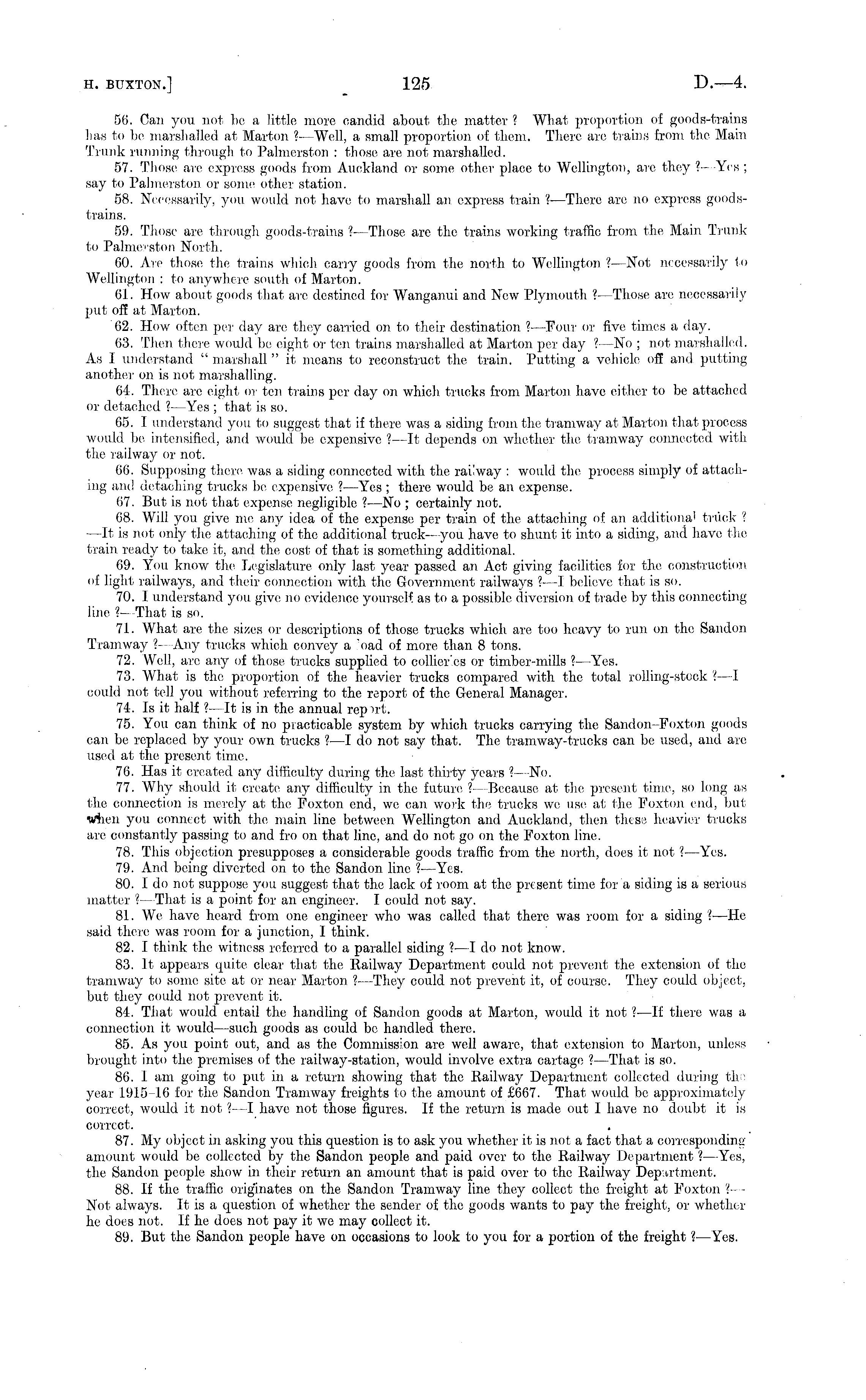 56. Can you not be a little more candid about the matter ? What proportion of goods-trains has to be marshalled at Marton ? —Well, a small proportion of them. Tlierc are trains from the Main Trunk running through to Palmcrston : those are not marshalled. 57. Those are express goods from Auckland or some other place to Wellington, are they ?—Yes ; say to Palmerston or some other station. 58. Necessarily, you would not have to marshall an express train % —There are no express goodetrains. 59. Those are through goods-trains ? —Those are the trains working traffic from the Main Trunk to Palmerston North. 60. Are those the trains which carry goods from the north to Wellington ? —Not necessarily to Wellington : to anywhere south of Marton. 61. How about goods that are destined for Wanganui and New Plymouth ? —Those are necessarily put off at Marton. 62. How often per day are they carried on to their destination ?—Four or five times a day. 63. Then there would be eight or ten trains marshalled at Marton per day ?—No ; not marshalled. As I understand " marshall " it means to reconstruct the train. Putting a vehicle off and putting another on is not marshalling. 64. There are eight or ten trains per day on which trucks from Marton have either to be attached or detached ? —Yes ; that is so. 65. I understand you to suggest that if there was a siding from the tramway at Marton that process would be intensified, and would be expensive ? —lt depends on whether the tramway connected with the railway or not. 66. Supposing there was a siding connected with the railway : would the process simply of attaching and detaching trucks be expensive ? —Yes ; there would be an expense. 67. But is not that expense negligible ?—No ; certainly not. 68. Will you give me any idea of the expense per train of the attaching of an additional truck 1 —It is not only the attaching of the additional truek —you have to shunt it into a siding, and have the train ready to take it, and the cost of that is something additional. 69. You know the Legislature only last year passed an Act giving facilities for the construction of light railways, and their connection with the Government railways ?—I believe that is s< >. 70. I understand you give no evidence yourself as to a possible diversion of trade by this connecting line ?—That is so. 71. What are the sizes or descriptions of those trucks which, are too heavy to run on the Sandon Tramway ?— Any trucks which convey a "oad of more than 8 tons. 72. Weill, arc any of those trucks supplied to collieries or timber-mills ?■ —Yes. 73. What is the proportion of the heavier trucks compared with the total rolling-stock ? —I could not tell you without referring to the report of the General Manager. 74. Is it half ?—lt is in the annual repirt. 75. You can think of no practicable system by which trucks carrying the Sandon-Foxton goods can be replaced by your own trucks ?—I do not say that. The tramway-trucks can be used, and are used at the present time. 76. Has it created any difficulty during the last thirty years ?—No. 77. Why should it create any difficulty in the future ? —Because at the present time, so long as the connection is merely at the Foxton end, we can work the trucks we use at the Foxton end, but When you connect with the main line between Wellington and Auckland, then these heavier trucks are constantly passing to and fro on that line, and do not go on the Foxton line. 78. This objection presupposes a considerable goods traffic from the north, does it not ?—Yes. 79. And being diverted on to the Sandon line ? —Yes. 80. I do not suppose you suggest that the lack of room at the present time for a siding is a serious matter ? —That is a point for an engineer. 1 could not say. 81. We have heard from one engineer who was (tailed that there was room for a siding ? —He said there was room for a junction, I think. 82. I think the witness referred to a parallel siding ?— I do not know. 83. It appears quite clear that the Railway Department could not prevent the extension of the tramway to some site at or near Marton ?— They could not prevent it, of course. They could object, but they could not prevent it. 84. That would entail the handling of Sandon goods at Marton, would it not ? —lf there was a connection it would—such goods as could be handled there. 85. As you point out, and as the Commission are well aware, that extension to Marton, unless brought into the premises of the railway-station, would involve extra cartage ?—That is so. 86. I am going to put in a return showing that the Railway Department collected during thr: year 1915-16 for the Sandon Tramway freights to the amount of £667. That would be approximately correct, would it not ? —I have not those figures. If the return is made out 1 have no doubt it is. correct. 87. My object in asking you this question is to ask you whether it is not a fact that a corresponding amount would be collected by the Sandon people and paid over to the Railway Department ? —Yes, the Sandon people show in their return an amount that is paid over to the Railway Department. 88. If the traffic originates on the Sandon Tramway line they collect the freight at Foxton ?— Not always. It is a question of whether the sender of the goods wants to pay the freight, or whether he does not. If he does not pay it we may collect it. 89. But the Sandon people have on occasions to look to you for a portion of the freight '{ —Yes.