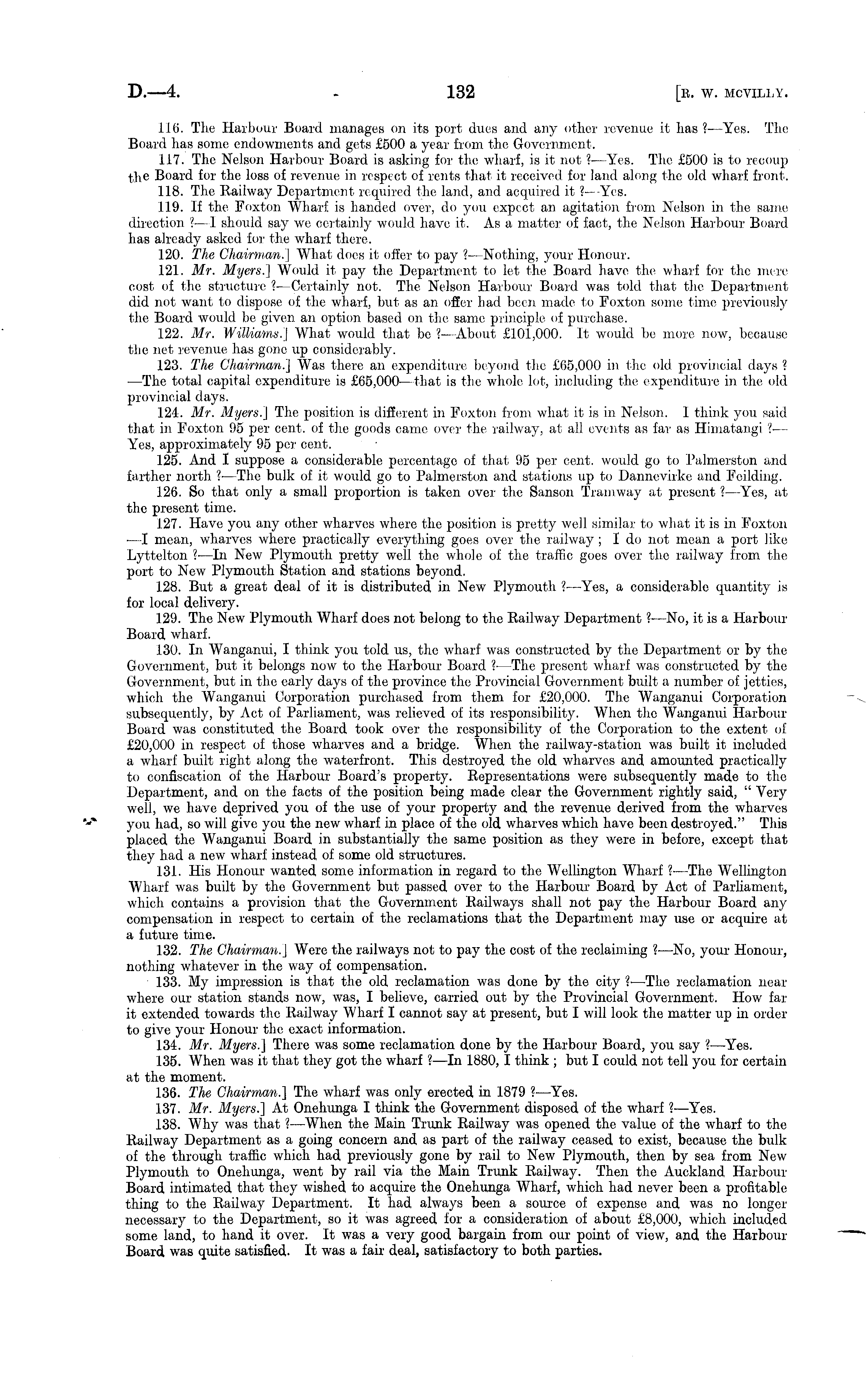 116. The Harbour Board manages on its port dues and any other revenue it has ?—Yes. The Board has some endowments and gets £500 a year from the Government. 117. The Nelson Harbour Board is asking for the wharf, is it not ?—Yes. The £500 is to recoup the Board for the loss of revenue in respect of rents that it received for land along the old wharf front. 118. The Eailway Department required the land, and acquired it ? —Yes. 119. If the Foxton "Wharf is handed over, do you expect an agitation from. Nelson in the same direction ?• —1 should say we certainly would have it. As a matter of fact, the Nelson Harbour Board has already asked for the wharf there. 120. The Chairman.] What does it offer to pay I—Nothing,1—Nothing, your Honour. 121. Mr. Myers.} Would it pay the Department to let the Board have the wharf for the mere cost of the structure ?—Certainly not. The Nelson Harbour , Board was told that the Department did not want to dispose of the wharf, but as an offer had been made to Foxton some time previously the Board would be given an option based on the same principle of purchase. 122. Mr. Williams.] What would that be ?—About £101,000. It would be more now, because the net revenue has gone up considerably. 123. The Chairman.] Was there an expenditure beyond the £65,000 in the old provincial days ? —The total capital expenditure is £65,000 —that is the whole lot, including the expenditure in the old provincial days. 124. Mr. Myers.] The position is different in Foxton from what it is in Nelson. 1 think you said that in Foxton 95 per cent, of the goods came over the railway, at all events as far as Himatangi ?■— Yes, approximately 95 per cent. 125. And I suppose a considerable percentage of that 95 per cent, would go to Palmerston and farther north ?■ —The bulk of it would go to Palmerston and stations up to Dannevirke and Feilding. 126. So that only a small proportion is taken over the Sanson Tramway at present ?—Yes, at the present time. 127. Have you any other wharves where the position is pretty well similar to what it is in Foxton ■ —I mean, wharves where practically everything goes over the railway ;I do not mean a port like Lyttelton ?• —In New Plymouth pretty well the whole of the traffic goes over the railway from the port to New Plymouth Station and stations beyond. 128. But a great deal of it is distributed in New Plymouth ? —Yes, a considerable quantity is for local delivery. 129. The New Plymouth Wharf does not belong to the Eailway Department ?■ —No, it is a Harbour Board wharf. 130. In Wanganui, I think you told us, the wharf was constructed by the Department or by the Government, but it belongs now to the Harbour Board ?■ —The present wharf was constructed by the Government, but in the early days of the province the Provincial Government built a number of jetties, which the Wanganui Corporation purchased from them for £20,000. The Wanganui Corporation subsequently, by Act of Parliament, was relieved of its responsibility. When the Wanganui Harbour Board was constituted the Board took over the responsibility of the Corporation to the extent of £20,000 in respect of those wharves and a bridge. When the railway-station was built it included a wharf built right along the waterfront. This destroyed the old wharves and amounted practically to confiscation of the Harbour Board's property. Representations were subsequently made to the Department, and on the facts of the position being made clear the Government rightly said, " Very well, we have deprived you of the use of your property and the revenue derived from the wharves you had, so will give you the new wharf in place of the oid wharves which have been destroyed." This placed the Wanganui Board in substantially the same position as they were in before, except that they had a new wharf instead of some old structures. 131. His Honour wanted some information in regard to the Wellington Wharf ?■—The Wellington Wharf was built by the Government but passed over to the Harbour Board by Act of Parliament, which contains a provision that the Government Railways shall not pay the Harbour Board any compensation in respect to certain of the reclamations that the Department may use or acquire at a future time. 132. The Chairman.] Were the railways not to pay the cost of the reclaiming ?■—No, your Honour, nothing whatever in the way of compensation. 133. My impression is that the old reclamation was done by the city ?• —The reclamation near where our station stands now, was, I believe, carried out by the Provincial Government. How far it extended towards the Eailway Wharf I cannot say at present, but I will look the matter up in order to give your Honour the exact information. 134. Mr. Myers.] There was some reclamation done by the Harbour Board, you say ?• —Yes. 135. When was it that they got the wharf ? —ln 1880, I think ; but I could not tell you for certain at the moment. 136. The Chairman.] The wharf was only erected in 1879 ? —Yes. 137. Mr. Myers.] At Onehunga I think the Government disposed of the wharf ?—Yes. 138. Why was that ?—When the Main Trunk Railway was opened the value of the wharf to the Eailway Department as a going concern and as part of the railway ceased to exist, because the bulk of the through traffic which had previously gone by rail to New Plymouth, then by sea from New Plymouth to Onehunga, went by rail via the Main Trunk Eailway. Then the Auckland Harbour Board intimated that they wished to acquire the Onehunga Wharf, which had never been a profitable thing to the Eailway Department. It had always been a source of expense and was no longer necessary to the Department, so it was agreed for a consideration of about £8,000, which included some land, to hand it over. It was a very good bargain from our point of view, and the Harbour Board was quite satisfied. It was a fair deal, satisfactory to both parties.