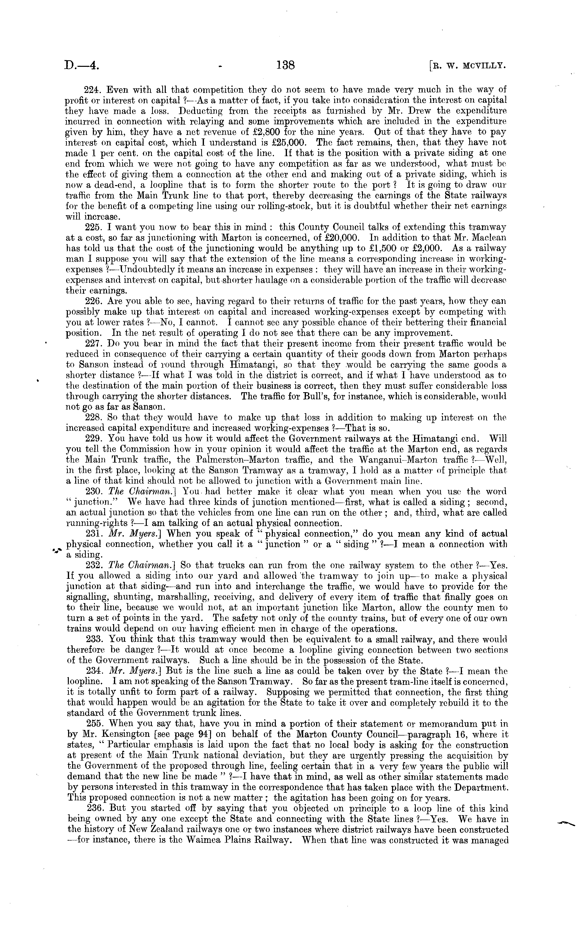 224. Even with all that competition they do not seem to have made very much in the way of profit or interest on capital ?•—As a matter of fact, if you take into consideration the interest on capital they have made a loss. Deducting from the receipts as furnished by Mr. Drew the expenditure incurred in connection with relaying and some improvements which are included in the expenditure given by him, they have a net revenue of £2,800 for the nine years. Out of that they have to pay interest on capital cost, which I understand is £25,000. The fact remains, then, that they have not made 1 per cent, on the capital cost of the line. If that is the position with a private siding at one end from which we were not going to have any competition as far as we understood, what must be the effect of giving them a connection at the other end and making out of a private siding, which is now a dead-end, a loopline that is to form the shorter route to the port ? It is going to draw our traffic from the Main Trunk line to that port, thereby decreasing the earnings of the State railways for the benefit of a competing line using our rolling-stock, but it is doubtful whether their net earnings will increase. 225. I want you now to bear this in mind : this County Council talks of extending this tramway at a cost, so far as junetioning with Marton is concerned, of £20,000. In addition to that Mr. Maclean has told us that the cost of the junetioning would be anything up to £1,500 or £2,000. As a railway man I suppose you will say that the extension of the line means a corresponding increase in workingexpenses '( —Undoubtedly it means an increase in expenses : they will have an increase in their workingexpenses and interest on capital, but shorter haulage on a considerable portion of the traffic will decrease their earnings. 226. Are you able to sec, having regard to their returns of traffic for the past years, how they can possibly make up that interest on capital and increased working-expenses except by competing with you at lower rates ? —No, I cannot. I cannot see any possible chance of their bettering their financial position. In the net result of operating Ido not see that there can be any improvement. 227. Do you bear in mind the fact that their present income from their present traffic would be reduced in consequence of their carrying a certain quantity of their goods down from Marton perhaps to Sanson instead of round through Himatangi, so that they would be carrying the same goods a shorter distance % —lf what I was told in the district is correct, and if what I have understood as to the destination of the main portion of their business is correct, then they must suffer considerable loss through, carrying the shorter distances. The traffic for Bull's, for instance, which is considerable, would not go as far as Sanson. 228. So that they would have to make up that loss in addition to making up interest on the increased capital expenditure and increased working-expenses ? —That is so. 229. You have told us how it would affect the Government railways at the Himatangi end. Will you tell the Commission how in your opinion it would affect the traffic at the Marton end, as regards the Main Trunk traffic, the Palmerston-Marton traffic, and the Wanganui-Marton traffic ?- Well, in the first place, looking at the Sanson Tramway as a tramway, I hold as a matter of principle that a line of that kind should not be allowed to junction with a Government main line. 230. The Chairman.'] You, had better make it clear what you mean when you use the word " junction." We have had three kinds of junction mentioned—first, what is called a siding ; second, an actual junction so that the vehicles from one line can run on the other ; and, third, what are called running-rights ?—I am talking of an actual physical connection. 231. Mr. Myers.] When you speak of "physical connection," do you mean any kind of actual ,» physical connection, whether you call it a " junction "or a " siding " ?—I mean a connection with a siding. 232. The Chairman.] So that trucks can run from the one railway system to the other ?■—Yes. If. you allowed a siding into our yard and allowed the tramway to join up- to make a physical junction at that siding—and run into and interchange the traffic, we would have to provide for the signalling, shunting, marshalling, receiving, and delivery of every item of traffic that finally goes on to their line, because we would not, at an important junction like Marton, allow the county men. to turn a set of points in the yard. The safety not only of the county trains, but of every one of our own trains would depend on our having efficient men in charge of the operations. 233. You think that this tramway would then be equivalent to a small railway, and there would therefore be danger ?—lt would at once become a loopline giving connection between two sections of the Government railways. Such a line should be in the possession of the State. 234. Mr. Myers.] But is the line such a line as could be taken over by the State ?• —I mean the loopline. lam not speaking of the Sanson Tramway. So far as the present tram-line itself is concerned, it is totally unfit to form part of a railway. Supposing we permitted that connection, the first thing that would happen would be an agitation for the State to take it over and completely rebuild it to the standard of the Government trunk lines. 255. When you say that, have you in mind a portion of their statement or memorandum put in by Mr. Kensington [see page 94] on behalf of the Marton County Council—paragraph 16, where it states, " Particular emphasis is laid upon the fact that no local body is asking for the construction at present of the Main Trunk national deviation, but they are urgently pressing the acquisition by the Government of the proposed through line, feeling certain that in a very few years the public will demand that the new line be made "