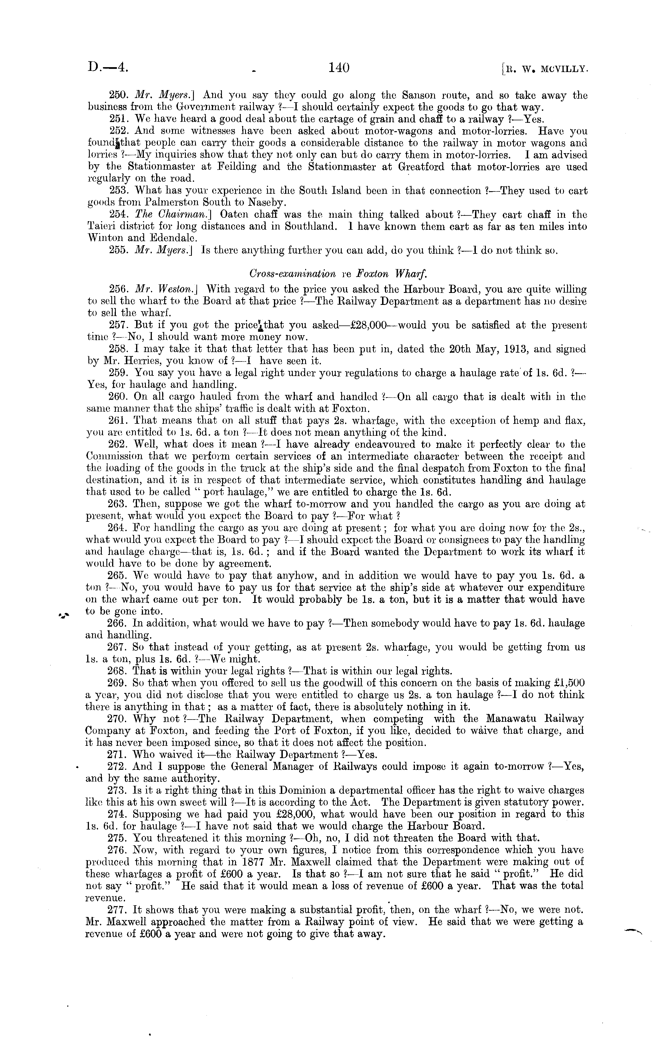 D.—4. 250. Mr. Myers.] And you say they could go along the Sanson route, and so take away the business from the Government railway ? —I should certainly expect the goods to go that way. 251. We have heard a good deal about the cartage of grain and chaff to a railway ? —Yes. 252. And some witnesses have been asked about motor-wagons and motor-lorries. Have you found|that people can carry their goods a considerable distance to the railway in motor wagons and lorries ?—My inquiries show that they not only can but do carry them in motor-lorries. lam advised by the Stationmaster at Feilding and the Stationmaster at Greatford that motor-lorries arc used regularly on the road. 253. What has your experience in the South Island been in that connection ?—They used to cart goods from Palmcrston South to Naseby. 254. The Chairman.] Oaten chaff was the main thing talked about ? —They cart chaff in the Taieri district for long distances and in Southland. I have known them cart as far as ten miles into Winton and Bdendalc. 255. Mr. Myers.] Is there anything further you can add, do you think ?■—l do not think so. Cross-examination re Foxton Wharf. 256. Mr. Weston.] With regard to the price you asked the Harbour Board, you are quite willing to sell the wharf to the Board at that price ? —The Railway Department as a department has no desire to sell the wharf. 257. But if you got the you asked —£28,000—would you be satisfied at the present time ?■ —No, I should want more money now. 258. I may take it that that letter that has been put in, dated the 20th May, 1913, and signed by Mr. Herries, you know of ?■ —I have seen it. 259. You say you have a legal right under your regulations to charge a haulage rate of Is. 6d. ?— Yes, for haulage and handling. 260. On all cargo hauled from the wharf and handled ? —On all cargo that is dealt with in the same manner that the ships' traffic is dealt with at Foxton. 261. That means that on all stuff that pays 2s. wharfage, with the exception of hemp and flax, you are entitled to Is. 6d. a ton ? —lt does not mean anything of the kind. 262. Well, what does it mean ?—I have already endeavoured to make it perfectly clear to the Commission that we perform certain services of an intermediate character between the receipt and the loading of the goods in the truck at the ship's side and the final despatch from Foxton to the final destination, and it is in respect of that intermediate service, which constitutes handling and haulage that used to be called " port haulage," we are entitled to charge the Is. 6d. 263. Then, suppose we got the wharf to-morrow and you handled the cargo as you arc doing at present, what would you expect the Board to pay ? —For what ? 264. For handling the cargo as you arc doing at present; for what you are doing now for the 25., what would you expect the Board to pay ? —I should expect the, Board or consignees to pay the handling and haulage charge—that is, Is. 6d. ; and if the Board wanted the Department to work its wharf it would have to be done by agreement. 265. We would have to pay that anyhow, and in. addition we would have to pay you Is. 6d. a ton ?■ —No, you would have to pay us for that service; at the ship's side at whatever our expenditure on the wharf came out per ton. It would probably be Is. a ton, but it is a matter that would have , , to be gone into. 266. In addition, what would we have to pay ? —Then somebody would have to pay Is. 6d. haulage and handling. 267. So that instead of your getting, as at present 2s. wharfage, you would be getting from us Is. a ton, plus Is. 6d. ?—We might. 268. That is within your legal rights ?— That is within our legal rights. 269. So that when you offered to sell us the goodwill of this concern on the basis of making £1,500 a year, you did not disclose that you were entitled to charge us 2s. a ton haulage ?• —I do not think there is anything in that; as a matter of fact, there is absolutely nothing in it. 270. Why not ? —The Railway Department, when competing with the Manawatu Railway Company at Foxton, and feeding the Port of Foxton, if you like, decided to waive that charge, and it has never been imposed since, so that it does not affect the position. 271. Who waived it —the Railway Department ? —Yes. • 272. And 1 suppose the General Manager of Railways could impose it again to-morrow ?■—Yes, and by the same authority. 273. Is it a right thing that in this Dominion a departmental officer has the right to waive charges like this at his own sweet will ? —lt is according to the Act. The Department is given statutory power. 274. Supposing we had paid you £28,000, what would have been our position in regard to this Is. 6d. for haulage ?■—l have not said that we would charge the Harbour Board. 275. You threatened it this morning I —Oh, no, 1 did not threaten the Board with that. 276. Now, with regard to your own figures, I notice from this correspondence which you have produced this morning that in 1877 Mr. Maxwell claimed that the Department were making out of these wharfages a profit of £600 a year. Is that so ? —I am not sure that he said " profit." He did not say " profit." He said that it would mean a loss of revenue of £600 a year. That was the total revenue. 277. It shows that you were making a substantial profit, then, on the wharf ?—No, we were not. Mr. Maxwell approached the matter from a Railway point of view. He said that we were getting a revenue of £600 a year and were not going to give that away.