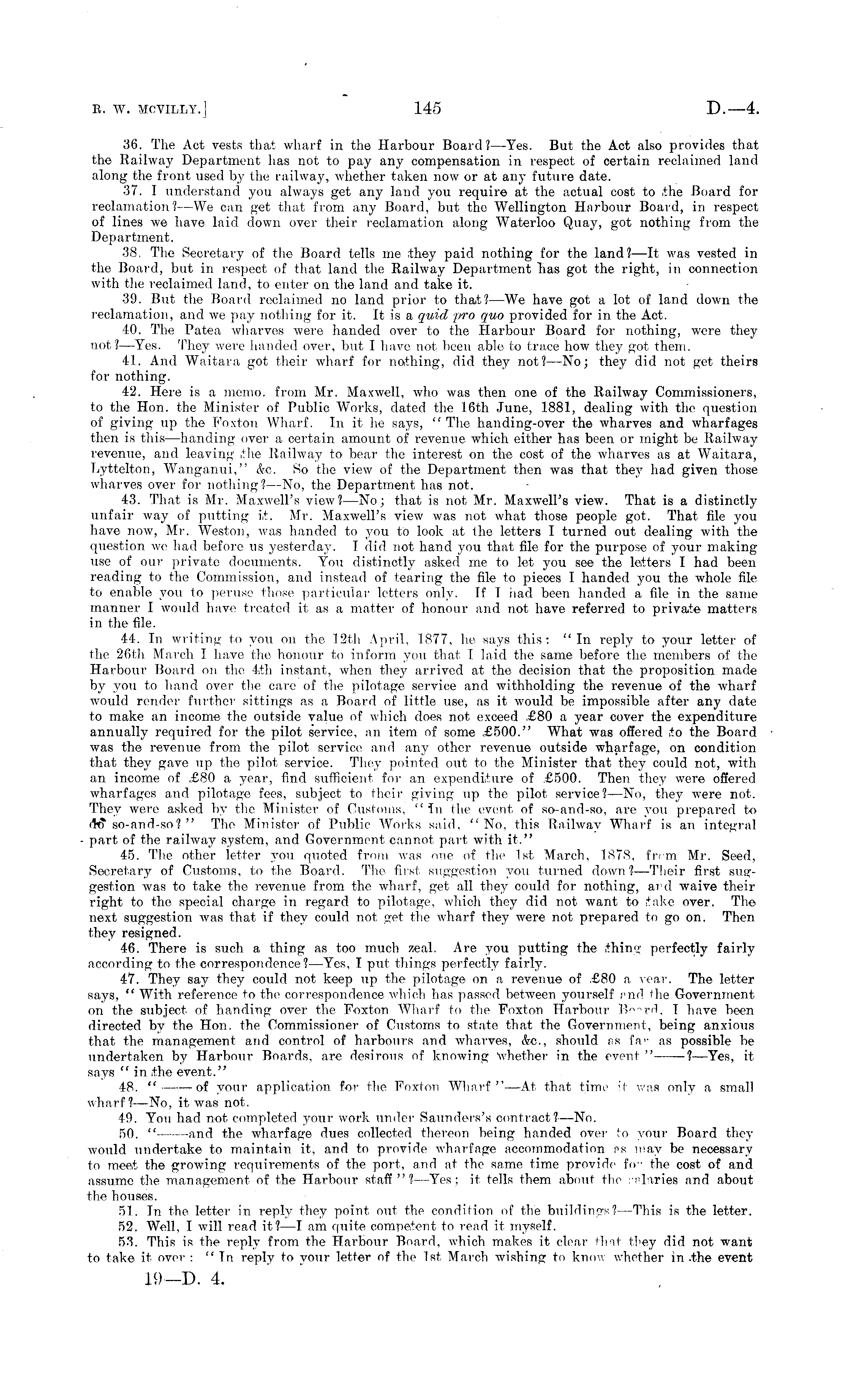 36. The Act vests tha,t wharf in the Harbour Board? —Yes. But the Act also provides that the Railway Department has not to pay any compensation in respect of certain reclaimed land along the front used by the railway, whether taken now or at any future date. 37. I understand you always get any land you require at the actual cost to the Board for reclamation?—We can get that from any Board, but the Wellington Harbour Board, in respect of lines we have laid down over their reclamation along Waterloo Quay, got nothing from the Department. 38. The Secretary of the Board tells me .they paid nothing for the land? —It was vested in the Board, but in respect of that land the Railway Department "has got the right, in connection with the reclaimed land, to enter on the land and take it. 39. But the Board reclaimed no land prior to that? —We have got a lot of land down the reclamation, and we pay nothing for it. It is a quid f/ro quo provided for in the Act. 40. The Patea wharves were handed over to the Harbour Board for nothing, were they not?— Yes. They were handed over, but I have not been able to trace how they got them. 41. And Waitara got their wharf for nothing, did they not? —No; they did not got theirs for nothing. 42. Here is a memo, from Mr. Maxwell, who was then one of the Railway Commissioners, to the Hon. the Minister of Public Works, dated the 16th June, 1881, dealing with the question of giving up the Foxton Wharf. In it he says, " The handing-over the wharves and wharfages then is this —handing over a certain amount of revenue which either has been or might be Railway revenue, and leaving ,ihe Railway to bear the interest on the cost of the wharves as at Waitara, Lyttelton, Wanganui," <fee. So the view of the Department then was that they had given those wharves over for nothing?—No, the Department has not. 43. That is Mr. Maxwell's view?—No; that is not Mr. Maxwell's view. That is a distinctly unfair way of putting it. Mr. Maxwell's view was not what those people got. That file you have now, Mr. Weston, was handed to you to look at the letters I turned out dealing with the question wo had before us yesterday. T did not hand you that file for the purpose of your making use of our private documents. You distinctly asked me to let you see the letters I had been reading to the Commission, and instead of tearing the file to pieces I handed you the whole file to enable you to peruse those particular letters only. If I had been handed a file in the same manner I would have treated it as a matter of honour and not have referred to private matters in the file. 44. In writing to you on the 12th April, 1877, he says this: "In reply to your letter of the 26th March I have the honour to inform you that I laid the same before the members of the Harbour Board on the 4th instant, when they arrived at the decision that the proposition made by you to hand over the care of the pilotage service and withholding the revenue of the wharf would render further sittings as a Board of little use, as it would be impossible after any date to make an income the outside value of which does not exceed £80 a year cover the expenditure annually required for the pilot service, an item of some £500." What was offered ,to the Board was the revenue from the pilot service and any other revenue outside wharfage, on condition that they gave up the pilot service. They pointed out to the Minister that they could not, with an income of ,£BO a year, find sufficient for an expenditure of £500. Then they were offered wharfages and pilotage fees, subject to their giving up the pilot service? —No, they were not. They were asked by the Minister of Customs, " Tn (lie event of so-and-so, are you prepared to (W so-and-so? " The Minister of Public Works said, "No, this Railway Wharf is an integral part of the railway system, and Government cannot part with it." 45. The other letter you quoted from was one of the Ist. March, 1878, Civm Mr. Seed, Secretary of Customs, to the Board. The first suggestion you turned down?— Their first suggestion was to take the revenue from the wharf, get all they could for nothing, aid waive their right to the special charge in regard to pilotage, which they did not want to itake over. The next suggestion was that if they could not get the wharf they were not prepared to go on. Then they resigned. 46. There is such a thing as too much zeal. Are you putting the ithing perfectly fairly according to the correspondence? —Yes, I put tilings perfectly fairly. 47. They say they could not keep up the pilotage on a revenue of ,£BO a year. The letter says, " With reference to the correspondence which has passed between yourself m<l the Government on the subject, of handing over the Foxton Wharf h> the Foxton Harbour Bo~rd, I have been directed by the Hon. the Commissioner of Customs to state that the Government, being anxious that the management and control of harbours and wharves, &c., should as fa ,, us possible be undertaken by Harbour Boards, are desirous of knowing whether in the event " — ? —Yes, it says " in .the event." 48. ' —of your application for the Foxton Wharf" —At that time ■'( \v:ta only a small wharf?—No, it was not. 49. You had not completed your work under Saunders's contract? —No. 50. ' —and the wharfage dues collected thereon being handed over to your Board they would undertake to maintain it, and to provide wharfage accommodation ps may be necessary to meet the growing requirements of the port, and at the same time provide fo™ the cost of and assume the management of the Harbour staff"? —Yes; it tells them about the salaries and about the houses. 51. In the letter in reply they point out the condition of the buildinpv,?-—This is the letter. 52. Well, I will read it?—l am quite competent to read it myself. 53. This is the reply from the Harbour Board, which makes it clear thnt they did not want to take it over : "Tn reply to your letter of 