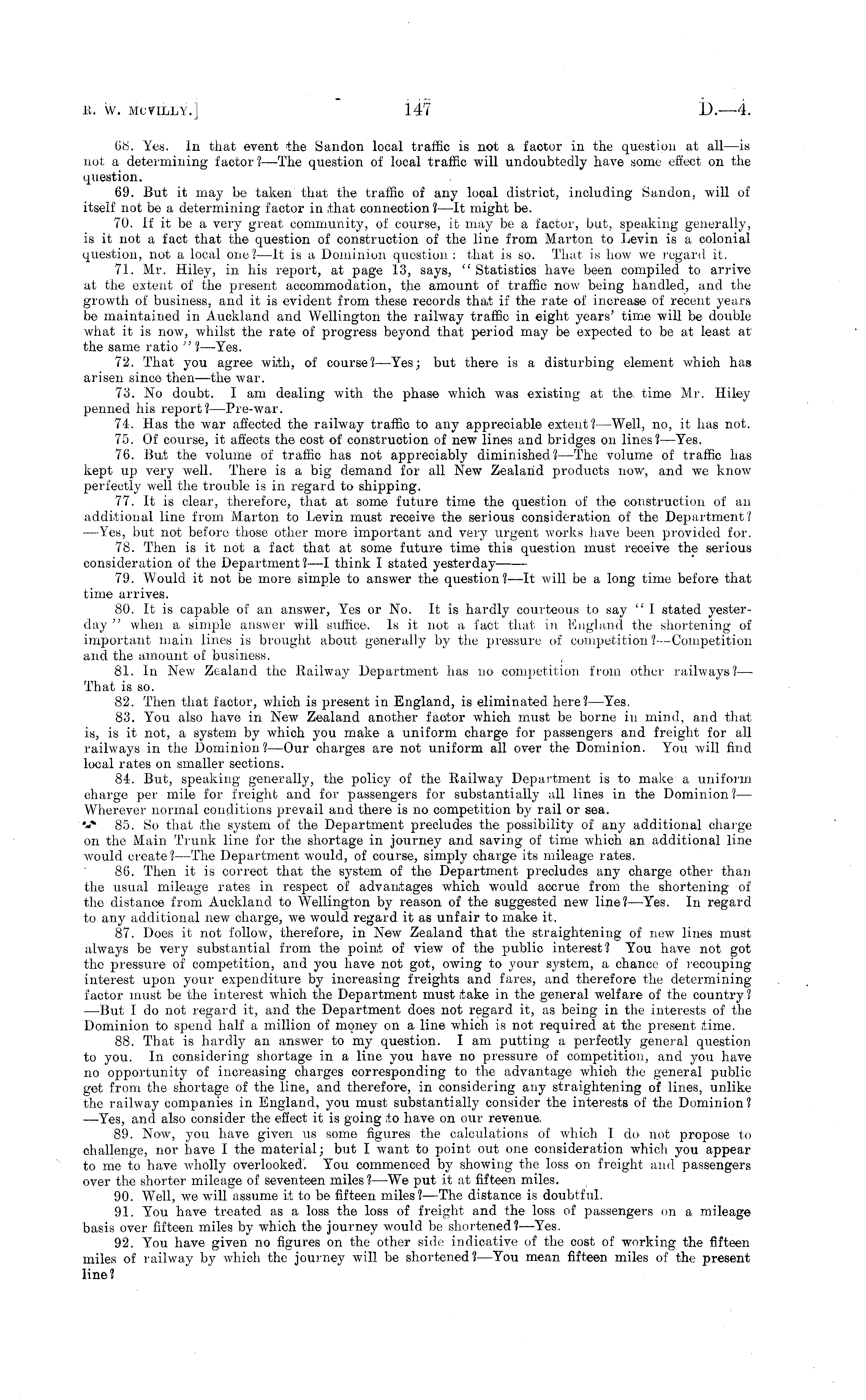 GB. Yes. In that event the Sandon local traffic is not a factor in the question at all—is not a determining factor ? —The question of local traffic will undoubtedly have some elect on the question. 69. But it may be taken that the traffic of any local district, including Sandon, will of itself not be a determining factor in that connection ? —lt might be. 70. If it be a very great community, of course, it may be a factor, but, speaking generally, is it not a fact that the question of construction of the line from Marton to Levin is a colonial question, not a local one?—lt is a Dominion question : that is so. That is how we regard it. 71. Mr. Hiley, in his report, at page 13, says, " Statistics have been compiled to arrive at the extent of the present accommodation, the amount of traffic now being handled, and the growth of business, and it is evident from these records that if the rate of increase of recent years be maintained in Auckland and Wellington the railway traffic in eight years' time will be double what it is now, whilst the rate of progress beyond that period may be expected to be at least at the same ratio " ?—Yes. 72. That you agree with, of course?— Yes; but there is a disturbing clement which has arisen since then—the war. 73. No doubt. I am dealing with the phase which was existing at the. time Mr. Hiley penned his report?— Pre-war. 74. Has the war affected the railway traffic to any appreciable extent? —Well, no, it has not. 75. Of course, it affects the cost of construction of new lines and bridges on lines? —Yes. 76. But the volume of traffic has not appreciably diminished?— The volume of traffic has kept up very well. There is a big demand for all New Zealand products now, and we know perfectly well the trouble is in regard to shipping. 77. It is clear, therefore, that at some future time the question of the construction of an additional line from Marton to Levin must receive the serious consideration of the Department 'I —Yes, but not before those other more important and very urgent works have been provided for. 78. Then is it not a fact that at some future time this question must receive the serious consideration of the Department ?—I think I stated yesterday 79. Would it not be more simple to answer the question? —It will be a long time before that time arrives. 80. It is capable of an answer, Yes or No. It is hardly courteous to say " I stated yesterday " when a simple answer will suffice. Is it not a fact that in England the shortening of important main lines is brought about generally by the pressure of competition '--Competition and the amount of business. 81. In New Zealand the Railway Department has no competition from other railways?— That is so. 82. Then that factor, which is present in England, is eliminated here? —Yes. 83. You also have in New Zealand another faotor which must be borne in mind, and that is, is it not, a system by which you make a uniform charge for passengers and freight for all railways in the Dominion?— Our charges are not uniform all over the Dominion. You will find local rates on smaller sections. 84. But, speaking generally, the policy of the Railway Department is to make a uniform charge per mile for freight and for passengers for substantially all lines in the Dominion?— Wherever normal conditions prevail and there is no competition by rail or sea. V 85. So that the system of the Department precludes the possibility of any additional charge on the Main Trunk line for the shortage in journey and saving of time which an additional line would ci'eate I—The1 —The Department would, of course, simply charge its mileage rates. 86. Then it is correct that the system of the Department precludes any charge other than the usual mileage rates in respect of advantages which would accrue from the shortening of the distance from Auckland to Wellington by reason of the suggested new line? —Yes. In regard to any additional new charge, we would regard it as unfair to make it. 87. Does it not follow, therefore, in New Zealand that the straightening of new lines must always be very substantial from the point of view of the public interest? You have not got the pressure of competition, and you have not got, owing to your system, a chance of recouping interest upon your expenditure by increasing freights and fares, and therefore the determining factor must be the interest which the Department must (take in the general welfare of the country? —But I do not regard it, and the Department does not regard it, as being in the interests of the Dominion to spend half a million of money on a line which is not required at the present itimc. 88. That is hardly an answer to my question. I am putting a perfectly general question to you. In considering shortage in a line you have no pressure of competition, and you have no opportunity of increasing charges corresponding to the advantage which the general public get from the shortage of the line, and therefore, in considering any straightening of lines, unlike the railway companies in England, you must substantially consider the interests of the Dominion? —Yes, and also consider the effect it is going to have on our revenue. 89. Now, you have given us some figures the calculations of which I do not propose to challenge, nor have I the material; but I want to point out one consideration which you appear to me to have wholly overlooked. You commenced by showing the loss on freight ant] passengers over the shorter mileage of seventeen miles ? —We put it at fifteen miles. 90. Well, we will assume it to be fifteen miles? —The distance is doubtful. 91. You have treated as a loss the loss of freight and the loss of passengers on a mileage basis over fifteen miles by which the journey would be shortened? —Yes. 92. You have given no figures on the other side indicative of the cost of working the fifteen miles of railway by which the journey will be shortened? —You mean fif