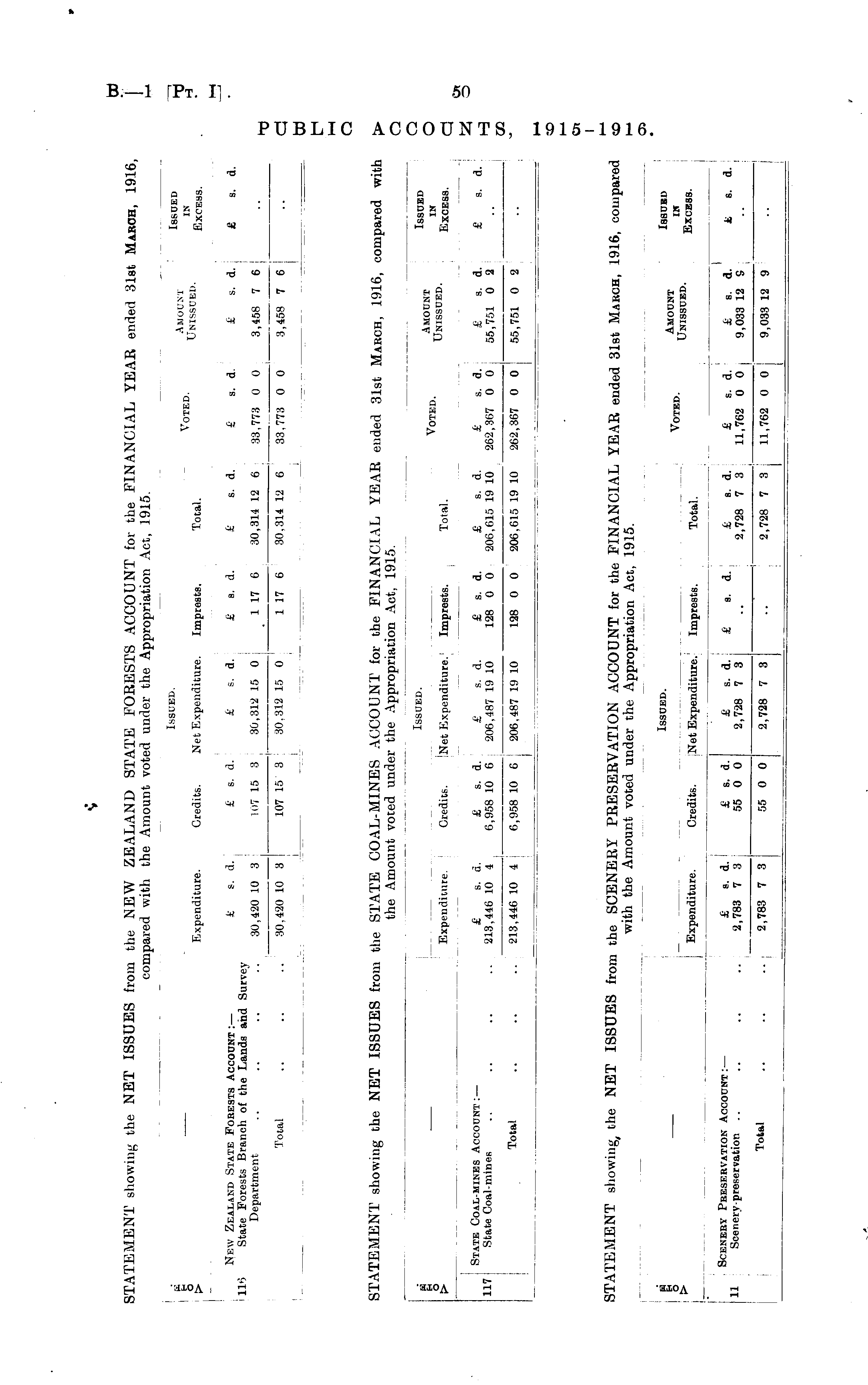 STATEMENT showing the NET ISSUES from the NEW ZEALAND STATE FORESTS ACCOUNT for the FINANCIAL YEAR ended 31st March, 1916, compared with the Amount voted under the Appropriation Act, 1915.