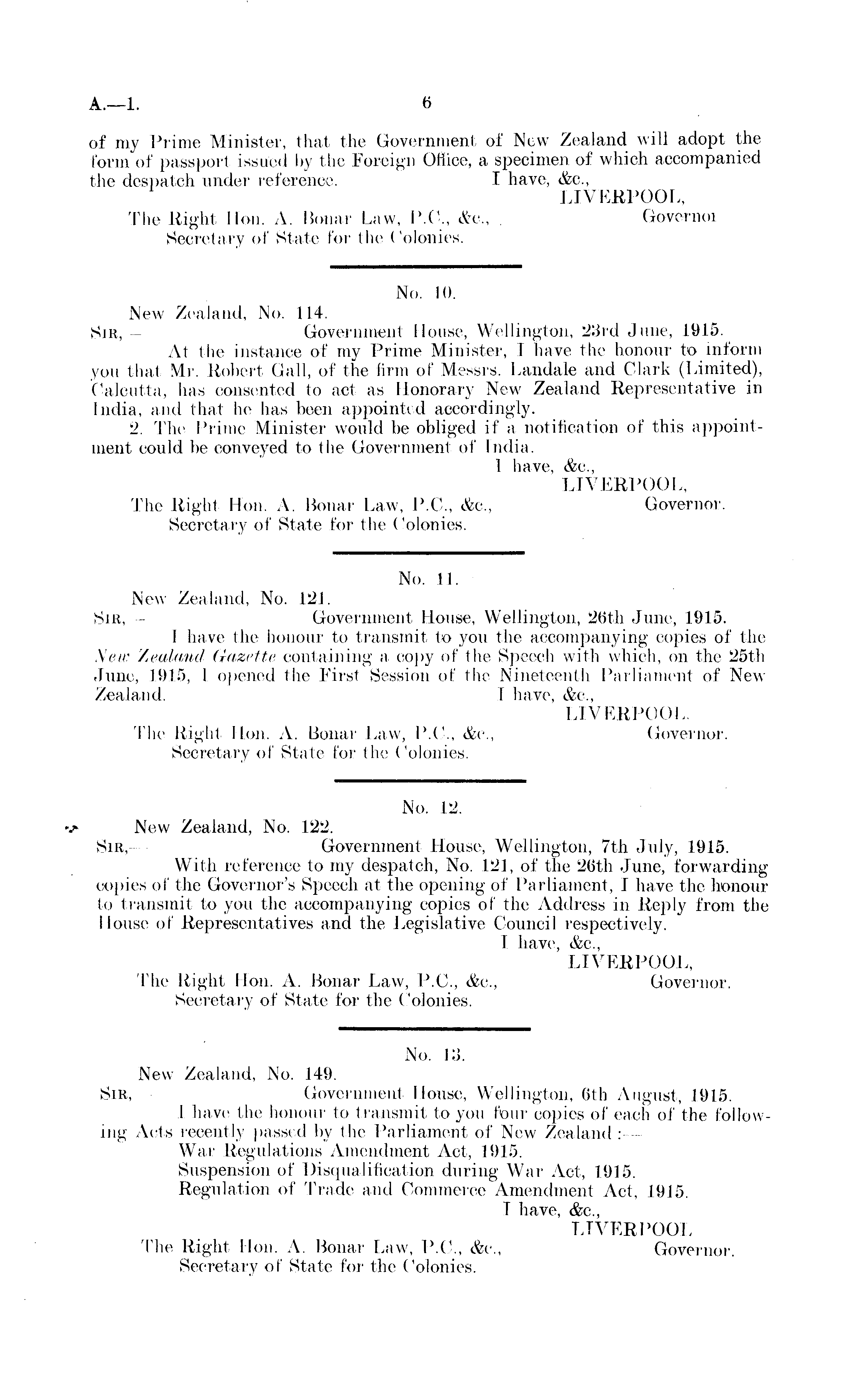 No. 13. New Zealand, No. 149. Sir,— Government House, Wellington, 6th August, 1915. I have the honour to transmit to you four copies of each of the following Acts recently passed by the Parliament of New Zealand :— War Regulations Amendment Act, 1915. Suspension of Disqualification during War Act, 1915. Regulation of Trade and Commerce Amendment Act, 1915. I have, &c, LIVERPOOL The Right Hon. A. Bonar Law, P.C., &c, Governor. Secretary of State for the Colonies.