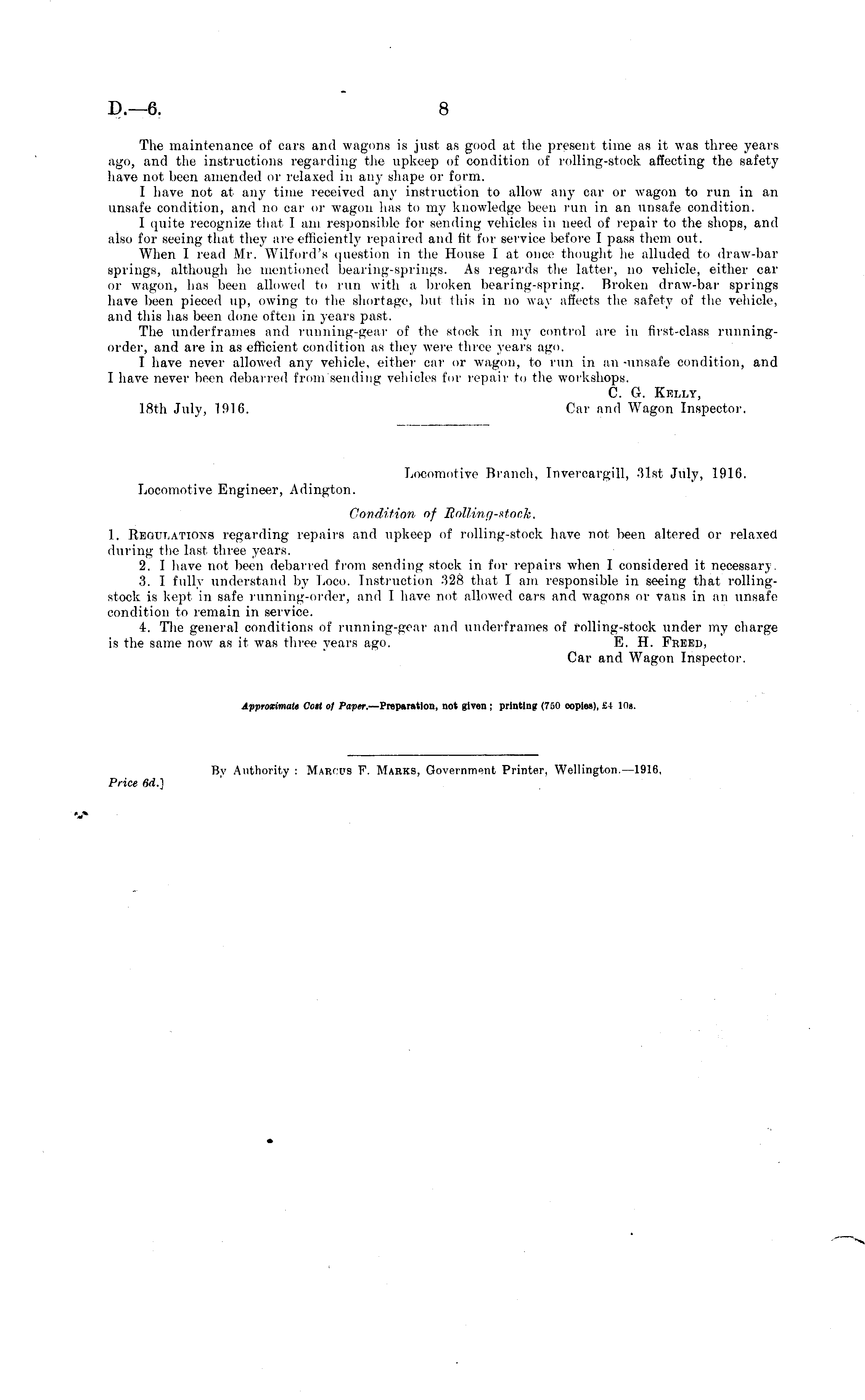 Locomotive Branch, Invercargill, 31st July, 1916. Locomotive Engineer, Adington. Condition of Rolling-stock. 1. Regulations regarding repairs and upkeep of rolling-stock have not been altered or relaxed during the last three years. 2. I have not been debarred from sending stock in for repairs when I considered it necessary. 3. I fully understand by Loco. Instruction 328 that I am responsible in seeing that rollingstock is kept in safe running-order, and I have not allowed cars and wagons or vans in an unsafe condition to remain in service. 4. The general conditions of running-gear' and underframes of rolling-stock under my charge is the same now as it was three years ago. E. H. Freed, Car and Wagon Inspector.