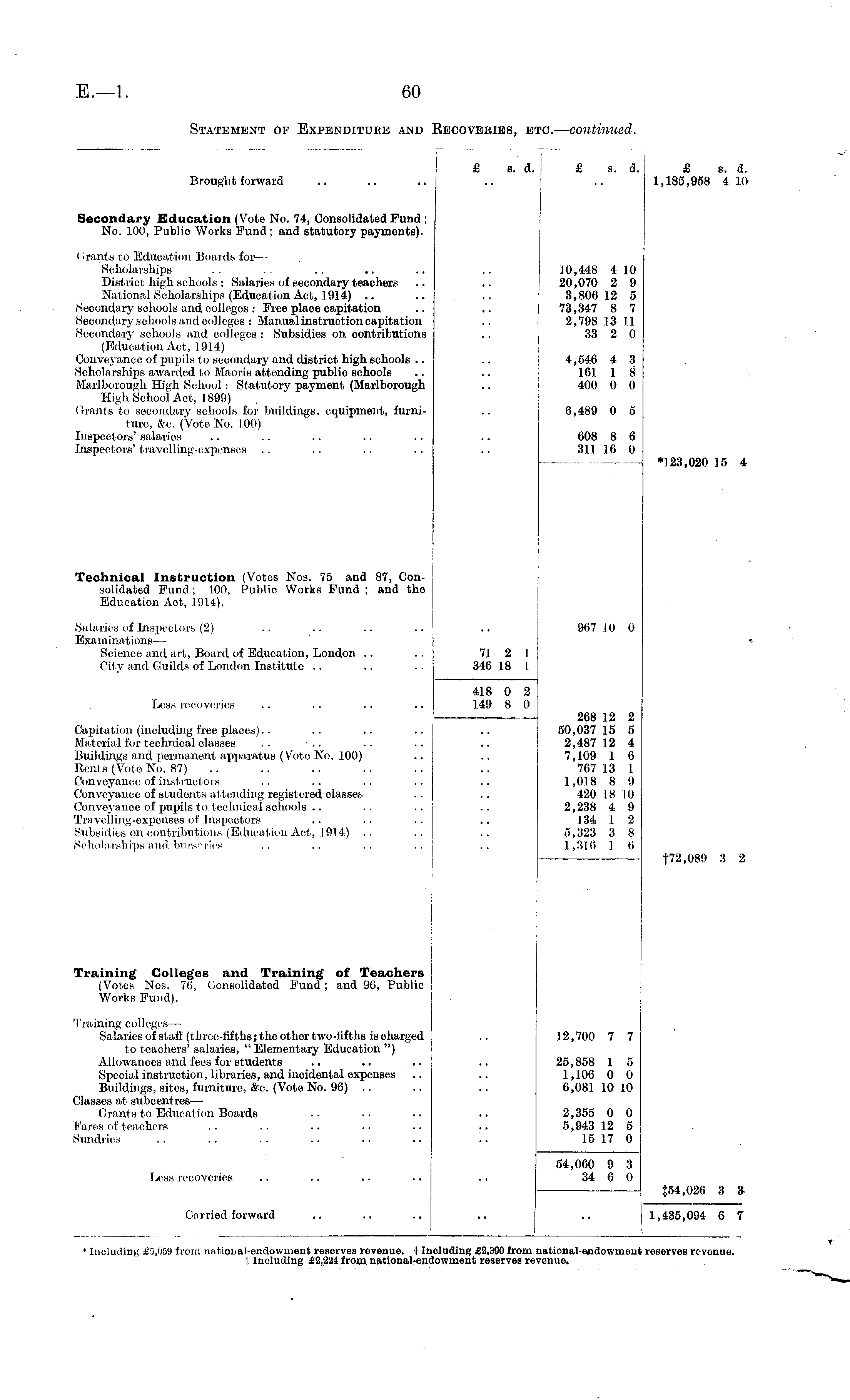 Brought forward £ s. d. £ s. d. £ s. d. 1,185,958 4 10 Secondary education (Vote No. 74, Consolidated Fund ; No. 100, Public Works Fund; and statutory payments). (Irants to Education Boards for— Scholarships District high schools : Salaries of secondary teachers National Scholarships (Education Act, 1914) .. Secondary schools and colleges : Free place capitation Secondary schools and colleges : Manual instruction capitation Secondary schools and colleges : Subsidies on contributions (Education Act, 1914) Conveyance of pupils to secondary and district high schools .. Scholarships awarded to Maoris attending public schools Marlborough High School : Statutory payment (Marlborough High School Act, 1899) Grants to secondary schools for buildings, equipment, furniture, &c. (Vote No. 1.00) Inspectors' salaries Inspectors' travelling-expenses 10,448 4 10 20,070 2 9 3,806 12 5 73,347 8 7 2,798 13 11 33 2 0 4,546 4 3 161 1 8 400 0 0 6,489 0 5 *123,020 15 4 608 8 6 311 16 0 Technical Instruction (Votes Nos. 75 and 87, Consolidated Fund; 100, Public Works Fund ; and the Education Act, 1914). Salaries of Inspectors (2) Examinations— Science and art, Board of Education, London City and Guilds of London Institute 71 2 346 18 I I 967 10 0 Less recoveries Capitation (including free places) Material for technical classes Buildings and permanent apparatus (Vote No. 100) Rents (Vote No. 87) .. Conveyance of instructors Conveyance of students attending registered classes Conveyance of pupils to technical schools .. Travelling-expenses of Inspectors Subsidies on, contributions (Education Act, 1914) .. Scholarships and bursaries 418 0 2 149 8 0 268 12 2 50,037 15 5 2,487 12 4 7,109 1 6 767 13 1 1,018 8 9 420 18 10 2,238 4 9 134 1 2 5,323 3 8 1,316 1 6 t72,089 3 2 Training Colleges and Training of Teachers (Votes Nos. 76, Consolidated Fund ; and 96, Publio Works Fund). Training colleges— Salaries of staff (three-fifths; the othor two-fifths is charged to teachers' salaries, " Elementary Education ") Allowances and fees for students Special instruction, libraries, and incidental expenses Buildings, sites, furniture, &c. (Vote No. 96) .. Classes at subcentres — Grants to Education Boards Fares of teachers Sundries 12,700 7 7 25,858 1 5 1,106 0 0 6,081 10 10 2,355 0 0 5,943 12 5 15 17 0 Less recoveries 54,000 9 3 34 6 0 |54,026 3 3 Carried forward 1,435,094 6 7 * Including £0,059 from national-endowment reserves revenue, t In ]: Including £2,224 from national-enc icluding £2,390 from national-endowmeni lowment reserves revenue. reserves revenue.