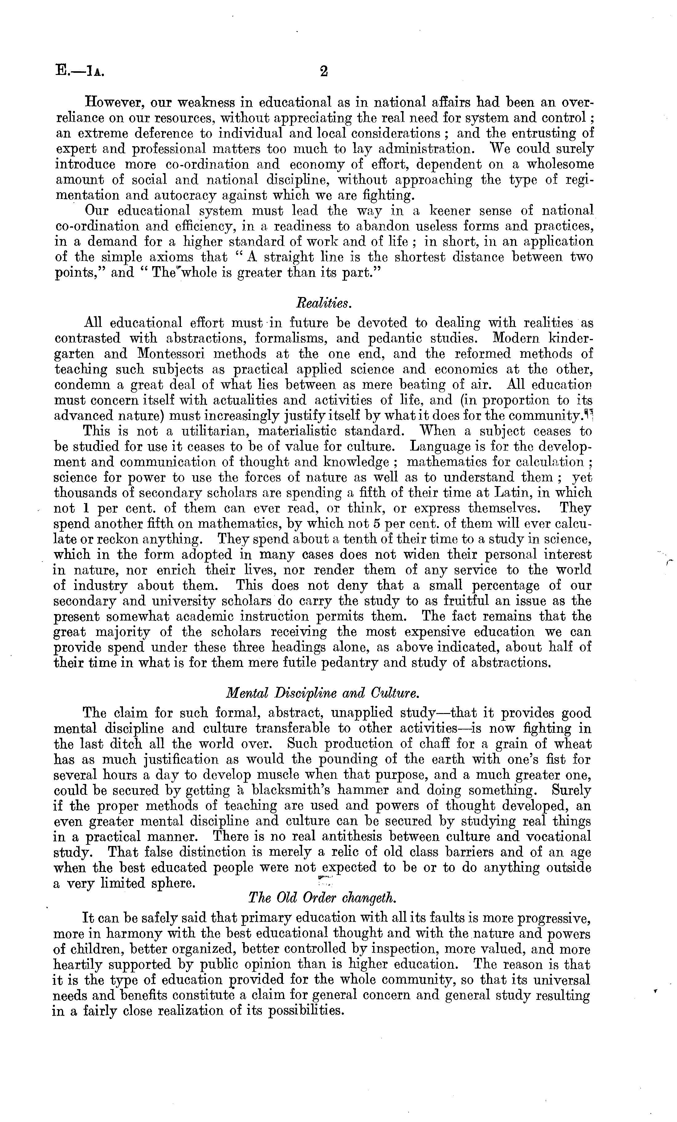 However, our weakness in educational as in national affairs had been an overreliance on our resources, without appreciating the real need for system and control; an extreme deference to individual and local considerations ; and the entrusting of expert and professional matters too much to lay administration. We could surely introduce more co-ordination and economy of effort, dependent on a wholesome amount of social and national discipline, without approaching the type of regimentation and autocracy against which we are fighting. Our educational system must lead the way in a keener sense of national co-ordination and efficiency, in a readiness to abandon useless forms and practices, in a demand for a higher standard of work and of life ; in short, in an application of the simple axioms that " A straight line is the shortest distance between, two points," and " The'whole is greater than its part." Realities. All education al effort must in future be devoted to dealing with realities as contrasted with abstractions, formalisms, and pedantic studies. Modern kindergarten and Montessori methods at the one end, and the reformed methods of teaching such subjects as practical applied science and economics at the other, condemn a great deal of what lies between as mere beating of air. All education must concern itself with actualities and activities of life, and (in proportion to its advanced nature) must increasingly justify itself by what it does for the community.^ This is not a utilitarian, materialistic standard. When a subject ceases to be studied for use it ceases to be of value for culture. Language is for the development and communication of thought and knowledge ; mathematics for calculation ; science for power to use the forces of nature as well as to understand them ; yet thousands of secondary scholars are spending a fifth of their time at Latin, in which not 1 per cent, of them can ever read, or think, or express themselves. They spend another fifth on mathematics, by which not 5 per cent, of them will ever calculate or reckon anything. They spend about a tenth of their time to a study in science, which in the form adopted in many cases does not widen their personal interest in nature, nor enrich their lives, nor render them of any service to the World of industry about them. This does not deny that a small percentage of our secondary and university scholars do carry the study to as fruitful an issue as the present somewhat academic instruction permits them. The fact remains that the great majority of the scholars receiving the most expensive education we can provide spend under these three headings alone, as above indicated, about half of their time in what is for them mere futile pedantry and study of abstractions. Mental Discipline and Culture. The claim for such formal, abstract, unapplied study—that it provides good mental discipline and culture transferable to other activities—is now fighting in the last ditch all the world over. Such production of chaff for a grain of wheat has as much justification as would the pounding of the earth with one's fist for several hours a day to develop muscle when that purpose, and a much greater one, could be secured by getting a blacksmith's hammer and doing something. Surely if the proper methods of teaching are used and powers of thought developed, an even greater mental discipline and culture can be secured by studying real things in a practical manner. There is no real antithesis between culture and vocational study. That false distinction is merely a relic of old class barriers and of an. age when the best educated people were not expected to be or to do anything outside a very limited sphere. The Old Order changeth. It can be safely said that primary education with all its faults is more progressive, more in harmony with the best educational thought and with the nature and powers of children, better organized, better controlled by inspection, more valued, and more heartily supported by public opinion than is higher education. The reason is that it is the type of education provided for the whole community, so that its universal needs and benefits constitute a claim for general concern and general study resulting in a fairly close realization of its possibilities.