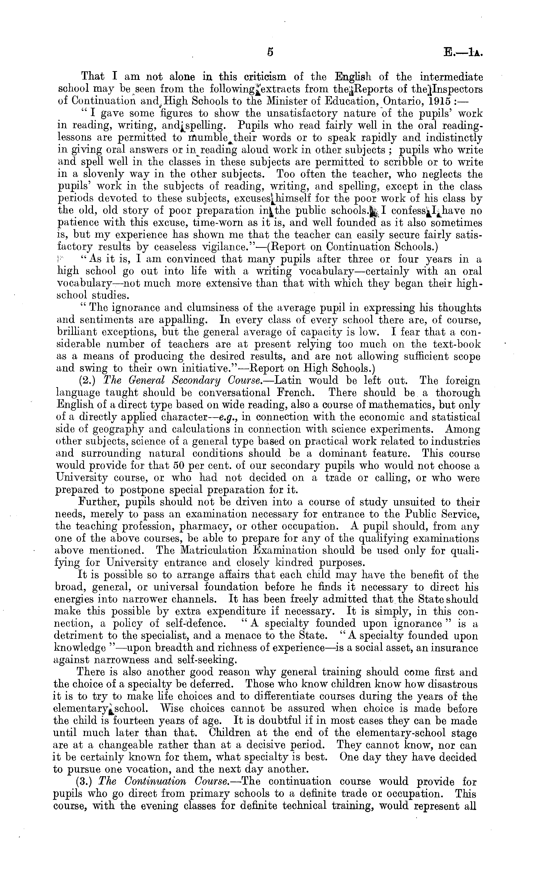 That I am not alone in this criticism of the English of the intermediate school may be seen from the from of the}lnspectors of Continuation and., High Schools to the Minister of Education, Ontario, 1915 :— " I gave some figures to show the unsatisfactory nature of the pupils' work in reading, writing, Pupils who read fairly well in the oral readinglessons are permitted to mumble A their words or to speak rapidly and indistinctly in. giving oral answers or aloud work in other subjects ; pupils who write and spell well in. the classes in these subjects are permitted to scribble or to write in a slovenly way in the other subjects. Too often the teacher, who neglects the pupils' work in the subjects of reading, writing, and spelling, except in the class periods devoted to these subjects, for the poor work of his class by the old, old story of poor preparation public I no patience with this excuse, time-worn as it is, and well founded as it also sometimes is, but my experience has shown me that the teacher can easily secure fairly satisfactory results by ceaseless vigilance."—(Report on Continuation Schools.) i : "As it is, lam convinced that many pupils after three or four years in a high school go out into life with a writing vocabulary—certainly with an oral vocabulary—not much more extensive than that with which they began their highschool studies. " The ignorance and clumsiness of the average pupil in expressing his thoughts and sentiments are appalling. In every class of every school there are, of course, brilliant exceptions, but the general average of capacity is low. I fear that a considerable number of teachers are at present relying too much on the text-book as a means of producing the desired results, and are not allowing sufficient scope and swing to their own initiative." —Report on High Schools.) (2.) The General Secondary Course. —Latin would be left out. The foreign language taught should be conversational French. There should be a thorough English of a direct type based on wide reading, also a course of mathematics, but only of a directly applied character — e.g., in. connection with the economic and statistical side of geography and calculations in connection with science experiments. Among other subjects, science of a general type based on practical work related to industries and surrounding natural conditions should be a dominant feature. This course would provide for that 50 per cent, of our secondary pupils who would not choose a University course, or who had not decided on a trade or calling, or who were prepared to postpone special preparation for it. Further, pupils should not be driven into a course of study unsuited to their needs, merely to pass an examination necessary for entrance to the Public Service, the teaching profession, pharmacy, or other occupation. A pupil should, from any one of the above courses, be able to prepare for any of the qualifying examinations above mentioned. The Matriculation Examination should be used only for qualifying for University entrance and closely kindred purposes. It is possible so to arrange affairs that each child may have the benefit of the broad, general, or universal foundation before he finds it necessary to direct his energies into narrower channels. It has been freely admitted that the State should make this possible by extra expenditure if necessary. It is simply, in this connection, a policy of self-defence. " A specialty founded upon ignorance "is a detriment to the specialist, and a menace to the State. "A specialty founded upon knowledge " —upon breadth and richness of experience—is a social asset, an insurance against narrowness and self-seeking. There is also another good reason, why general training should come first and the choice of a specialty be deferred. Those who know children know how disastrous it is to try to make life choices and to differentiate courses during the years of the Wise choices cannot be assured when choice is made before the child is fourteen years of age. It is doubtful if in most cases they can be made until much later than that. Children at the end of the elementary-school stage are at a changeable rather than at a decisive period. They cannot know, nor can it be certainly known for them, what specialty is best. One day they have decided to pursue one vocation, and the next day another. (3.) The Continuation Course. —The continuation course would provide for pupils who go direct from primary schools to a definite trade or occupation. This course, with the evening classes for definite technical training, would represent all