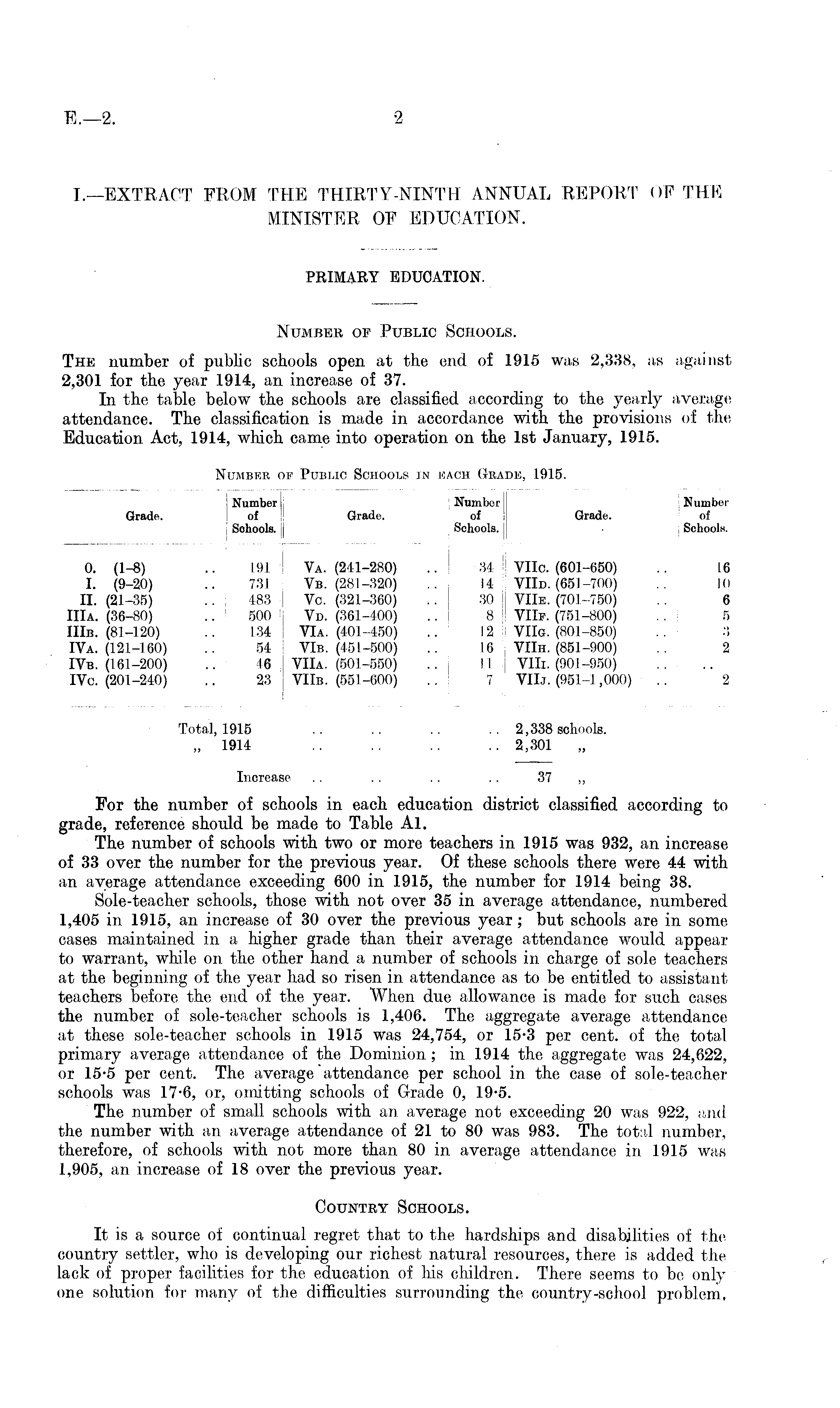 PRIMARY EDUCATION. Number of Public Schools. The number of public schools open at the end of 1915 was 2,338, as against 2,301 for the year 1914, an increase of 37. In the table below the schools are classified according to the yearly average attendance. The classification is made in accordance with the provisions of the Education. Act, 1914, which came into operation on the Ist January, 1915.