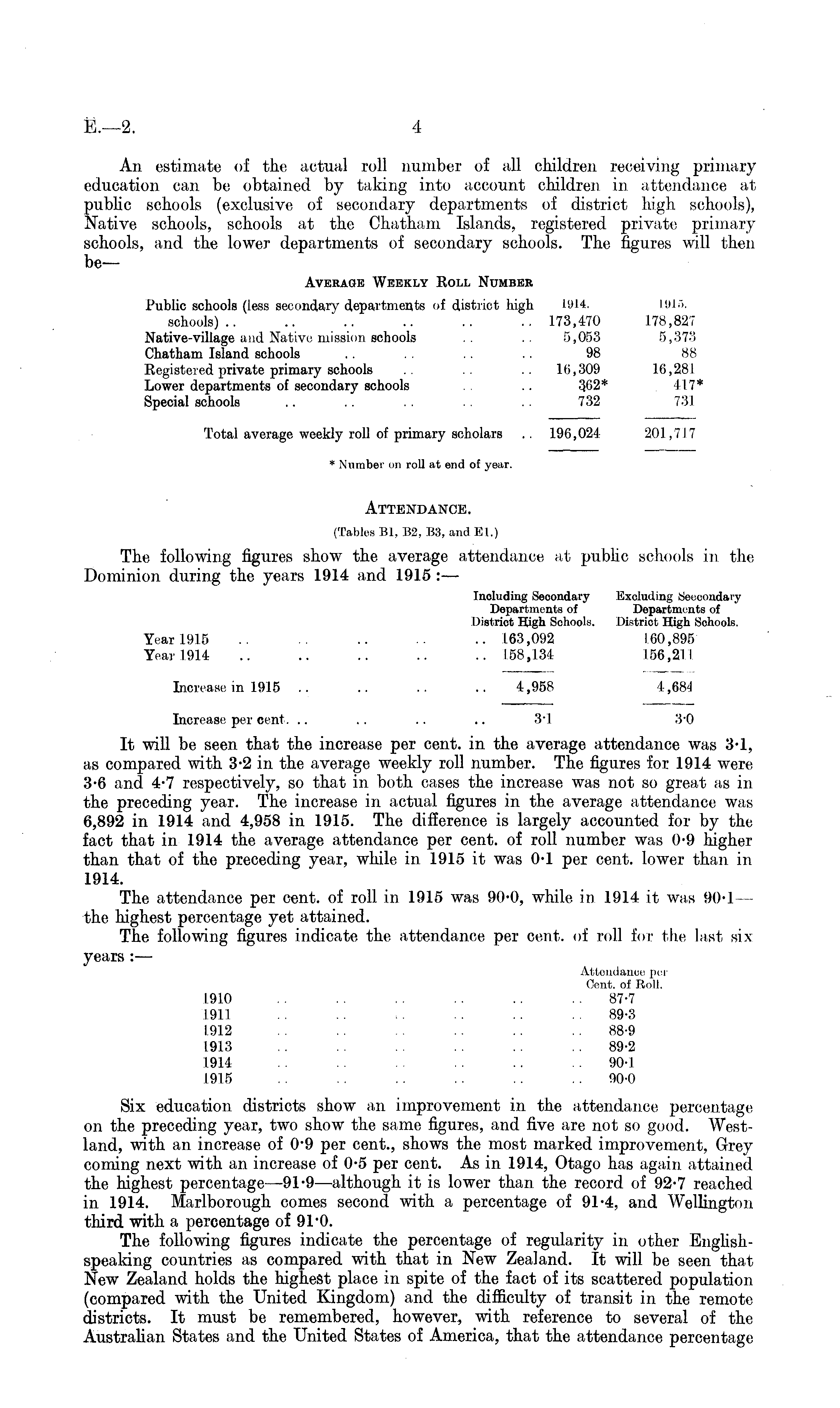 An estimate of the actual roll number of all children receiving primary education can. be obtained by taking into account children in attendance at public schools (exclusive of secondary departments of district high schools), Native schools, schools at the Chatham Islands, registered private primary schools, and the lower departments of secondary schools. The figures will then be— Average Weekly Roll Number Public schools (less secondary departments of district high 1914- 1915. schools).. .. .. .. .. .. 173,470 178,827 Native-village and Native mission schools .. .. 5,053 5,373 Chatham Island schools .. .. .. 98 88 Registered private primary schools .. .. 16,309 16,281 Lower departments of secondary schools .. 362* 417* Special schools .. .. .. .. 732 731 Total average weekly roll of primary scholars .. 196,024 201,717 * Number on roll at end of year. Attendance. (Tables 81, 82, 83, and El.) The following figures show the average attendance at public schools in the Dominion during the years 1914 and 1915 : — Including Secondary Excluding Seccondary Departments of Departments of District High Schools. District High Sohools. Year 1915 .. .. .. .. .. 163,092 160,895 Year 1914 158,134 156,211 Increase in 1915 .. .. .. .. 4,958 4,684 Increase per cent. .. .. .. .. 3 - l 3 - 0 It will be seen that the increase per cent, in the average attendance was 3-1, as compared with 3-2 in the average weekly roll number. The figures for 1914 were 3-6 and 4-7 respectively, so that in both cases the increase was not so great as in the preceding year. The increase in actual figures in the average attendance was 6,892 in 1914 and 4,958 in 1915. The difference is largely accounted for by the fact that in 1914 the average attendance per cent, of roll number was 0-9 higher than that of the preceding year, while in 1915 it was 0-1 per cent, lower than in 1914. The attendance per cent, of roll in 1915 was 90-0, while in 1914 it was 90*1 — the highest percentage yet attained. The following figures indicate the attendance per cent, of roll for the last six years : — Attendance per Cent, of Roll. 1910 .. .. . . .. .. .. 87-7 1911 .. .. i. .. .. .. 89-3 1.912 .. .. .. .. .. .. 88-9 1913 .. .. .. .. .. .. 89-2 1914 .. .. .. .. 90-1 1915 .. .. .. .. 90-0 Six education districts show an improvement in the attendance percentage on the preceding year, two show the same figures, and five are not so good. Westland, with an increase of 09 per cent., shows the most marked improvement, Grey coming next with an increase of 0-5 per cent. As in 1914, Otago has again attained the highest percentage —91-9 —although it is lower than the record of 92-7 reached in 1914. Marlborough comes second with a percentage of 91-4, and Wellington third with a percentage of 91*0. The following figures indicate the percentage of regularity in other Englishspeaking countries as compared with that in New Zealand. It will be seen that New Zealand holds the highest place in spite of the fact of its scattered population (compared with the United Kingdom) and the difficulty of transit in the remote districts. It must be remembered, however, with reference to several of the Australian States and the United States of America, that the attendance percentage