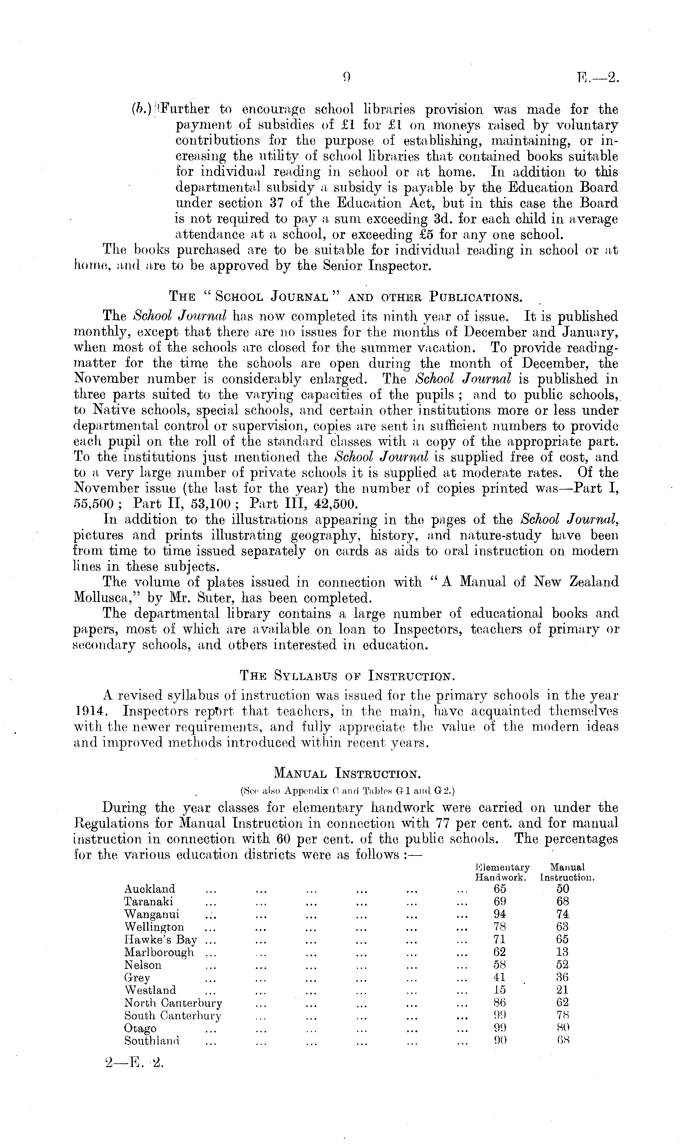 (ft.)' Further to encourage school libraries provision was made for the payment of subsidies of £1 for £1 on moneys raised by voluntary contributions for the purpose of establishing, maintaining, or increasing the utility of school libraries that contained books suitable for individual reading in school or at home. In addition to this departmental subsidy a subsidy is payable by the Education Board under section 37 of the Education Act, but in this case the Board is not required to pay a sum exceeding 3d. for each child in average attendance at a school, or exceeding £5 for any one school. The books purchased are to be suitable for individual reading in school or at home, and are to be approved by the Senior Inspector. The " School Journal " and other Publications. The School Journal has now completed its ninth year of issue. It is published monthly, except that there are no issues for the months of December and January, when most of the schools a,re closed for the summer vacation. To provide readingmatter for the time the schools are open during the month of December, the November number is considerably enlarged. The School Journal is published in three parts suited to the varying capacities of the pupils ; and to public schools, to Native schools, special schools, and certain other institutions more or less under departmental control or supervision, copies are sent in sufficient numbers to provide each pupil on the roll of the standard classes with a. copy of the appropriate part. To the institutions just mentioned the School Journal is supplied free of cost, and to a, very large number of private schools it is supplied at moderate rates. Of the November issue (the last for the year) the number of copies printed was—Part I, 55,500 ; Part 11, 53,100 ; Part 111, 42,500. In addition to the illustrations appearing in the pages of the School Journal, pictures and prints illustrating geography, history, and nature-study have been from time to time issued separately on cards as aids to oral instruction on modern lines in these subjects. The volume of plates issued in connection with " A Manual of New Zealand Mollusca," by Mr. Suter, has been completed. The departmental library contains a large number of educational books and papers, most of which are available on loan to Inspectors, teachers of primary or secondary schools, and others interested in education. The Syllabus of Instruction. A revised syllabus of instruction was issued for the primary schools in the year 1914. Inspectors report that teachers, in the main, have acquainted themselves with the newer requirements, and fully appreciate the value of the modern ideas and improved, methods introduced within, recent years. Manual Instruction. (Sit also Appendix C mid Tables Gl and G2.) During the year classes for elementary handwork were carried on under the Regulations for Manual Instruction in connection with 77 per cent, and for manual instruction in connection with 60 per cent, of the public schools. The percentages for the various education districts were as follows :— Elementary Manual Handwork. Instruction. Auckland ... ... ... ... ... ... 65 50 Taranaki ... ... ... ... ... ... 69 68 Wanganui ... ... ... ... ... ... 94 74 Wellington ... ... ... ... ... ... 78 63 Hawke's Bay ... ... ... ... ... ... 71 65 Marlborough ... ... ... ... ... ... 62 13 Nelson ... ... ... ... ... ... 58 52 Grey ... ... ... ... ... ... 41 36 Westland ... ... ... ... ... ... 15 21 North Canterbury ... ... ... ... ... 86 02 South Canterbury ... ... ... ... ... 99 78 Ocago ... 99 SO Southland ... ... ... ... ... ... 90 OH