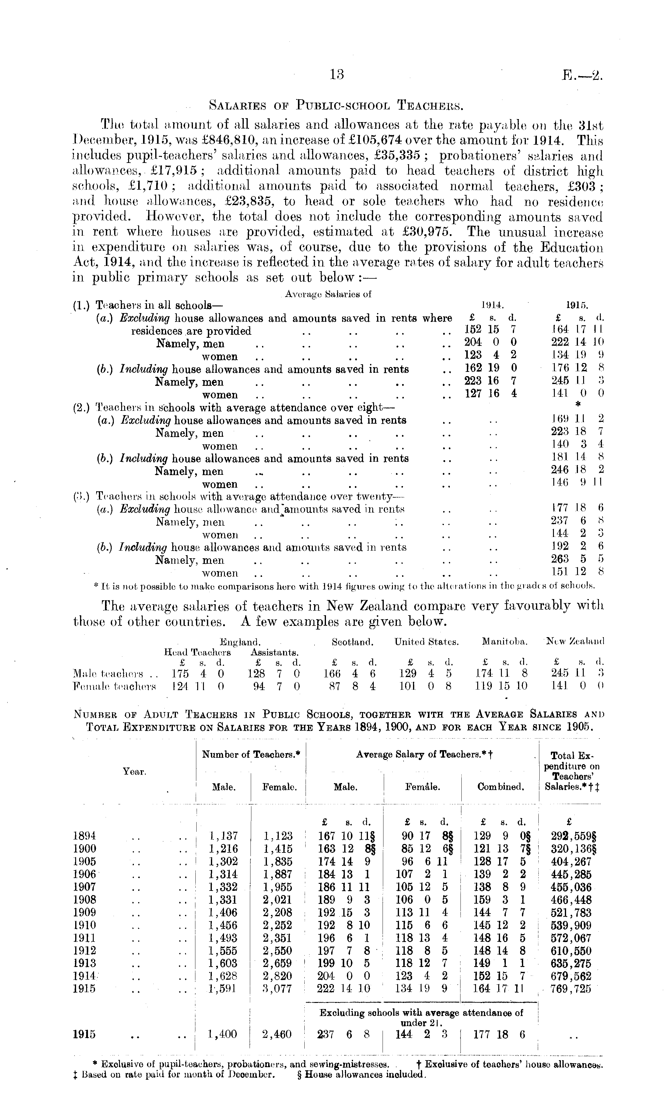 Number of Year. Teachers.* Avertt| 'g ge Salary of Teachers.* -f . Total Expenditure on Teachers' Female. Combined. Salaries.* f J Male. Female. Male. 1894 .. .. 1,137 1900 .. .. 1,216 1905 '.. .. ! 1,302 1906 .. .. 1,314 1907 .. .. 1,332 1908 .. .. 1,331 1909 .. .. 1,406 1910 .. .. 1,456 1911 .. .. 1,493 19.12 .. .. 1,555 1913 .. .. 1,603 1914 .. .. 1,628 1915 .. .. 1,59.1 £ s. d. £ s. d. £ s. d. £ 1,123 1,415 1,835 1,887 1,955 2,021 2,208 2,252 2,351 2,550 2,659 I 2,820 3,077 167 10 118 163 12 88 174 14 9 184 13 1 186 11 11 189 9 3 192 15 3 192 8 10 196 6 1 197 7 8 199 10 5 204 0 0 222 14 10 90 17 8§ 129 9 0§ 292,5595 85 12 6§ 121 13 7§ 320,1368 96 6 11 128 17 5 404,267 107 2 1 139 2 2 445,285 105 12 5 138 8 9 455,036 106 0 5 159 3 1 466,448 113 11 4 144 7 7 521,783 115 6 6 145 12 2 539,909 118 13 4 148 16 5 572,067 118 8 5 148 14 8 610,550 118 12 7 149 1 1 635,275 123 4 2 152 15 7 679,562 134 19 9 164 17 11 769,725 1 1915 .. .. 1,400 Excluding sohools with average attendance of under 21. 2,460 237 6 8 144 2 3 177 18 6 ,tioners, and sewing-mistresses. t Exolusive of toaohers' house allowances, nber. § House allowances included. * Exolusive of pupil-teachers, proba | Based on rate paid for month of Dooei