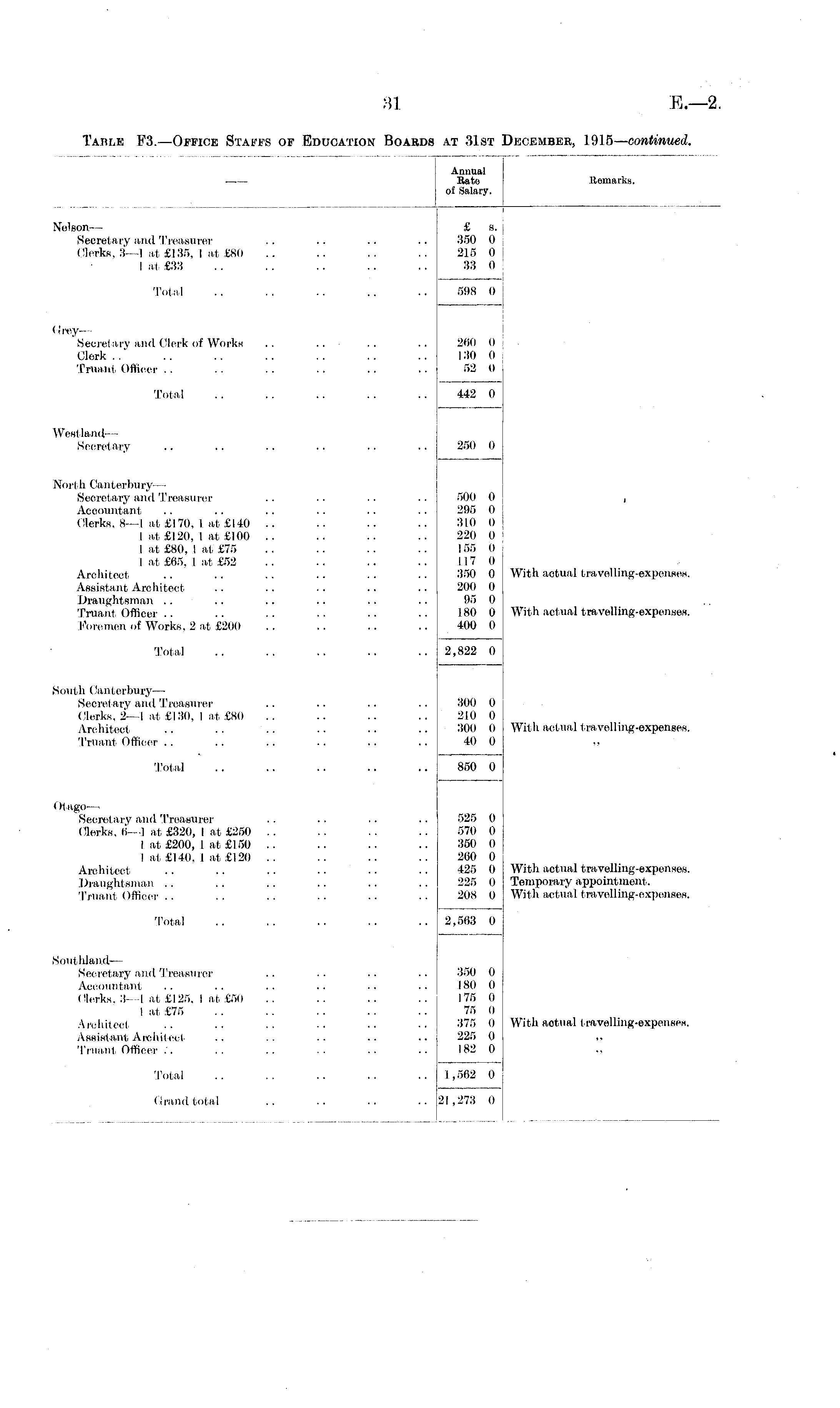 Annual Rate of Salary. Remarks. Melson— Secretary and Treasurer Clerks, ii- I at £135, I at £80 I at £33 £ s. 350 0 21.5 0 33 0 Total 598 0 trey— Secretary and Clerk of Works Clerk..' Truant Officer 260 0 130 0 52 0 Total iVestland—Sooretary 442 0 250 0 i North CanterburySecretary and Treasurer Accountant, Clerks. 8—1 at, £170. I at £140 I at £120, 1 at £100 I at, £80, I at £75 1 at £65, 1 at £52 500 0 295 0 310 0 220 0 155 0 117 0 350 0 200 0 95 0 180 0 400 0 With actual travelling-expenses. Architect Assistant Architect Draughtsman Truant Officer Foremen of Works, 2 at £200 With actual travelling-expenses. Total 2,822 0 South (lanf erbury— Secretary and Treasurer Clerks, 2—1 at £130, I at, £80 Architect Truant Officer 300 0 210 0 300 0 40 0 With actual travelling-expenses. Total 850 0 Otago— Secretary and Treasurer Clerks, 6—1 at £320, I at £250 I at £200, I at £150 I at £140. 1 at £120 525 0 570 0 350 0 260 0 425 0 225 0 208 0 With actual travelling-expenses. Temporary appointment. With actual travelling-expenses. Architect Draughtsman Truant Officer Total 2,563 0 SouthlandSecretary anil Treasurer Accountant Clerks. 3-1 at £125. I at £50 I at £75 350 0 180 0 175 (I 75 11 375 0 225 0 182 0 With actual travelling-expenses. Architect, Assistant Architect Truant Officer .'. Total I ,562 0 Grand total 21,273 0