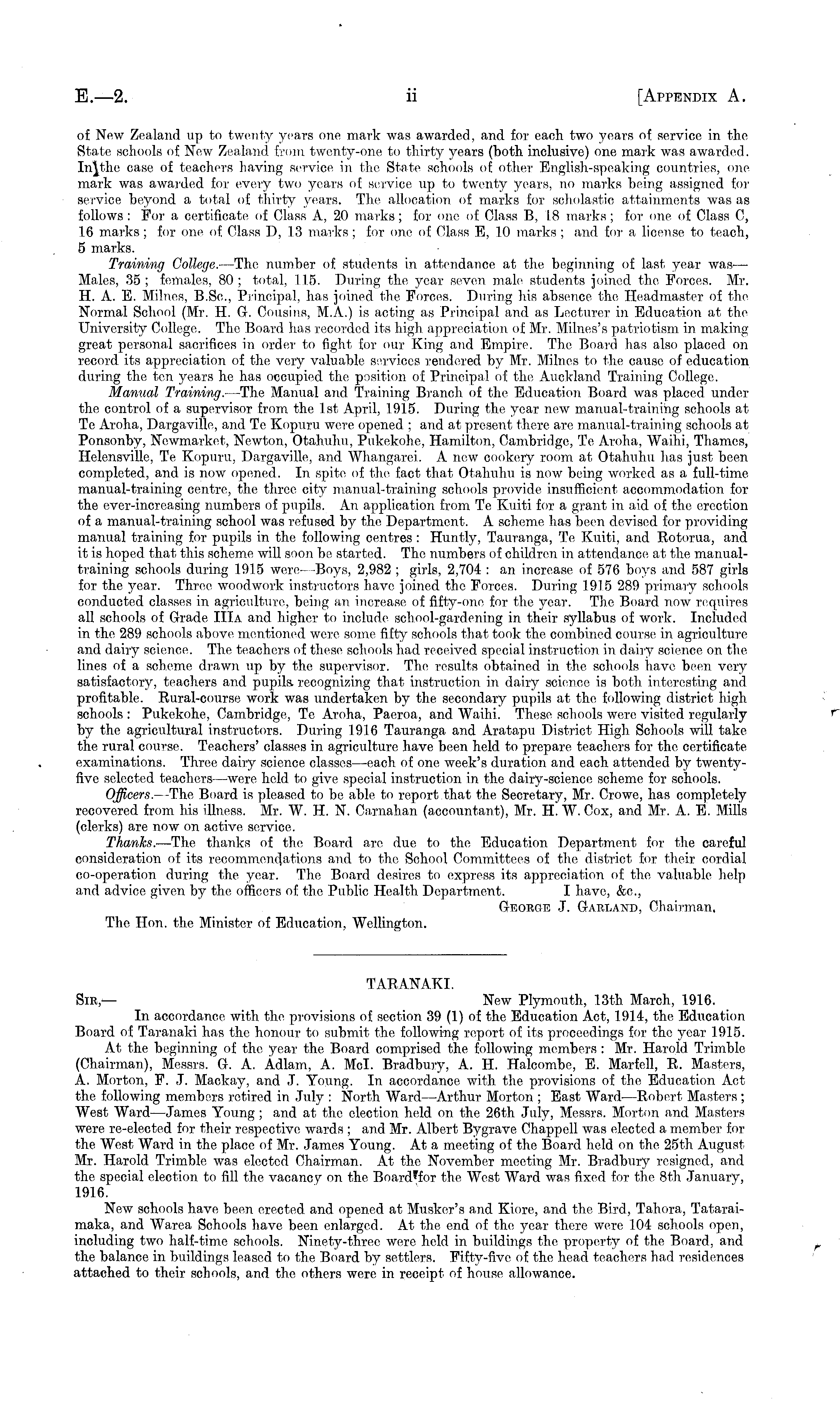 TARANAKI. Sir,— New Plymouth, 13th March, 1916. In accordance with the provisions of section 39 (1) of the Education Act, 1914, the Education Board of Taranaki has the honour to submit the following report of its proceedings for the year 1915. At the beginning of the year the Board comprised the following members : Mr. Harold Trimble (Chairman), Messrs. G. A. Adlam, A. Mel. Bradbury, A. H. Halcombe, E. Marfell, R. Masters, A. Morton, F. J. Mackay, and J. Young. In. accordance with the provisions of the Education Act the following members retired in July : North Ward —Arthur Morton ; East Ward —Robert Masters; West Ward —James Young ; and at the election held on the 26th July, Messrs. Morton, and Masters were re-elected for their respective wards ; and Mr. Albert Bygrave Chappell was elected a member for the West Ward in the place of Mr. James Young. At a meeting of the Board held on the 25th August Mr. Harold Trimble was elected Chairman. At the November meeting Mr. Bradbury resigned, and the special election to fill the vacancy on the Board ? for the West Ward was fixed for the Bth January, 1916. New schools have been erected and opened at Muskor's and Kiore, and the Bird, Tahora, Tataraimaka, and Warea Schools have been enlarged. At the end of the year there were 104 schools open, including two half-time schools. Ninety-three were held in buildings the property of the Board, and the balance in buildings leased to the Board by settlers. Fifty-five of the head teachers had residences attached to their schools, and the others were in receipt of house allowance.