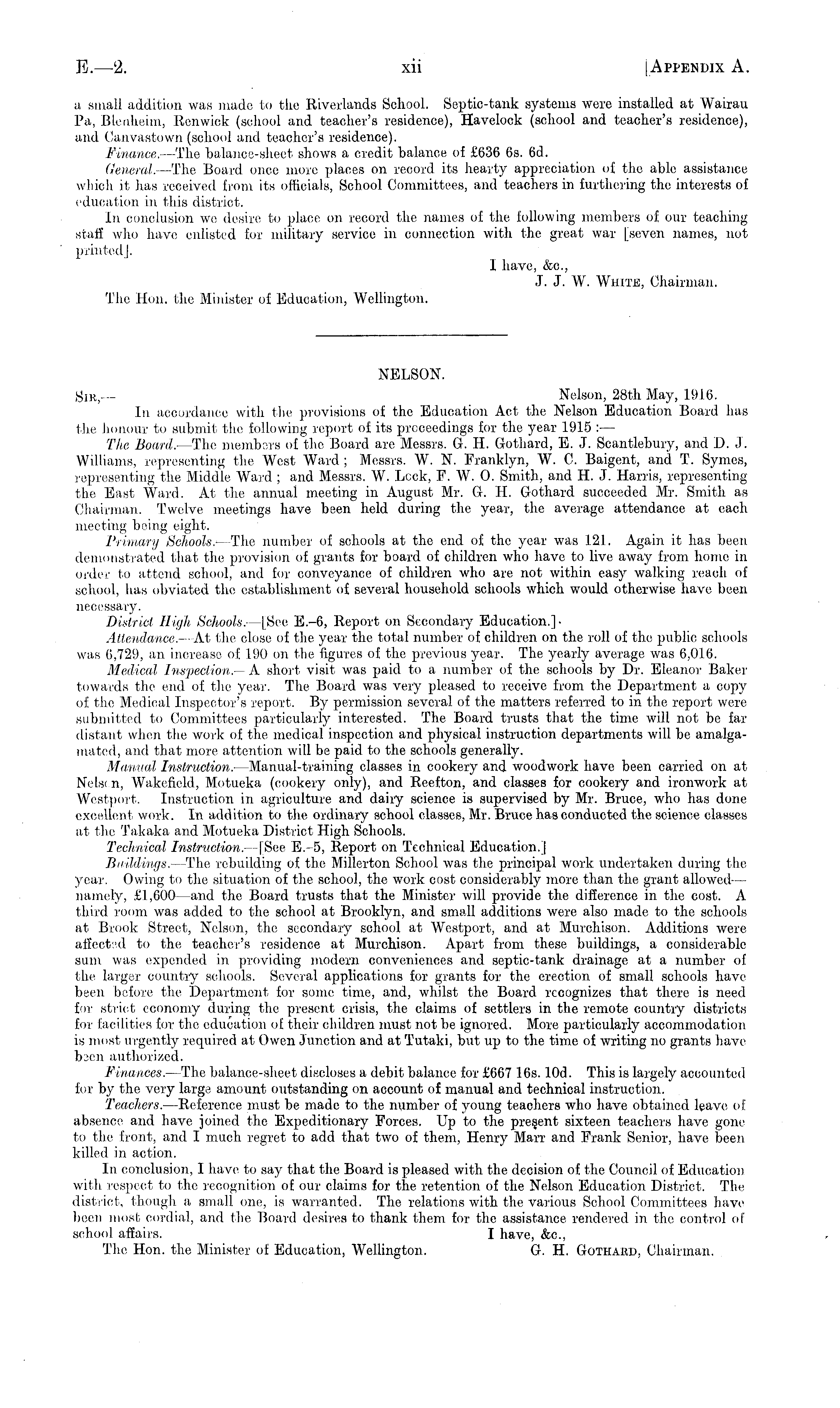 NELSON. Sir,— Nelson, 28th May, 1916. In accordance with the provisions of the Education Act the Nelsevn Education Board has the honour to submit the following report of its proceedings for the year 1915 :- — The Board. —The members of the Board are Messrs. G. H. Gothard, E. J. Scantlebury, and D. J. Williams, representing the West Ward ; Messrs. W. N. Franklyn, W. C Baigent, and T. Symes, representing the Middle Ward ; and Messrs. W. Leek, F. W. 0. Smith, and H. J. Harris, representing the East Ward. At the annual meeting in August Mr. G. H. Gothard succeeded Mr. Smith as Chairman. Twelve meetings have been held during the year, the average attendance at each meeting being eight. Primary Schools- The number of schools at the end of the year was 12.1. Again it has been demonstrated that the provision of grants for board of children who have to live away from home in order to attend school, and for conveyance of children who are not within easy walking reach e>f schewl, has obviated the establishment of several household schools which would otherwise have been necessary. District High Schools. —[See E.-6, Report on Secondary Education.]Attendance. —At the close of the year the total number of children on the roll of the public schools was 6,729, an increase of 190 on the figures of the previous year. The yearly average was 6,016. Medical Inspection — A short visit was paid to a number of the schools by Dr. Eleanor Baker towards the end of the year. The Be>ard was very pleased to receive from the Department a copy of the Medical Inspector's report. By permission several of the matters referred to in the report were submitted to Committees particularly interested. The Board trusts that the time will not be far distant when the work eif the medical inspection and physical instruction departments will be amalgamated, and that more attention will be paiel to the schools generally. Manual Instruction. —Manual-training classes in cookery and woodwork have been carried on at Nelsen, Wakefield, Motueka (cookery only), and Reefton, and classes for cookery and ironwork at Westport. Instruction in agriculture and dairy science is supervised by Mr. Bruce, who has done excellent work. In addition to the ordinary school classes, Mr. Bruce has conducted the science classes at the Takaka and Motueka District High Schools. Technical Instruction. —[See E.-5, Report on Technical Education.] Buildings. —The rebuilding of. the Millerton School was the principal work undertaken during the year. Owing to the situation of the school, the work cost considerably more than the grant allowed— namely, £1,600 —and the Board trusts that the Minister will preivide the difference in the cost. A third room was added to the school at Brooklyn, and small additions were also made to the schools at Brook Street, Nelson, the secondary school at Westport, and at Murchison. Additions were affected to the teacher's residence at Murchison. Apart from these buildings, a considerable sum was expended in providing modem conveniences and septic-tank drainage at a number of the larger country schools. Several applications for grants for the erection of small schools have been before the Department for some time, and, whilst the Board recognizes that there is need for strict economy during the present crisis, the claims of settlers in the remote country districts for facilities for the education eif their children must not be igneired. More particularly accommodation is most urgently required at Owen Junction and at Tutaki, but up to the time of writing no grants have b3en authorized. Finances. —The balance-sheet discloses a debit balance for £667 16s. lOd. This is largely accounted for by the very large amount emtstanding on account of manual and technical instruction. Teachers. —Reference must be made te> the number of young teachers who have obtained leave of absence and have joined the Expeditionary Forces. Up to the present sixteen teachers have gone to the front, and I much regret to add that two eif them, Henry Marr and Frank Senior, have been killed in action. In conclusion, I have to say that the Board is pleased with the decision of the Council of Education with respect to the recognition of our claims for the retention of the Nelson Education District. The disl-ict, though a small one, is warranted. The relations with the variems School Cermmittees have been nuisfc cordial, and the Board desires to thank them foi' the assistance rendered in the control of school affairs. I have, &c, The Hon. the Minister of Education, Wellington. G. H. Gothard, Chairman.