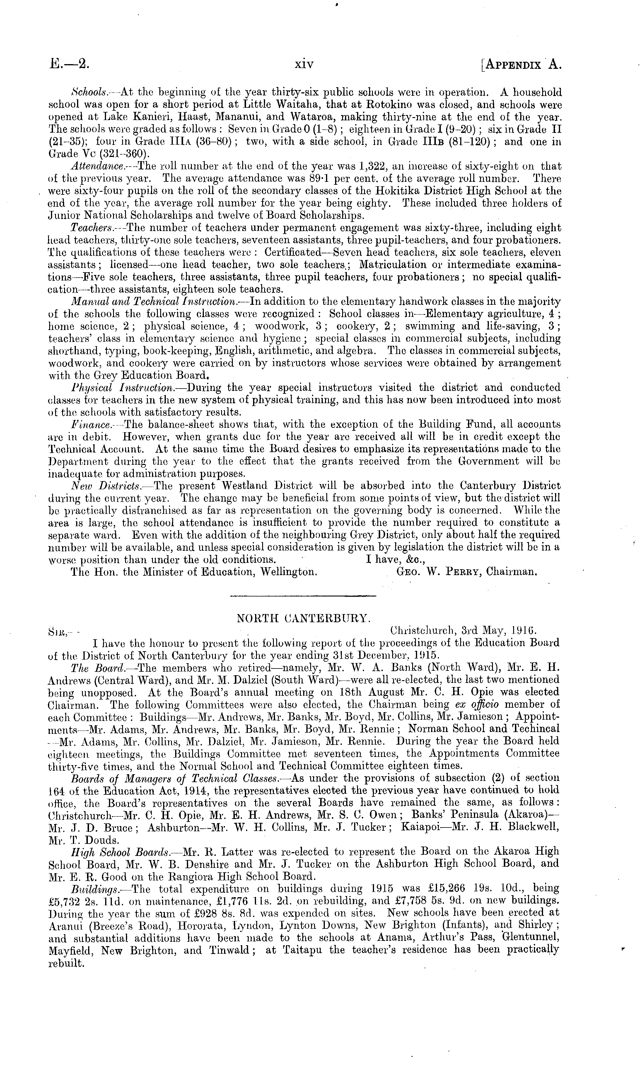 NORTH CANTERBURY. Sir, Christchurch, 3rd May, 1916. I have the honour to present the following report of the proceedings of the Educatiem Beiard of the. District of North Canterbury for the year ending 31st December, 1915. The Board. —The members who retired- —namely, Mr. W. A. Banks (North Ward), Mr. E. H. Andrews (Central Ward), and Mr. M. Dalziel (South Ward) —were all re-elected, the last two mentioned being unopposed. At the Board's annual meeting on 18th August Mr. C H. Opie was elected Chairman. The following Committees were also elected, the Chairman being ex officio member' of each Committee : Buildings—Mr. Andrews, Mr. Banks, Mr. Boyd, Mr. Collins, Mr. Jamieson ; Appointments —Mr. Adams, Mr. Andrews, Mr. Banks, Mr. Boyd, Mr. Rennie ; Norman School and Techincal —Mr. Adams, Mr. Collins, Mr. Dalziel, Mr. Jamieson, Mr. Rennie. During the year the Board held eighteen meetings, the; Buildings Committee met seventeen times, the Appointments Committee thirty-five times, and the Normal School and Technical Committee eighteen times. Boards oj Managers oj Technical Classes. —As under the provisions e)f subsection (2) of section 164 of the Education Act, 1914, the representatives elected the previous year have continued to hold office, the Board's representatives on the several Boards have remained the same, as feillows: Christchurch—Mr. CH. Opie, Mr. E. H. Andrews, Mr. S. C Owen; Banks' Peninsula (Akaroa)— Mr. J. D. Bruce; Ashburton—Mr. W. H. Collins, Mr. J. Tucker; Kaiapoi—Mr. J. H. Blackwell, Mr. T. Douds. High School Boards. —Mr. It. Latter was re-elected to represent the Board on the Akaroa High School Board, Mr. W. B. Denshire and Mr. J. Tucker on the Ashburton High School Board, and Mr. E. R. Good on the Rangiora High School Board. Buildings.—'Hie, total expenditure on buildings during 1915 was £15,266 19s. Iod., being £5,732 2s. lid. on maintenance, £1,776 I Is. 2d. on rebuilding, and £7,758 ss. 9d. em new buildings. During the year the sum of £928 Bs. Bd. was expended on sites. New schools have been erected at Aranui (Breeze's Road), Hororata, Lyndon, Lynton Downs, New Brighton (Infants), and Shirley ; and substantial additions have been made to the schools at Anama, Arthur's Pass, Glentunnel, Mayfield, New Brighton, and Tinwald; at Taitapu the teacher's residence has been practically rebuilt.