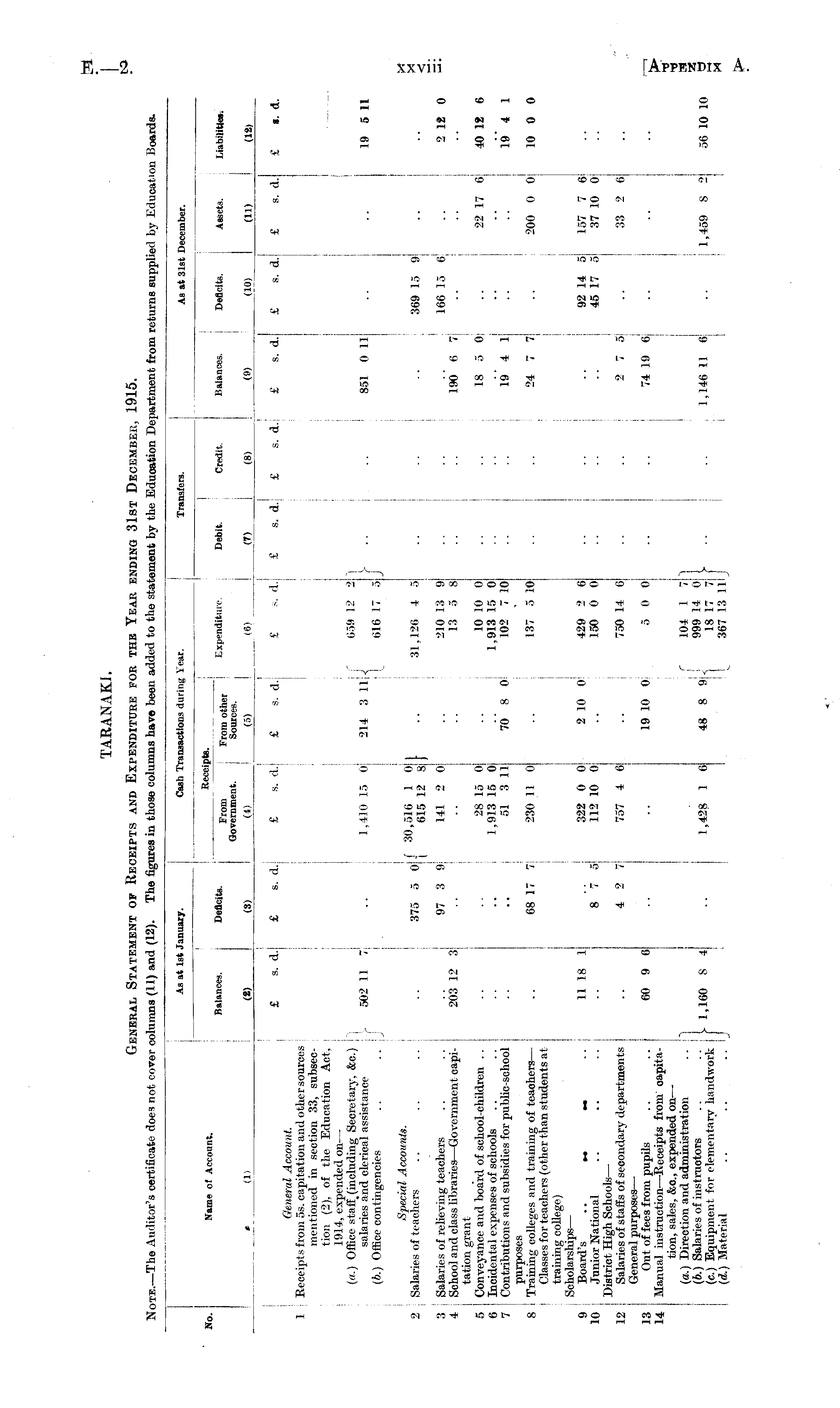 ,TE. — Ill liter's cei ical oes no! cover col lumns am Igures in lose col lumns lave leen a< ie 51 imenl »y luoation tepai ;ment •oni returns supp] lied »y lucation j As at 1st January. Cash Transactions during Year. Transfers. As at 31st December. No. Same of Account. Balances. (2) Deficits. (3) Reel From Government. Receipts. seipts a. From other Sources. (5) Expenditure. (6) j Debit. (J) 1 Credit. (8) Balances. (9) j ] Deficits. (10) Assets. (11) Liabilities: I (12) » (1) £ s. d. General Account. 1 Receipts from 5s. capitation and other sources mentioned in section 33, subsection (2), of the Education Act, 1914, expended on — («.) Office staff_ (including Secretary, &c.) j salaries and clerical assistance )■ 502 11 7 (b.) Office contingencies .. .. j Special Accounts. 2 I Salaries of teachers 3 Salaries of relieving teachers 4 School and class libraries —Government capi- 203 12 3 tation grant 5 Conveyance and board of school-children 6 Incidental expenses of schools 7 Contributions and subsidies for public-school purposes 8 Training colleges and training of teachers — Classes for teachers (other than students at training college) Scholarships — 9 ; Board's .. ... ►. .. 11 18 1 10 j Junior National .. .. .. ; ; District High Schools — 12 : Salaries of staffs of secondary departments General purposes — 13 Out of fees from pupils .. .. 60 9 6 14: Manual instruction —Receipts from oapitation, sales, &c, expended on — ■ (o.) Direction and administration .. M (b.) Salaries of instructors .. ■ I 1 160 8 (c.) Equipment for elementarv handwork i j ' (d.) Material .. '.. .. IJ £ s. d. £ s. d.j 1,410 15 0 „„- - A f 30,516 1 0 1 3,0 ° °\ 615 12 8, 97 3 9 141 2 0 28 15 0 1,913 15 0 51 3 11 68 17 7 230 .11 0 322 0 0 8 7 5 112 10 0 4 2 7 757 4 6 1,428 1 6 £ s. d. r 214 3 llnj 70 8 0 2 10 0 19 10 0 48 8 9 J £ s. d. 659 12 2 616 17 5 31,126 4 5 210 13 9 13 5 8 10 10 0 1.913 15 0 102 7 10 137 5 10 429 2 6 150 0 0 7.50 14 6 5 0 0 104 1 7 999 14 0 18 17 7 367 13 11 r J } £ I s. d.i £ I s. d.i £ s. d. 851 0 11 190 6 7| 18 5 0 19 4 1 24 7 7 2 7 5 74 19 6 1,146 11 6 £ s. d. £ s. d. 369 15 9 166 15 6 22 17 6 200 0 0 92 14 5 157 7 6 45 17 5 37 10 0 33 2 6 1,459 8 2 £ 1 s. d. 19 5 11 2 12 0 40 12 6 19' 4 1 10 0 0 56 10 10