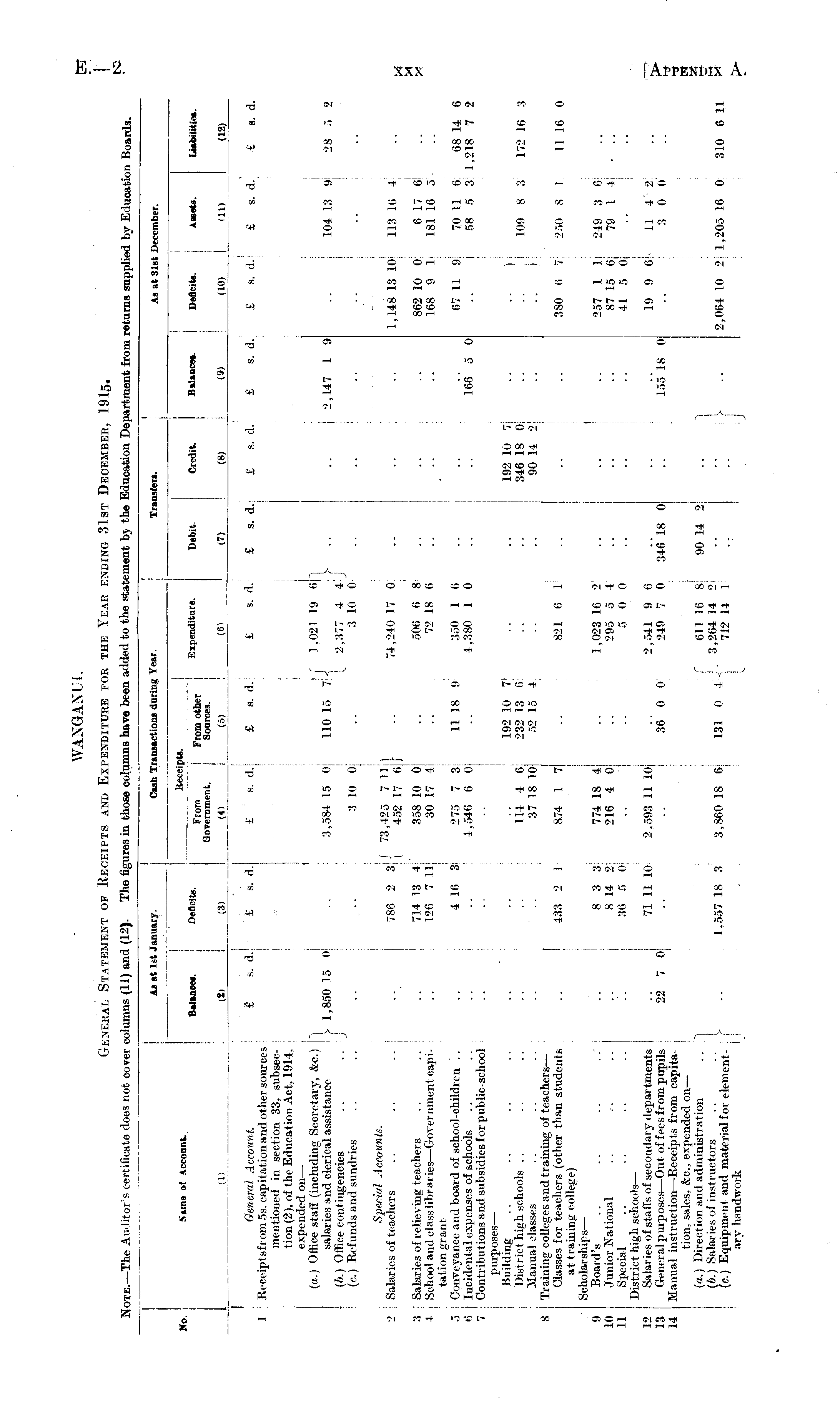 OTE. —. te A Ui. iter's eerti: icate d loes no! cover col lumns am igures in lose columns ive menl lucal ion ipartraent irom returns suppl lucation Boards. So Same of Account, I As at Is Balances. (t) As at 1st January. st Jar j .nua ary. Deficits. (3) I Cash Transactions during Yi Receipts. From From other Government. Sources. (4) (_ (5) Cash Transactions during Year. rear. Expenditure. (6)_ Ti Debit. (7) Transfers. 'ransfe ers. Credit. (8) -jBalancer (9) i j As at 31s Deficits. (10) As at 31st December. st D« I i :cember. Assets. ill) Liabilities. (12) (1) General Account. £ s. d.! 1 Receiptsf rom 5s. capitation and other sources 1 mentioned in section 33, subsection (2), of the Education Act, 1914, expended on — (a.) Office staff (including Secretary, &c.) "l salaries and clerical assistance y 1,850 15 0 (b.) Office contingencies (c.) Refunds and sundries Special Accounts. 2 I Salaries of teachers 3 Salaries of relieving teachers 4 School and class libraries —Government capitation grant 5 Conveyance and board of school-children .. 6 Incidental expenses of schools 7 Contributions and subsidiesforpublic-school purposes — Building District high schools Manual classes 8 Training colleges and training of teachers — Classes for teachers (other than students at training college) Scholarships — 9 Board's ,0 Junior National .. ,. 1 Special .. .. .. .. [ District high schools — 2 Salaries of staffs of secondary departments I 3 General purposes —Out of fees from pupils 22 7 0 4 Manual instruction —Receipts from capitation, sales, &c, expended on —• (a.) Direction and administration (6.) Salaries of instructors .. ..J (c.) Equipment and material foi elementary handwork £ s. d. £ ' s. d.j 3,584 15 0 3 10 0 -oo- o -j < 73,425 7 11 ) ,86 2 3 \ 452 17 6 f 714 13 4 ' 358 10 0 126 7 11 30 17 4 4 16 3 275 7 3 4,546 6 0 114 4 6 .. 37 18 10 433 2 1 874 1 7 8 3 3 774 18 4 8 14 2 216 4 0 36 5 0 71 11 10 2,593 11 10 ■ 1,557 18 3 3,860 18 6 i £ s. d. £ s. d. ' f 1,021 19 6 "1 110 15 7 j y I 2,377 4 4 I 3 10 0 74,240 17 0 506 6 8 72 18 6 11 18 9 350 1 6 4,380 1 0 192 10 V 232 13 6 52 15 4 821 6 1 1,023 16 2' 295 5 4 5 0 0 2,541 9 6 36 0 0 249 7 0 ; f 611 16 8 ,,, n , j, 3,264 14 2 W1 ° 4 "j 712 14 1 £ s. d. 346 18 0 90 14 2 £ s. d. £ s. d. 2,147 1 9 166 5 0 192 10 7 346 18 0 90 14 2 155 18 0 V J £ s. d. £ s. d. £ s. d. 104 13 9 28 5 2 - 1,148 13 10 113 16 4 862 10 0 6 17 6! 168 9 1 181 16 5 • 67 11 9; 70 11 6 68 14 6 58 5 3: 1,218 7 2 109 8 3 172 16 3 .. , 380 6 7 250 8 1 1 1 16 0 9 10 II 257 I 1 249 3 6 87 15 6 79 I 4 ... 41 5 0 ... 12 13 14 19 9 6 11 4' 2 3 0 0: 2,064 10 2 1,205 16 0 310 6 11