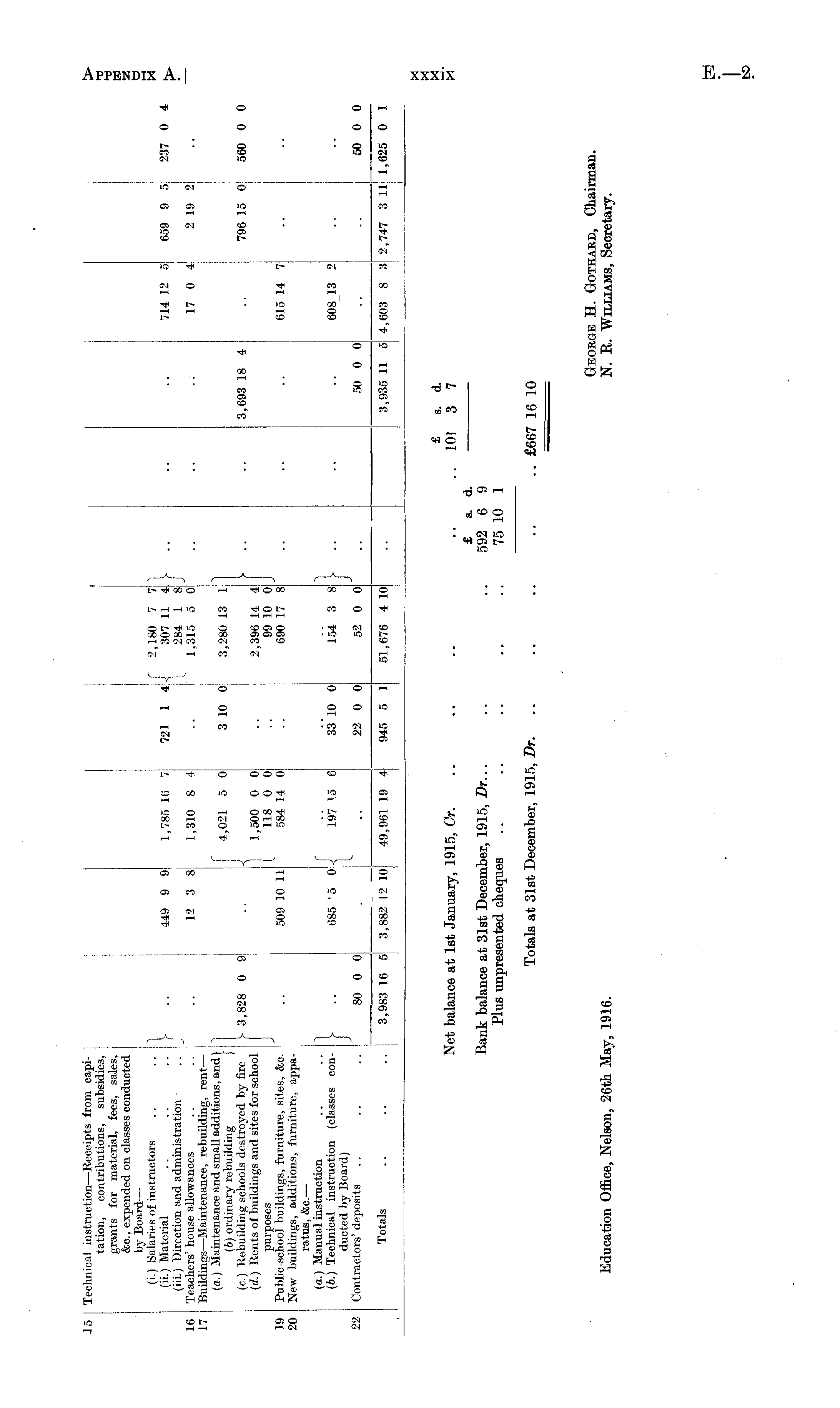 £ s. d. Net balance at Ist January, 1915, Cr. .. .. .. .. .. 101 3 7 £ s. d. Bank balance at 31st December, 1915, Dr... .. .. 592 6 9 Plus unpresented cheques .. .. .. .. .. 75 10 1 Totals at 31st December, 1915, Dr. .. .. .. .. .. £667 16 10 George H. Gothard, Chairman. Education Office, Nelson, 26th May, 1916. N. R. Williams, Secretary.