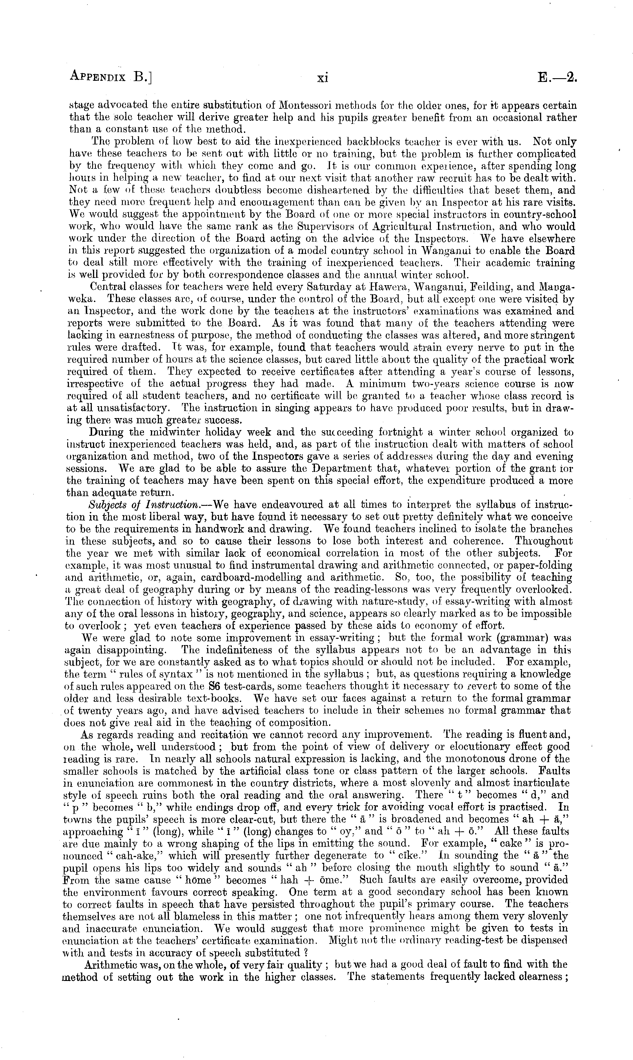 stage advocated the entire substitution of Montessori methods for the older ones, for it appears certain that the sole teacher will derive greater help and his pupils greater benefit from an occasional rather than a constant use of the method. The problem of how best to aid. the inexperienced backbloeks teacher is ever with us. Not only have these teachers to be sent out with little or no training, but the problem is further complicated by the frequency with, which they come and go. It is our common experience, after spending long hours in helping a new teacher, to find at our next visit that another raw recruit has to be dealt with. Not a few of these, teachers doubtless become disheartened by the difficulties that beset them, and they need more frequent help arid encouragement than can be given by an Inspector at his rare visits. We would suggest the appointment by the, Board, of one or more special instructors in country-school work, who would have the same rank as the Supervisor's of Agricultural Instruction, and who would work under the direction of the Board acting on the advice of the Inspectors. We have elsewhere in this report suggested the organization of a model country school in Wanganui to enable the Board to deal still more effectively with the training of inexperienced teachers. Their academic training is well provided for by both correspondence classes and the annual winter school. Central classes for teachers were held every Saturday at Hawera, Wanganui, Feilding, and Mangaweka. These classes are, of course, under the control of the Board, but all except one were visited by an Inspector, and the work done by the teachers at the instructors' examinations was examined and reports were submitted to the Board. As it was found that marry of the teachers attending were lacking in earnestness of purpose, the method of conducting the classes was altered, and more stringent rules were drafted. It was, for example, found that teachers would strain every nerve to put in the required number of hours at the science classes, but cared little about the quality of the practical work required of them. They expected to receive certificates after attending a year's course of lessons, irrespective of the actual -progress they had made. A minimum two-years science course is now required of all student teachers, and iro certificate will be granted to a teacher whose, class record is at all unsatisfactory. The instruction in singing appears to have produced poor results, but in drawing there was much greater success. During the midwinter holiday week and the succeeding fortnight a winter school organized to instruct inexperienced teachers was held, and, as part of the instruction dealt with matters of school organization and method, two of the Inspectors gave a series of addresses during the day and evening sessions. We are glad to be able to assure the Department that, whatever portion of the grant tor the training of teachers may have been spent on this special effort, the expenditure produced a more than adequate return. Subjects of Instruction. —We have endeavoured at all times to interpret the syllabus of instruction in the most liberal way, but have found it necessary to set out pretty definitely what we conceive to be the requirements in handwork and drawing. We found teachers inclined to isolate the branches in these subjects, and so to cause their lessons to lose both interest and coherence. Throughout the year we met with similar lack of economical correlation in most of the other subjects. For example, it was most unusual to find instrumental drawing arrd arithmetic connected, or paper-folding and arithmetic, or, again, cardboard-modelling and arithmetic. So, too, the possibility of teaching a great deal of geography during or by means of the reading-lessons was very frequently overlooked. The connection of history with geography, of drawing with nature-study, of essay-writing with almost any of the oral lessons irr history, geography, and science, appeal's so clearly marked as to be impossible to overlook; yet even teachers of experience passed by these aids to economy of effort. We were glad to rrote some improvement in essay-writing ; but the formal work (grammar) was again disappointing. The indefiniteness of the syllabus appears not to be arr advantage in this subject, for we are constantly asked as to what topics should or should not be included. For example, the, term " rules of syntax " is not mentioned in the syllabus ; but, as questions requiring a knowledge of such rules appeared on the S6 test-cards, some teachers thought it necessary to revert to some of the older and less desirable text-books. We have set our faces against a return to the formal grammar of twenty years ago, and have advised teachers to include in their schemes no formal grammar that does not give real aid in the teaching ot composition. As regards reading and recitation we cannot record any improvement. The reading is fluent and, on the whole, well understood ; but from the point of view of delivery or elocutionary effect good leading is rare. In nearly all schools natural expression is lacking, and the monotonous drone of the. smaller schools is matched by the artificial class tone or class pattern of the larger schools. Faults in enunciation are commonest in the country districts, where a most slovenly and almost inarticulate style of speech ruins both the oral reading and the oral answering. There "t " becomes " d," and "p " becomes " b," while endings drop off, and every trick for avoiding vocal effort is practised. In towns the, pupils' speech is more clear-cut, but there the " a " is broadened and becomes " ah + a," approaching "I " (long), while "I " (long) changes to " oy." and "6"to " ah -4- 6." All these faults are due mainly to a wrong shaping of the lips in emitting the sound. For 1 example, " cake "is pronounced " oah-ake," which will presently further degenerate to " cike." Irr sounding
