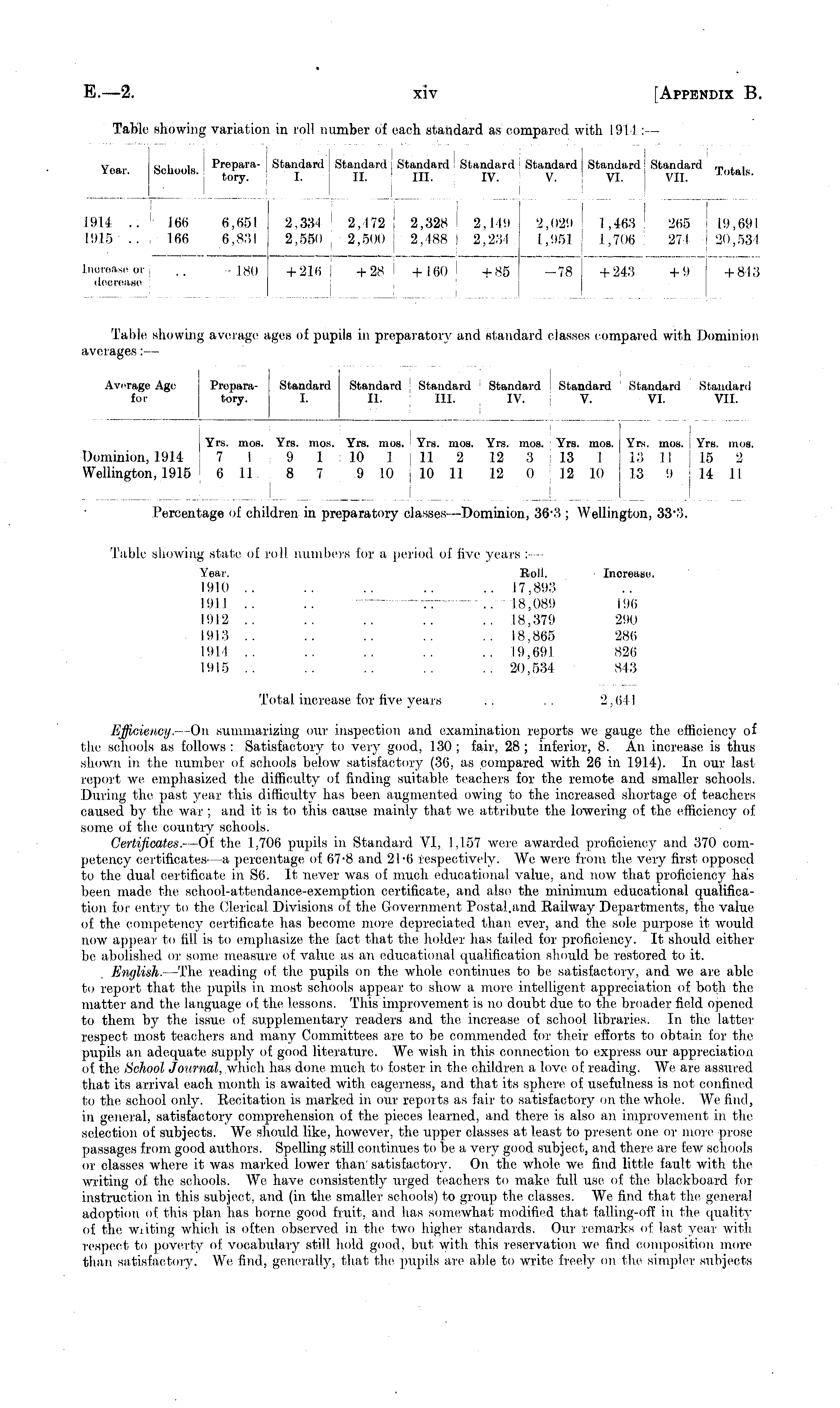 v„o„ ,i„i..,..i„ Prepara- Standard Standard: Standard ' Standard Standard Standard' Standard ,„ , , Yea,. Schools. - n m Ty y „ yn rotate. 1914 .. \ 166 6,651 2,331 "' 2,172 1 2,328 I 2,11!) 2,02*) 1,463' 265 19,691 1915 .-:.-' 166 6,831 2,550 , 2,500 2,188 1 2,231 1,1)51 1,706 271 20,531 Standard Standard' Standard ,„ . , V. VI. VII. 'otais. 2,0211 1,463 ' 265 19,691 1,1)51 1,706 271 20,531 In«6»s»'0i .. -.180 +216 +28 +1*60 +85 -78 +243 +9 +813 decrease J __ ... I L_ Table showing average ages of pupils in preparatory and standard classes compared with Dominion averages: — Average Age Prepara- [ Standard Standard ! Standard Standard ' Standard Standard Standard for tory. I. II. HI. IV. V. VI. VII. I ' 1 1 Yrs. mos. Yrs. mos. Yrs. mos. Yrs. mos. Yrs. mos. Yrs. mos. Yrs. mos. Yrs. mos. Dominion, 1914 7 1 9 1 10 I | 11 2 12 3 13 I 13 11 15 2 Wellington, 1915 j 6 11 8 7 9 10 ,10 11 12 0 12 10 13 It ,14 11 Percentage of children in preparatory classes —Dominion, 36-3 ; Wellington, 33-3.