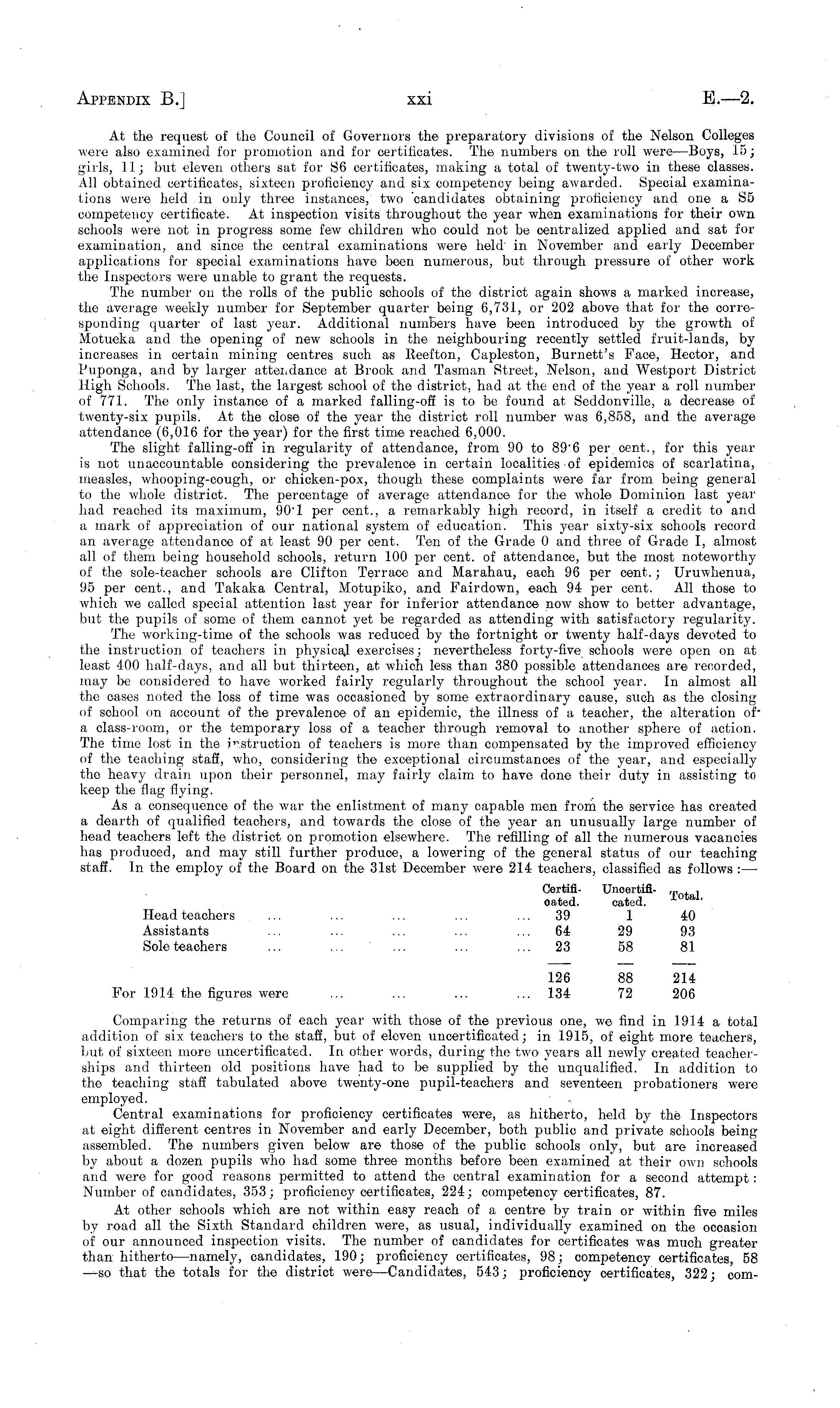 At the request of the Council of Governors the preparatory divisions of the Nelson Colleges were also examined for promotion and for certificates. The numbers on the roll were —Boys, 15; girls, If; but eleven others sat for S6 certificates, making a total of twenty-two in these classes. All obtained certificates, sixteen proficiency and six competency being awarded. Special examinations were held in only three instances, two candidates obtaining proficiency and one a S5 competency certificate. At inspection visits throughout the year when examinations for their own schools were not in progress some few children who could not be centralized applied and sat for examination, and since the central examinations wore held' in November and early December applications for special examinations have been numerous, but through pressure of other work the Inspectors were unable to grant the requests. The number oir the rolls of the public schools of the district again shows a marked increase, the average weekly number for September quarter being 6,731, or 202 above that for the corresponding quarter of last year. Additional numbers have been introduced by the growth of Motueka and the opening of new schools in the neighbouring recently settled fruit-lands, by increases in certain mining centres such as Reefton, Capleston, Burnett's Face, Hector, and Puponga, and by larger attendance at Brook and Tasman Street, Nelson, and Westport District High Schools. The last, the largest school of the district, had at the end of the year a roll number of 771. The only instance of a marked falling-off is to be found at Seddonville, a decrease of twenty-six pupils. At the close of the year the district roll number was 6,858, and the average attendance (6,016 for the year) for the first time reached 6,000. The slight falling-off in regularity of attendance, from 90 to 896 per cent., for this year is not unaccountable considering the prevalence in certain localities of epidemics of scarlatina, rrreasles, whooping-cough, or chicken-pox, though these complaints were far from being general to the whole district. The percentage of average attendance for the whole Dominion last yearhad reached its maximum, 901 per cent., a remarkably high record, in itself a credit to and a mark of appreciation of our national system of education. This year sixty-six schools record an average attendance of at least 90 per cent. Ten of the Grade 0 and three of Grade I, almost all of them being household schools, return 100 per cent, of attendance, but the most noteworthy of the sole-teacher schools are Clifton Terrace and Marahau, each 96 per cent.; Uruwhenua, 95 per cent., and Takaka Central, Motupiko, and Fairdown, each 94 per cent. All those to which we called special attention last year for inferior attendance now show to better advantage, but the pupils of some of them cannot yet be regarded as attending with satisfactory regularity. The working-time of the schools was reduced by the fortnight or twenty half-days devoted to the instruction of teachers in physical exercises; nevertheless forty-five schools were open on at least 400 half-days, and all but thirteen, at which less than 380 possible attendances are recorded, may be considered to have worked fairly regularly throughout the school year. In almost all the cases noted the loss of time was occasioned by some extraordinary cause, such as the closing of school on account of the prevalence of an epidemic, the illness of a teacher, the alteration ofa class-room, or the temporary loss of a teacher through removal to another sphere of action. The time lost in the instruction of teachers is more than compensated by the improved efficiency of the teaching staff, who, considering the exceptional circumstances of the year, and especially the heavy drain upon their personnel, may fairly claim to have done their duty in assisting to keep the flag flying. As a consequence of the war the enlistment of many capable men from the service- has created a dearth of qualified teachers, and towards the close of the year an unusually large number of head teachers left the district on promotion elsewhere. The refilling of all the numerous vacancies has produced, and may still further produce, a lowering of the general status of our teaching staff. In the employ of the Board on the 31st December were 214 teachers, classified as follows : — Certifi- IJneertifl- ~, , . oated. cated. lotaL Head teachers ... ... ... ... ... 39 1 40 Assistants ... ... ... ... ... 64 29 93 Sole teachers ... ... ... ... ... 23 58 81 126 88 214 For 1914 the figures were ... ... ... ... 134 72 206 Comparing the returns of each year with those of the previous one, we find in 1914 a total addition of six teachers to tiro staff, but of eleven uncertificated; in 1915, of eight more teachers, but of sixteen more uncertificated. In other words, during the two years all newly created teacherships and thirteen old positions have had to be supplied by the unqualified. In. addition to the teaching staff tabulated above twenty-one pupil-teachers and seventeen probationers were employed. Central examinations for proficiency certificates were, as hitherto, hold by the Inspectors at eight different centres in November and early December, both public and private schools being assembled. The numbers given below are those of the public schools only, but are increased by about a dozen pupils who had some three months before been examined at their own schools and were for good reasons permitted to attend the central examination for a second attempt: Number of candidates, 353; proficiency certificates, 224; competency certificates, 87. At other schools which are not within easy reach of a centre by train or within five miles by road all the Sixth Standard children were, as usual, individually examined on the occasion of our announced inspection visits. The number of candidates for certificates was much greater than hitherto —namely, candidat