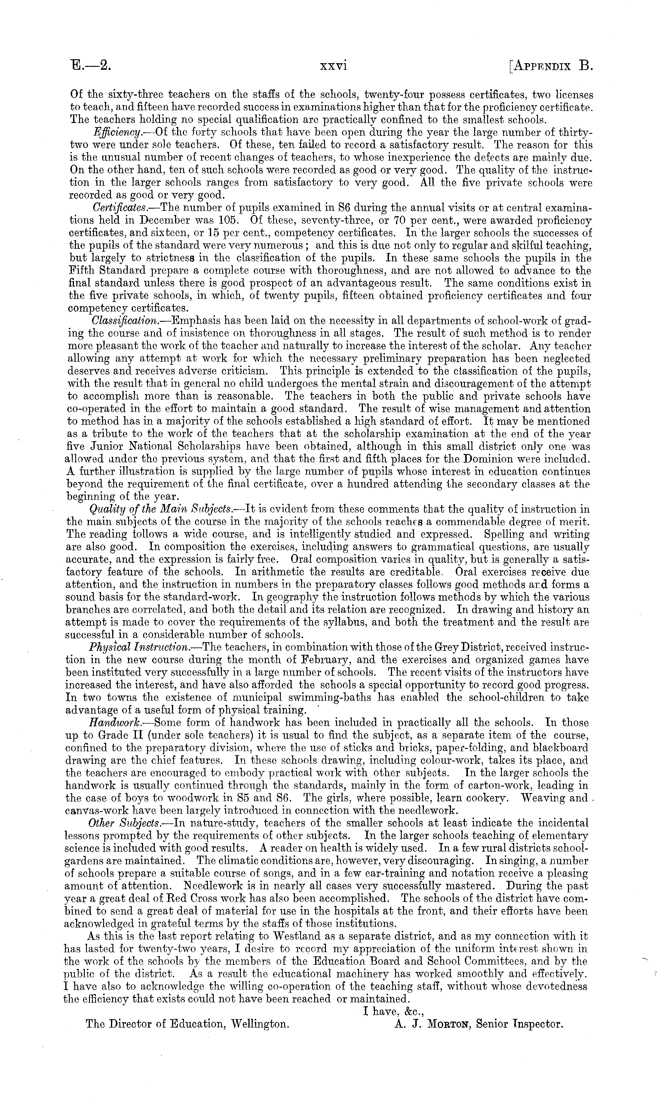Of the sixty-three teachers on the staffs of the schools, twenty-four possess certificates, two licenses to teach, and fifteen have recorded success in examinations higher than that for the proficiency certificate. The teachers holding no special qualification are practically confined to the smallest schools. Efficiency. —Of the forty schools that have been open during the year the large number of thirtytwo were under sole teachers. Of these, ten failed to record a satisfactory result. The reason for this is the unusual number of recent changes of teachers, to whose inexperience the, defects are mainly due. On the other hand, ten of such schools were recorded as good or very good. The quality of the instruction in the larger schools ranges from satisfactory to very good. All the five private schools were recorded as good or very good. Certificates.- —The number of pupils examined in S6 during the annual visits or at central examinations held in December was 105. Of these, seventy-three, or 70 per cent., were awarded proficiency certificates, and sixteen, or 15 per cent., competency certificates. In the larger schools the successes of the pupils of the standard were very numerous ; and this is due not only to regular and skilful teaching, but largely to strictness in the classification of the pupils. In these same schools the pupils in the Fifth Standard prepare a complete course with thoroughness, and are not allowed to advance to the final standard unless there is good prospect of an advantageous result. The same conditions exist in the five private schools, in which, of twenty pupils, fifteen obtained proficiency certificates and four competency certificates. Classification. —Emphasis has been laid on the necessity in all departments of school-work of grading the course and of insistence on thoroughness in all stages. The result of such method is to render more pleasant the work of the teacher and naturally to increase the interest of the scholar. Any teacher allowing any attempt at work for which the necessary preliminary preparation, has been neglected deserves and receives adverse criticism. This principle is extended to the classification of the pupils, with the result that in general no child undergoes the mental strain and discouragement of the attempt to accomplish more than is reasonable. The teachers in both the public and private schools have co-operated in the effort to maintain, a good standard. The result of wise management and attention to method has in a majority of the schools established a high standard of effort. It may be mentioned as a tribute to the work of the teachers that at the scholarship examination at the end of the yearfive Junior National Scholarships have been obtained, although in this small district only one was allowed undor the previous system, and that the first and fifth places for the Dominion were included. A further illustration is supplied by the large number of pupils whose interest in education continues beyond the requirement of the final certificate, over a hundred, attending the secondary classes at the beginning of the year. Quality of the Main Subjects. —lt is evident from these comments that the quality of instruction in the main subjects of the course in the majority of the schools reaches a commendable degree of merit. The reading follows a wide course, and is intelligently studied and expressed. Spelling and. writing are also good. In composition the exercises, including answers to grammatical questions, are usually accurate, and the expression is fairly free. Oral composition varies in quality, but is generally a satisfactory feature of the schools. In arithmetic the results are creditable. Oral exercises receive due attention, and the instruction in numbers in the preparatory classes follows good methods ard forms a sound basis for the standard-work. In geography the instruction follows methods by which the various branches aro correlated, and both the detail and its relation are recognized. In drawing and history an attempt is made to cover the requirements of the syllabus, and both the treatment and the result are successful in a considerable number of schools. Physical Instruction. —The teachers, in combination with those of the Grey District, received instruction in the new course during the month of February, and the exercises and organized games have been instituted very successfully in a large number of schools. The recent visits of the instructors have increased the interest, and have also afforded the schools a special opportunity to record good progress. In two towns the existence of municipal swimming-baths has enabled the school-children to take advantage, of a useful form of physical training. Handwork. —Some form of handwork has been included in practically all the schools. In those up to Grade II (under sole teachers) it is usual to find the subject, as a separate item of the course, confined to the preparatory division, where the use of sticks and bricks, paper-folding, and blackboard drawing are the chief features. In these schools drawing, including colour-work, takes its place, and the teachers are encouraged to embody practical work with other subjects. In the larger schools the handwork is usually continued through the standards, mainly in the form of carton-work, leading in the case of boys to woodwork in S5 and S6. The girls, where possible, learn cookery. Weaving and . canvas-work have been largely introduced in connection with the needlework. Other Subjects. —ln nature-study, teachers of the smaller schools at least indicate the incidental lessons prompted by the requirements of other subjects. In the larger schools teaching of elementary science is included with good results. A reader on health is widely used. In a few rural districts schoolgardens are maintained. The climatic conditions are, however, very discouraging. In singing, a number of schools prepare a suitable course of songs, and in