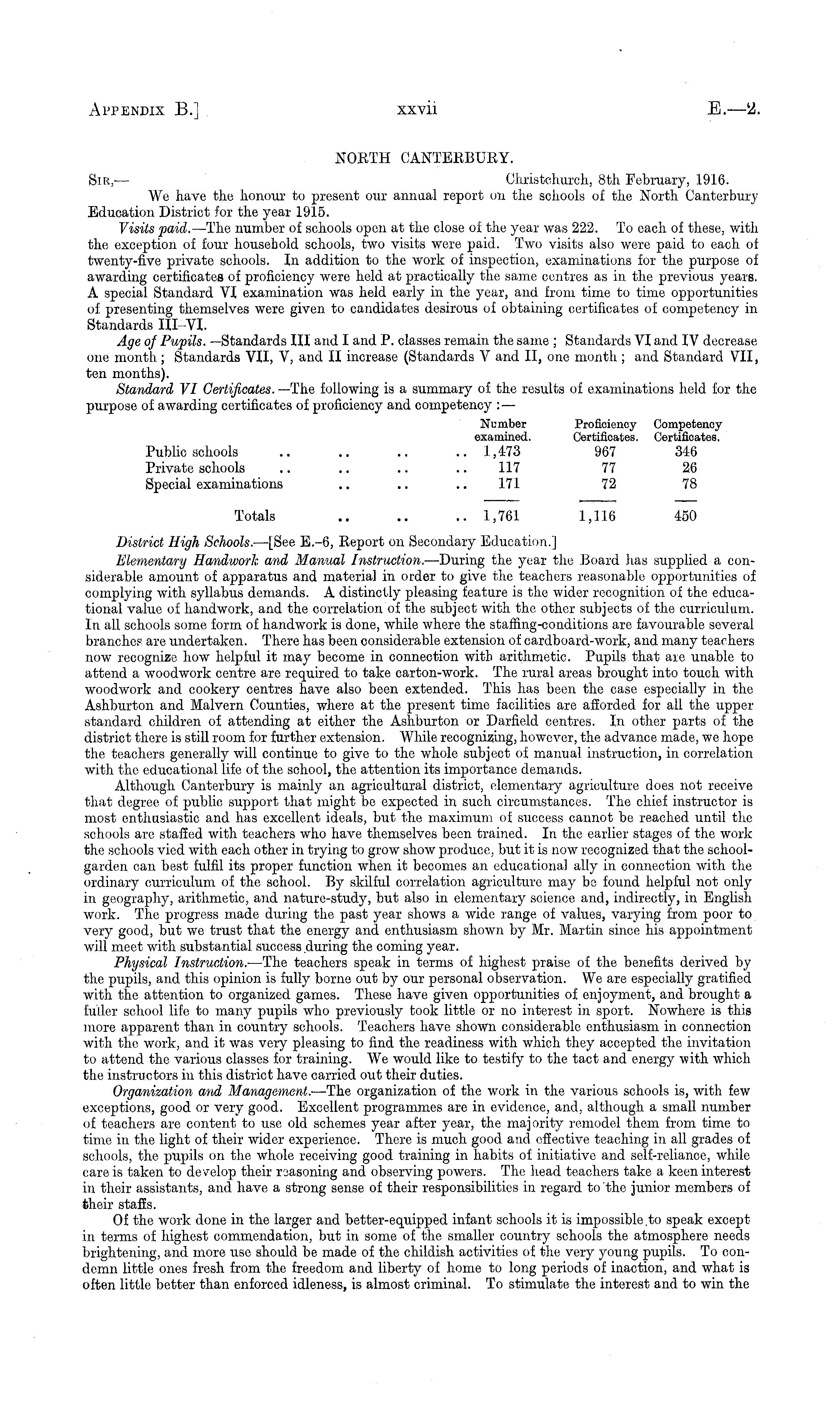 NORTH CANTERBURY. Sir, — Christchurch, Bth February, 1916. We have the honour to present our annual report on the schools of the North Canterbury Education District for the year 1915. Visits paid. —The number of schools open at the close of the year was 222. To each of these, with the exception of four household schools, two visits were paid. Two visits also were paid to each of twenty-five private schools. In addition to the work of inspection, examinations for the purpose of awarding certificates of proficiency were held at practically the same centres as in. the previous years. A special Standard VI examination was held early in the year, and from time to time opportunities of presenting themselves were given to candidates desirous of obtaining certificates of competency in Standards UL-VI. Age of Pupils. —Standards 111 arrd I and P. classes remain the same ; Standards VI and IV decrease one month; Standards VII, V, and II increase (Standards V and 11, one month ; and Standard VII, ten months). Standard VI Certificates. —The following is a summary of the results of examinations held for the purpose of awarding certificates of proficiency and competency ;— Number Proficiency Competency examined. Certificates. Certificates. Public schools .. .. .. ..1,473 967 346 Private schools .. .. .. 117 77 26 Special examinations .. .. .. 171 72 78 Totals .. .. .. 1,761 1,116 450 District High Schools. —[See E.-6, Report on Secondary Education.] Elementary Handwork and Manual Instruction. —During the year the Board has supplied a considerable amount of apparatus and material in order to give the teachers reasonable opportunities of complying with syllabus demands. A distinctly pleasing feature is the wider recognition of the educational value of handwork, and the correlation of the subject with the other subjects of the curriculum. In all schools some form of handwork is done, while where the staffing-conditions are favourable several branches are undertaken. There has been considerable extension of cardboard-work, and many teachers now recognize how helpful it may become in connection with arithmetic. Pupils that are unable to attend a woodwork centre are required to take carton-work. The rural areas brought into touch with woodwork and cookery centres have also been extended. This has been the case especially in the Ashburton and Malvern Counties, where at the present time facilities arc afforded for all the upperstandard children of attending at either the Ashburton or Darfield centres. In other parts of the district there is still room for further extension. While recognizing, however, the advance made, we hope the teachers generally will continue to give to the whole subject of manual instruction, in correlation with the educational life of the school, the attention its importance demands. Although Canterbury is mainly an agricultural district, elementary agriculture does not receive that degree of public support that might be expected irr such circumstances. The chief instructor is most enthusiastic and has excellent ideals, but the maximum of success cannot be reached until the schools are staffed with teachers who have themselves been trained. In the earlier stages of the work the schools vied with each other in trying to grow show produce, but it is now recognized that the schoolgarden can best fulfil its proper function when it becomes an educational ally in connection with the ordinary curriculum of the school. By skilful correlation agriculture may be fourrd helpful not only in geography, arithmetic, arrd nature-study, but also in elementary science and, indirectly, in English work. The progress made during the past year shows a wide range of values, varying from poor to very good, but we trust that the energy and enthusiasm shown by Mr. Martin since his appointment will meet with substantial success during the coming year. Physical Instruction. —The teachers speak in terms of highest praise of the benefits derived by the pupils, and this opinion is fully borne out by our personal observation. We are especially gratified with the attention to organized games. These have given opportunities of enjoyment, and brought a fuller school life to many pupils who previously took little or no interest in sport. Nowhere is this more apparent than in country schools. Teachers have shown considerable enthusiasm in connection with the work, and it was very pleasing to find the readiness with which they accepted the invitation to attend the various classes for training. We would like to testify to the tact and energy with which the instructors in this district have carried out their duties. Organization and Management. —The organization of the work in the various schools is, with few exceptions, good or very good. Excellent programmes are in evidence, and, although a small number of teachers are content to use old schemes year after year, the majority remodel them from time to time in the light of their wider experience. There is much good and effective teachirrg in all grades of schools, the pupils on the whole receiving good training in habits of initiative and self-reliance, while care is taken to develop their reasoning and observing powers. The head teachers take a keen interest in their assistants, and have a strong sense of their responsibilities in regard to'the junior members of their staffs. Of the work done in the larger and better-equipped infant schools it is impossible.to speak except in terms of highest commendation, but in some of the smaller country schools the atmosphere needs brightening, and more use should be made of the childish activities of the very young pupils. To condemn little ones fresh from the freedom and liberty of honre to long periods of inaction, and what is often little better than enforced idleness, is almost criminal. To stimulate the interest and to win the