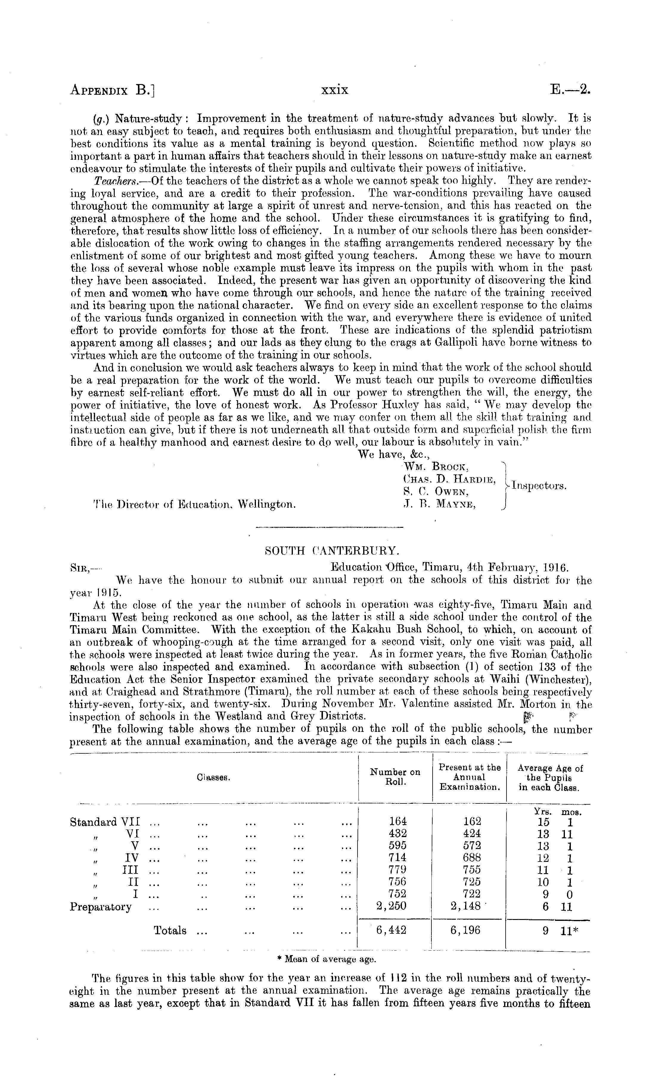 SOCTII CANTERBURY. Sir,- Education Office, Timaru, 4th February, 1916. We have the honour to submit our annual report on the schools of this district foi' the year' 1915. At the close of the year the number of schools iir operation -was eighty-five, Timaru Main and Timaru West being reckoned as one school, as the latter is still a side school under the control of the Timaru Main Committee. With the exception of the Kakahu Bush School, to which, oir account of an outbreak of whooping-cough at the time arranged for a second visit, only one visit was paid, all the schools were inspected at least twice during the year-. As in former years, the five Roman Catholic sohools were also inspected and examined. In accordance with subsection (1) of section 133 of the Education Act the Senior Inspector examined the private secondary schools at Waihi (Winchester'), arrd at Craighead and Strathmore (Timaru), the roll number at each of these schools being respectively thirty-seven, forty-six, and twenty-six. Dining November Mi-. Valentine assisted Mr. Morton in the inspection of schools in the Westland and Grey Districts. !■■ The following table shows the number of pupils on the roll of the public schools, the number present at the, annual examination, and the average age of the pupils in each class:—