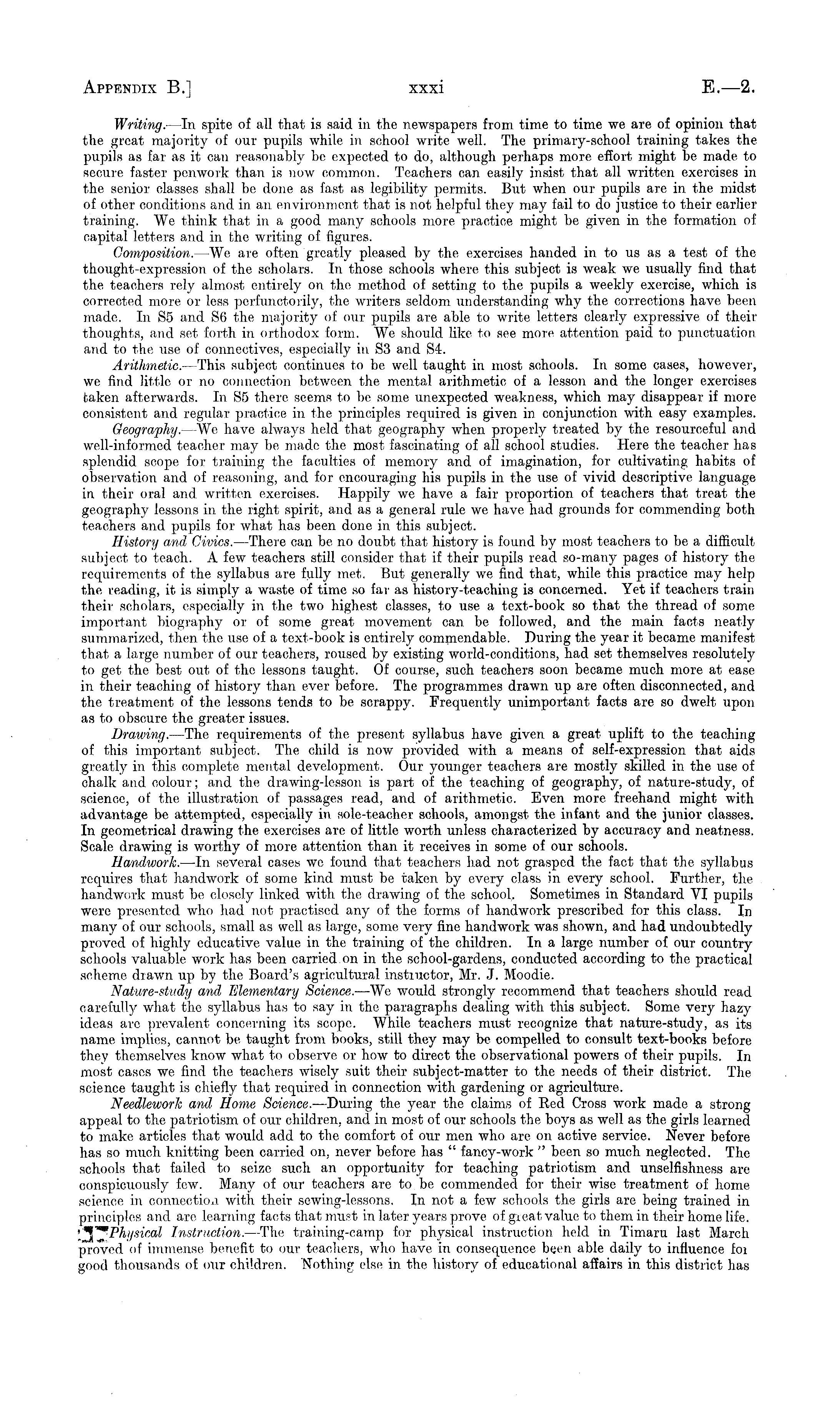 Writing. —ln spite of all that is said in the newspapers from time to time we are of opinion that the great majority of our pupils while in school write well. The primary-school training takes the pupils as far as it can reasonably be expected to do, although perhaps more effort might be made to secure faster penwork than is now commorr. Teachers can easily insist that all written exercises in the senior classes shall be, doire as fast as legibility permits. But when our- pupils are in the midst of other conditions and in an environment that is not helpful they may fail to do justice to their earliertraining. We think that irr a good many schools more practice, might be given in the formation of capital letters and in the writing of figures, Composition. —We are often greatly pleased by the exercises hairded in. to us as a test of the thought-expression of the scholars. In those schools where this subject is weak we usually find that the, teachers rely almost entirely on the method of setting to the pupils a weekly exercise, which is corrected more or less perfunctorily, the writers seldom understanding why the corrections have been made. In S5 and S6 the majority of our pupils are able to write letters clearly expressive of their thoughts, and set forth irr orthodox form. We should like to see more attention paid to punctuation and to the use of connectives, especially irr S3 and S4. Arithmetic. —This subject continues to be well taught in most schools. Irr some cases, however, we find little or no connection between the mental arithmetic of a lesson and the longer exercises taken afterwards. In S5 there seems to be some unexpected weakness, which may disappear if more consistent and regular practice in the principles required is given in conjunction with easy examples. Geography. —We have always held that geography when properly treated by the resourceful and well-informed teacher may be, made the most fascinating of all school studies. Here the teacher has splendid scope for training the faculties of memory and of imagination, for cultivating habits of observation and of reasoning, and for encouraging his pupils in the use of vivid descriptive language in their oral and. written exercises. Happily we have a fair proportion of teachers that treat the geography lessons in the right; spirit, and as a general rule we have had grounds for commending both teachers and pupils for what has been done in this subject. History and Civics. —There can be no doubt that history is found by most teachers to be a difficult subject to teach. A few teachers still consider that if their pupils read so-many pages of history the requirements of the syllabus are fully met. But generally we find that, while this practice may help the reading, it is simply a waste of time so far- as history-teaching is concerned. Yet if teachers train their- scholars, especially in the two highest classes, to use a text-book so that the thread of some important biography or of some great movement can be followed, and the main facts neatly summarized, then the use of a text-book is entirely commendable. During the year it became manifest that a large number of our teachers, roused by existing world-conditions, had set themselves resolutely to get the best out of the lessons taught. Of course, such teachers soon became much more at ease in their teaching of history than ever before. The programmes drawn up are often disconnected, and the treatment of the lessons tends to be scrappy. Frequently unimportant facts are so dwelt upon as to obscure the greater issues. Drawing. —The requirements of the present syllabus have given a great uplift to the, teaching of this important subject. The child is now provided with a means of self-expression that aids greatly in this complete mental development. Our younger teachers are mostly skilled in the use of chalk arrd colour; and the drawing-lesson is part of the teaching of geography, of nature-study, of science, of the illustration of passages read, and of arithmetic. Even more freehand might with advantage be attempted, especially in sole-teacher schools, amongst the infant and the junior classes. In geometrical drawing the exercises are of little worth unless characterized by accuracy and neatness. Scale, drawing is worthy of more attention than it receives in some of our schools. Handwork. —ln several cases we found that teachers had not grasped the fact that the syllabus requires that handwork of some kind must be taken by every class in every school. Further, the handwork must be closely linked with the drawing of the school. Sometimes in Standard VI pupils were presented who had not practised any of the forms of handwork prescribed for this class. In many of our schools, small as well as large, some very fine handwork was shown, and had undoubtedly proved of highly educative value in the training of the children. In a large number of our country schools valuable work has been carried on in the school-gardens, corrducted according to the practical scheme drawn up by the Board's agricultural instiuctor, Mr-. J. Moodie. Nature-study and Elementary Science. —We would strongly recommend that teachers should read carefully what the syllabus has to say in the paragraphs dealitrg with this subject. Some very hazy ideas are prevalent concerning its scope. While teachers must recognize that nature-study, as its name implies, cannot be taught from books, still they may be compelled to consult text-books before they themselves know what to observe or how to direct the observational powers of their pupils. In most cases we find the teachers wisely suit their subject-matter to the needs of their district. The science taught is chiefly that required in connection with gardening or agriculture. Needlework and Home Science. —During the year the claims of Red Cross work made a strong appeal to the patriotism of our children, and in most of our schools the boys as well as the girls l