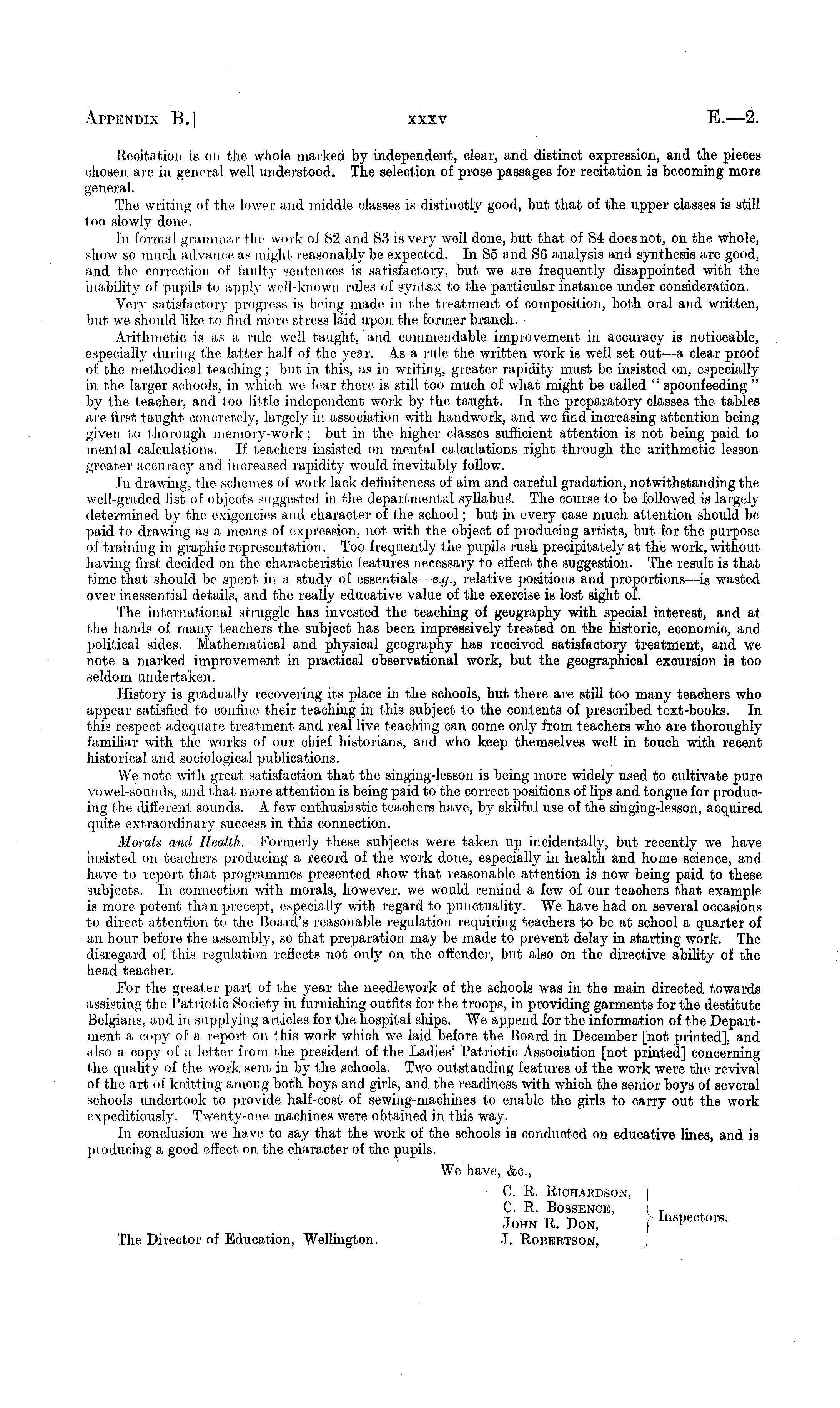 Recitation is on the whole marked by independent, clear, and distinct expression, and the pieces chosen are in general well understood. The selection of prose passages for recitation is becoming more general. The writing of the lower arrd middle, classes is distinctly good, but that of the upper classes is still too slowly done. In formal grammar the work of 82 and S3 is very well done, but that of S4 does not, on the whole, show so much advance as might reasonably be expected. In 85 and S6 analysis and synthesis are good, and the correction of faulty sentences is satisfactory, but we are frequently disappointed with the inability of pupils to apply well-known rules of syntax to the particular instance under consideration. Very satisfactory progress is being made, in the treatment of composition, both oral and written, but we should like, to find more stress laid upon the former branch. ■ Arithmetic is as a rule well taught, and commendable improvement in accuracy is noticeable, especially during the latter half of the year-. As a rule the written work is well set out —a clear proof of the. methodical teaching ; but in this, as in writing, greater rapidity must be insisted on, especially in the larger sohools, in which we fear there is still too much of what might be called " spoonfeeding " by the teacher-, and too little independent work by the taught. In the preparatory classes the tables are first taught concretely, largely irr association with handwork, arrd we find increasing attention being given to thorough memory-work; but irr the higher' classes sufficient attention is not being paid to mental calculations. If teachers insisted on mental calculations right through the arithmetic lesson greater accuracy and increased rapidity would inevitably follow. In drawing, the schemes of work lack definiteness of aim and careful gradation, notwithstanding the well-graded list of objects suggested in the departmental syllabus 1 . The course to be- followed is largely determined by the exigencies and. character of the school; but in every case much attention should be paid to drawing as a means of expression, not with the, object of producing artists, but for the purpose of training in graphic representation. Too frequently the pupils rush precipitately at the work, without having first decided on the characteristic features necessary to effect the suggestion. The result is that time that should, be spent in a study of essentials— e.g., relative positions and proportions—is wasted over inessential details, and the really educative value of the exercise is lost sight of. The international struggle has invested the teaching of geography with special interest, and at the hands of many teachers the subject has been impressively treated on the historic, economic, and political sides. Mathematical and physical geography has received satisfactory treatment, and we note a marked improvement in practical observational work, but the geographical excursion is too seldom undertaken. History is gradually recovering its place in the schools, but there are still too many teachers who appear satisfied to confine their teaching in this subject to the contents of prescribed text-books. In this respect adequate treatment and real live teaching can come only from teachers who are thoroughly familiar with the works of our chief historians, and who keep themselves well in touch with recent historical and sociological publications. We note with great satisfaction that the singing-lesson is being more widely used to cultivate pure, vowel-sounds, and that more attention is being paid to the correct positions of lips and tongue for producing the different sounds. A few enthusiastic teachers have, by skilful use of the singing-lesson, acquired quite extraordinary success in this connection. Morals and Health- -Formerly these subjects were taken up incidentally, but recently we have insisted on teachers producing a record of the work done, especially in health and home science, and. have to report that programmes presented show that reasonable attention is now being paid to these subjects. In. connection, with morals, however, we would remind a few of our teachers that example is more potent than precept, especially with regard to punctuality. We have had on several occasions to direct attention to the Board's reasonable regulation requiring teachers to be at school a quarter of an hour before the assembly, so that preparation may be made to prevent delay in starting work. The disregard of this regulation reflects not only on the offender, but also on the directive ability of the head teacher. For the greater part of the year the needlework of the schools was in the main directed towards assisting the Patriotic Society in furnishing outfits for the troops, in providing garments for the destitute Belgians, and in supplying articles for the hospital ships. We append for the information of the Department a copy of a report on this work which we laid before the Board in December [not printed], and also a copy of a letter from the president of the Ladies' Patriotic Association [not printed] concerning the quality of the work sent in by the schools. Two outstanding features of the work were the revival of the art of knitting among both boys and girls, and the readiness with which the senior boys of several schools undertook to provide half-cost of sewing-machines to enable the girls to carry out the work expeditiously. Twenty-one machines were obtained in this way. In conclusion we have to say that the work of the schools is conducted on educative lines, and is producing a good effect on the character of the pupils. We have, &c, C. R. Richardson, ") C. R. BOSSENCE, ! r John R. Don, \ las P<**<"*The Director of Education, Wellington. J. Robertson, J