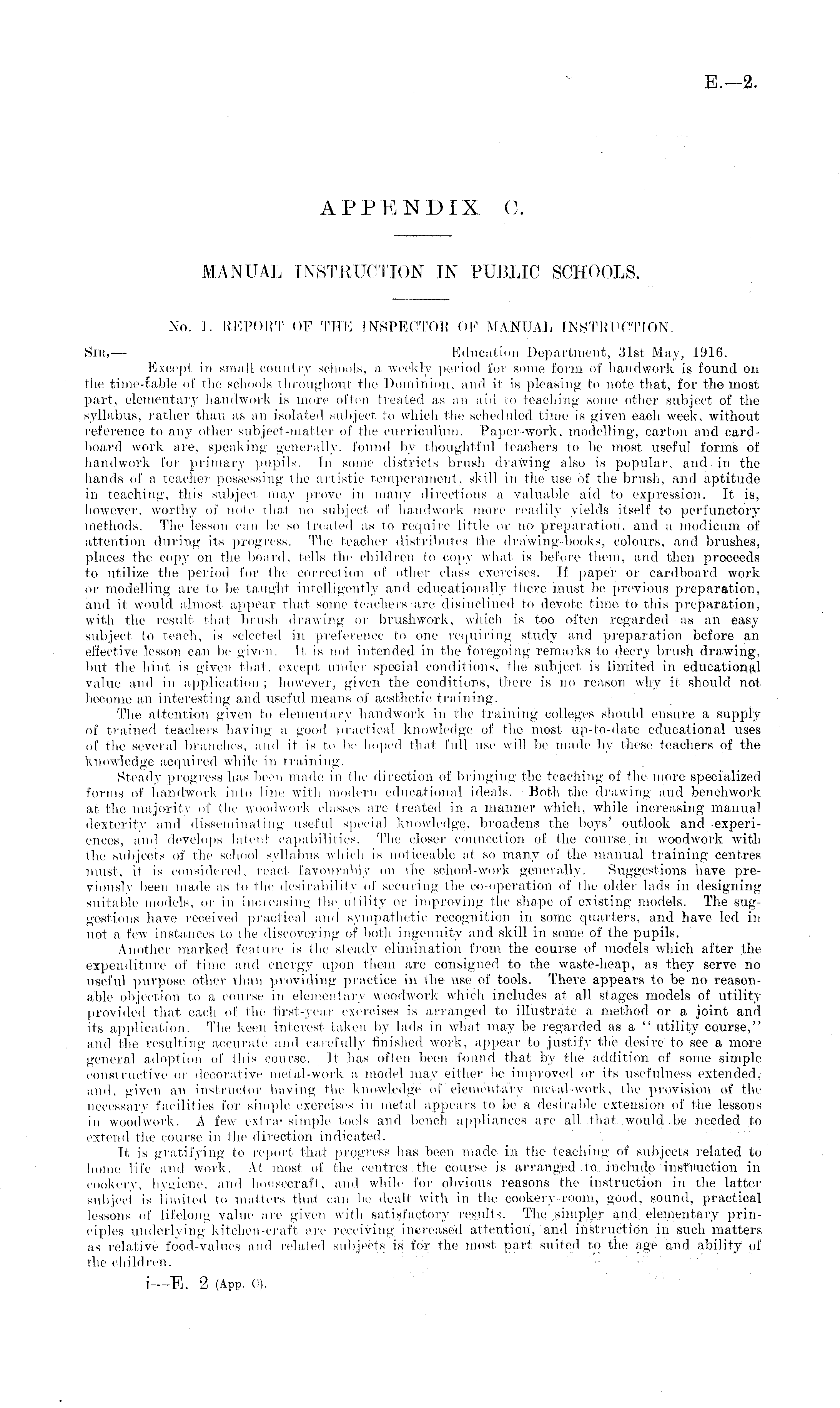 APPENDIX C. MANUAL INSTRUCTION IN PUBLIC SCHOOLS. No. 1. REPORT OF THE INSPECTOR OF MANUAL INSTRUCTION. Sir, — Education Department, 31st May, 1916. Except in small country schools, a weekly period for some form of handwork is found on the time-table of the sohools throughout the Dominion, and it is pleasing to rrote that, for the most part, elementary handwork is more often treated as an aid to teaching some other subject of the syllabus, rather than as an isolated subject to which the scheduled time is given each week, without reference to any other- subject-matter of the curriculum. Paper-work, modelling, earfon arrd cardboard work are, speaking generally, found by thoughtful teachers to be most useful forms of handwork for- primary pupils. In some districts brush drawing also is popular-, aird in the hands of a teacher- possessing the artistic temperament, skill in the use <>f the brush, and aptitude in teaching, this subject may prove in many directions a valuable aid to expression. It is, however, worthy of note that no subject of handwork more readily yields itself to perfunctory methods. The lesson ran be so treated as to require little or no preparation, and a modicum of attention during its progress. The teacher distributes the drawing-books, colours, and brushes, places the copy orr the board, tells the children to copy what is before them, and then proceeds to utilize the period for the correction of other class exercises. Tf paper- or cardboard work, or modelling are to be taught intelligently and educationally there must be previous preparation, and it would almost appear that some teachers are disinclined to devote time to this preparation, with the result that brush drawing or brushwork, which is too often regarded as an easy subject to teach, is selected in preference to one requiring study and preparation before an effective lesson can be given. It is not intended in the foregoing remarks to decry brush drawing, but the hint is given thai, except under special conditions, the subject is limited in educational value and in application; however-, given the conditions, there is no reason why it should not become an interesting and useful means of aesthetic training. The attention given to elementary handwork in the training colleges .should ensure a supply of trained teachers having a good practical knowledge of the most up-to-date educational uses of the several branches, ami it is to lie hoped that full use will be made by these teachers of the knowledge acquired while in training. Steady progress has been made in the direction of bringing the teaching of the more specialized forms of handwork into line with modern educational ideals. Both the drawing and benchwork at the majority of (he woodwork classes are treated in a manner which, while increasing manual dexterity and disseminating useful special knowledge, broadens the boys' outlook and .experiences, and develops latent capabilities. The closer connection of the course in woodwork with the subjects of the school syllabus which is noticeable at so many of the manual training centres must, it is considered, react favourably on the school-work generally. Suggestions have previously been made as to the desirability of securing the co-operation of the older- lads in designingsuitable models, or in increasing the utility or improving the shape of existing models. The suggestions have received practical ami sympathetic recognition in some quarters, and have led in not a few instances to the discovering of both ingenuity and skill in some of the pupils. Another marked feature is the steady elimination from the course of models which after the expenditure of time and energy upon them are consigned to the waste-heap, as they serve no useful purpose other than providing practice irr the use of tools. There appeal's to be no reasonable objection to a course in elementary w iwork which includes at all stages models of utility provided that each of the first-year exercises is arranged to illustrate a method or a joint and its application. The keen interest taken by lads in what nray be regarded as a " utility course," and the resulting accurate and carefully finished work, appear- to justify the desire to see a more general adoption of this course. It has often been found that by the addition of some simple constructive or decorative metal-work a model may either be improved or its usefulness extended. ami. given an instructor having the knowledge of elementary metal-work, the provision of the necessary facilities for- simple exercises in metal appears to be a desirable extension of the lessons in woodwork. A few extra* simple tools and bench appliances are all that wmrld.be needed to extend the course in the direction indicated. It. is gratifying Io report that, progress has been made in the teaching of subjects related to home life and work. At most of the centres the course is arranged to include instruction in cookery, hygiene, and housecraft, and while foi- obvious reasons the instruction irr the latter subject is limited to matters that can be dealt with in the cookery-room, good, sound, practical lessons of lifelong value are given with satisfactory results. The simpler- and elementary principles underlying kitchen-craft arc receiving increased attention, "and instruction in such matters as relative food-values and related subjects is for the most part suited to the age arrd ability of the children".