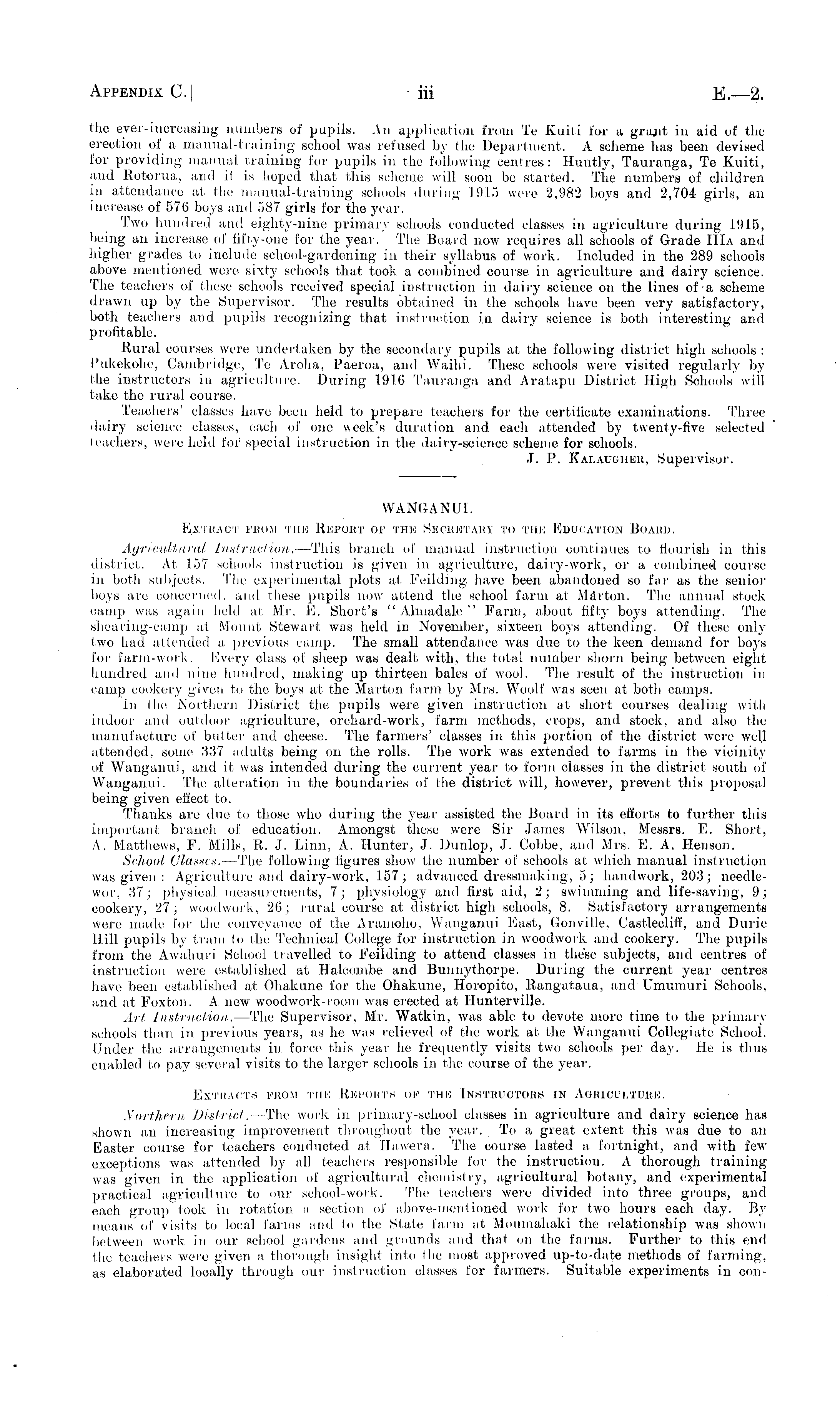 the ever-increasing numbers of pupils. An application from To Kuiti for a grant in aid of the erection of a manual-training school was refused by the Department. A scheme has been devised for providing manual training for pupils in the following centres: Huntly, Tauranga, Te Kuiti, and Rotorua, and it is hoped that this scheme will soon be started. The numbers of children in attendance at the manual-training schools during 1915 were 2,982 boys and 2,704 girls, an increase of 576 boys and 587 girls for the year. Two hundred and eighty-nine primary schools conducted classes irr agriculture during 1915, being an increase of fifty-one for the year. The Board now requires all schools of Grade IIIa and higher grades to include school-gardening in their syllabus of work. Included in the 289 schools above mentioned were sixty schools that took a combined course, in agriculture and dairy science. The teachers of these schools received special instruction in dairy science on the lines of-a scheme drawn up by the Supervisor. The results obtained in the schools have been very satisfactory, both teachers and pupils recognizing that instruction in dairy science is both interesting and profitable. Rural courses were undertaken by the secondary pupils at the following district high schools : Pukekohe, Cambridge, Te Aroha, Paeroa, arrd Waihi. These schools were visited regularly by the instructors in agriculture. During 1916 Tauranga and Aratapu District High Schools will take the rural course. Teachers' classes have beerr held to prepare teachers for the certificate examinations. Three dairy science classes, each of one week's duration and each attended by twenty-five selected teachers, were held for special instruction in the dairy-science scheme for schools. J. P. KaIaUGHER, Supervisor.