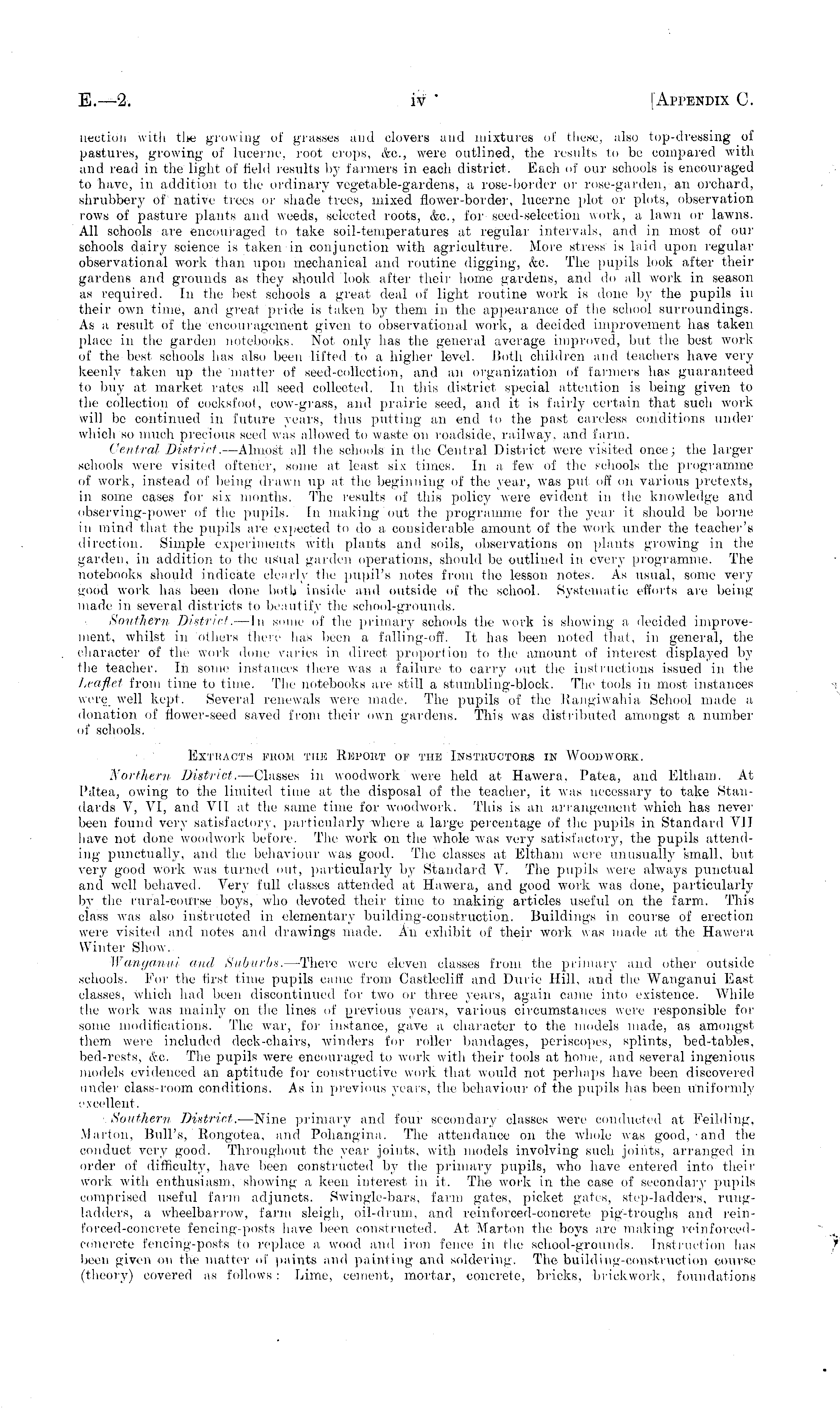 iieotioi) with tlwi growing of grasses and clovers and mixtures of these, also top-dressing of pastures, growing of lucerne, root crops, &c, were outlined, the results to be compared with and read in the light of field results by farmers in each district. Each of our schools is encouraged to have, in addition to the ordinary vegetable-gardens, a rose-border or rose-garden, an orchard, shrubbery of native trees or shade trees, mixed flower-border, lucerne plot or pints, observation rows of pasture plants and weeds, selected roots, &c, for seed-selection work, a lawn or lawns. All schools are encouraged to take soil-temperatures at regular intervals, and in most of our schools dairy science is taken in conjunction with agriculture. More stress is laid upon regular observational work than upon mechanical and routine digging, &o. The pupils look after their gardens and grounds as they should look after their home gardens, and do all work in season as required. In the best schools a great deal of light routine work is dune by the pupils in their own time, and great pride is taken by them in the appearance of the school surroundings. As a result of the encouragement given to observational work, a decided improvement has taken place in the garden notebooks. Not only has the general average improved, but the best work of the best schools has also been lifted to a higher level. Both children and teachers have very keenly taken up the matter of seed-collection, and an Organization of farmers has guaranteed tO buy at market rates all seed collected. In this district special attention is being given to the collection of cocksfoot, cow-grass, and prairie seed, and it is fairly certain that such work will be continued in future years, thus putting an end in the past careless conditions under which so much precious seed was allowed to waste on roadside, railway, and farm. Central District. —Almost all the schools in the Central District were visited once; the larger schools were visited ortetier, some at least six times. In a few of the schools the programme of work, instead of being drawn up at the beginning of the year, was put off on various pretexts, in some cases for six months. The results of this policy were evident in the knowledge and observing-power of the pupils. In making out the programme for the year it should be borne in mind that the pupils are expected to do a considerable amount of the work under the teacher's direction. Simple experiments with plants and soils, observations on plants growing in the garden, in addition to the usual garden operations, should be outlined in awry programme. The notebooks should indicate clearly the pupil's notes from the lesson notes. As usual, some very good work has been done both inside and outside of the school. Systematic efforts are being made in several districts to beautify the school-grounds. Soii/hera District. —ln some of the primary schools the work is showing a decided improvement, whilst in Others there has been a falling-off. It has been noted that, in general, the character of the work done varies in direct proportion to the amount of interest displayed by the teacher. In some instances there was a failure to carry out (lie instructions issued in the Leaflet from time to time. The notebooks are still a stumbling-block. The tools in most instances were _ well kept. Several renewals were made. The pupils of the Rangiwahia School made a donation of flower-seed saved from their own gardens. This was distributed amongst a number of schools. Extracts prow the Report of the Instructors in Woodwork. Northern District. —Classes in woodwork were held at Hawera, Patea, and Eltham. At I'atea, owing to the limited time at the disposal of the teacher, it was necessary to take Standards V, VI, and VII at the same time for "woodwork. This is an arrangement which has never been found very satisfactory, particularly where a large percentage of the pupils in Standard VII have not done woodwork before. The work on the whole was very satisfactory, the pupils attending punctually, and the behaviour was good. The classes at Eltham were unusually small, bul very good work was turned out, particularly by Standard V. The pupils were always punctual and well behaved. Very full classes attended at Hawera, and good work was done, particularly by the rural-course hoys, who devoted their time to making articles useful on the farm. This class was also instructed in elementary building-construction, Buildings in course of erection were visited and notes and drawings made. An exhibit, of their work was made tit the Hawera. Winter Show. Wanganui and Suburbs.- —There were eleven classes from the primary and other outside schools. For the first time pupils came from Castleclifi and Doric Hill, and the Wanganui East classes, which had been discontinued for two or three years, again came into existence. While the work was mainly on (he lines of previous years, various circumstances were responsible for some modifications. The war, for instance, gave a character to the models made, as amongst them were included deck-chairs, winders for roller bandages, periscopes, splints, bed-tables, bed-rests, eve. The pupils were encouraged to work with their tools at home, and several ingenious models evidenced an aptitude for constructive work that would not perhaps have been discovered under class-room conditions. As in previous years, the behaviour of the pupils has been uniformly excellent. Southern District. —Nine primary ami four secondary classes were conducted at Feilding, Marlon, Bull's, llongotca, and Pohangina. The attendance on the whole was g00d,.-and the conduct very good. Throughout the year joints, with models involving such joints, arranged in order of difficulty, have been constructed by the primary pupils, who have entered into their work with enthusiasm, showing a. keen interest in it. The work in the case of secondary pupils comprised useful farm adjuncts. Swi