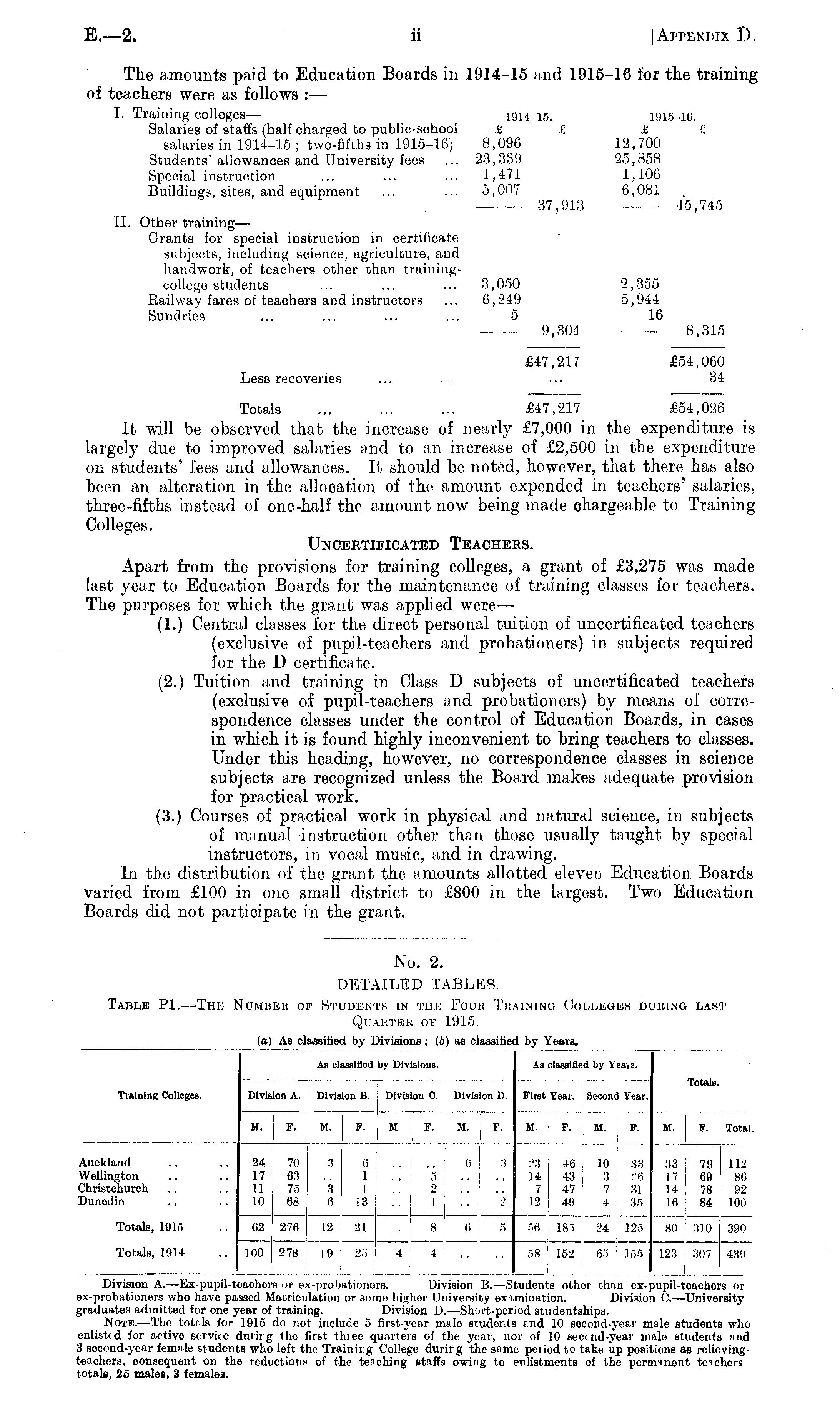 The amounts paid to Education Boards in 1914-15 and 1915-16 for the training of teachers were as follows : — I. Training colleges— 1914-15. 1915-10. Salaries of staffs (half charged to public-school £ £ £ £ salaries in 1914-15 ; two-fifths in 1915-16) 8,096 12,700 Students'allowances and University fees ... 23,339 25,858 Special instruction ... ... ... 1,471 1,106 Buildings, sites, and equipment ... ... 5,007 6,081 37,913 45,74.0 11. Other training — Grants for special instruction in certificate subjects, including science, agriculture, and handwork, of teachers other than trainingcollege students ... ... ... 3,050 2,355 Railway fares of teachers and instructors ... 6,249 5,944 Sundries ... ... ... ... 5 16 9,304 8,315 £47,217 £54,060 Less recoveries ... ... ... 34 Totals ... ... ... £47,217 £54,026 It will be observed that the increase of nearly £7,000 in the expenditure is largely due to improved salaries and to an increase of £2,500 in the expenditure on students' fees and allowances. It should be noted, however, that there has also been an alteration in the allocation of the amount expended in teachers' salaries, three-fifths instead of one-half the amount now being made chargeable to Training Colleges. Uncertificated Teachers. Apart from the provisions for training colleges, a grant of £3,275 was made last year to Education Boards for the maintenance of training classes for teachers. The purposes for which the grant was applied were — (1.) Central classes for the direct personal tuition of uncertificated teachers (exclusive of pupil-teachers and probationers) in subjects required for the D certificate. (2.) Tuition and training in Class D subjects of uncertificated teachers (exclusive of pupil-teachers and probationers) by means of correspondence classes under the control of Education Boards, in cases in which it is found highly inconvenient to bring teachers to classes. Under this heading, however, no correspondence classes in science subjects are recognized unless the Board makes adequate provision for practical work. (3.) Courses of practical work in physical and natural science, in subjects of manual instruction other than those usually taught by special instructors, in vocal music, and in drawing. In the distribution of the grant the amounts allotted eleven Education Boards varied from £100 in one small district to £800 in the largest. Two Education Boards did not participate in the grant.