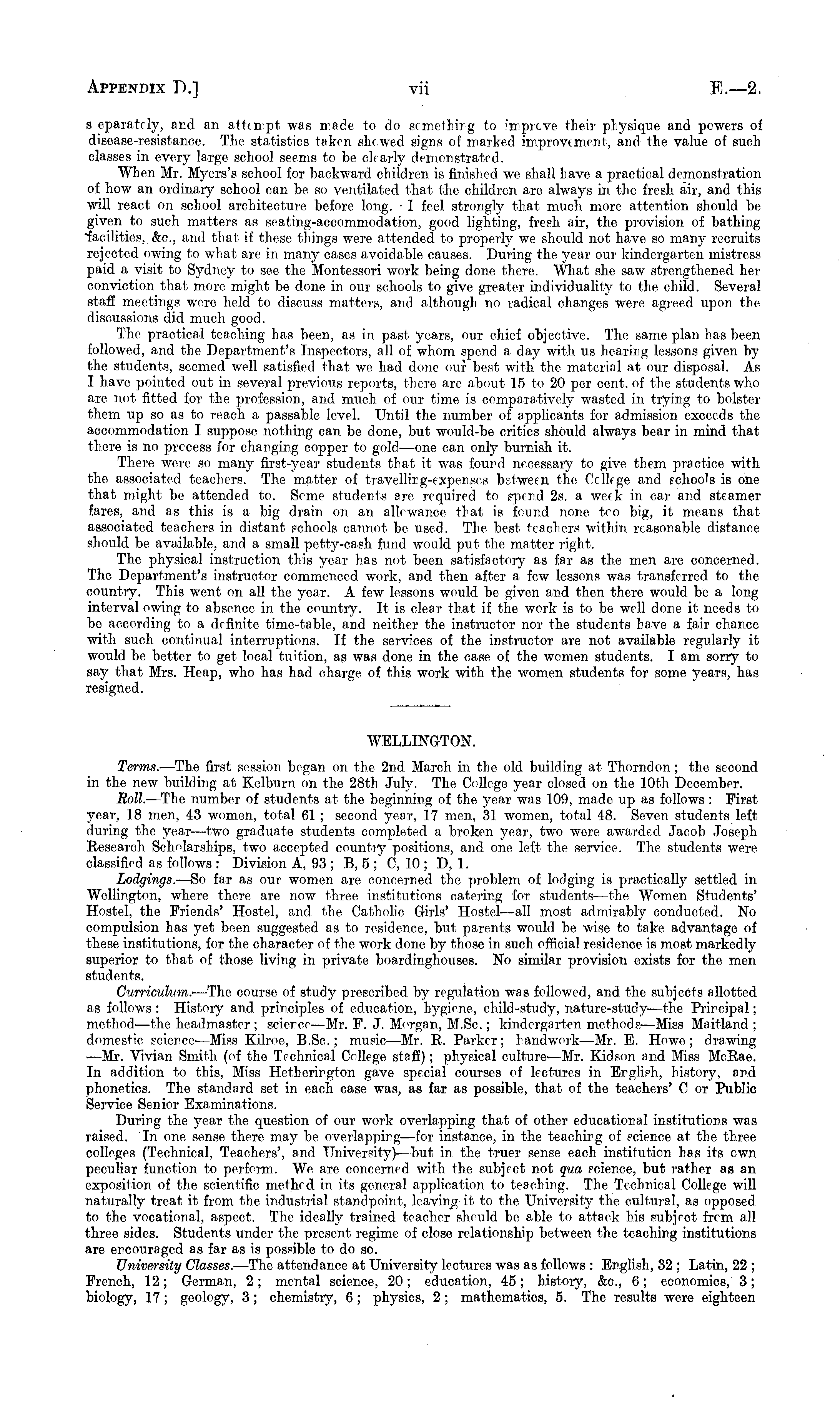 WELLINGTON. Terms.- —The first session began on the 2nd March, in the old building at Thomdon; the second in the new building at Kelburn on the 28th July. The College year closed on the 10th December. Roll. —The number of students at the beginning of the year was 109, made up as follows : First year, 18 men, 43 women, total 61 ; second year, 17 men, 31 women, total 48. Seven students left during tho year—two graduate students completed a broken year, two were awarded Jacob Joseph Research Scholarships, two accepted country positions, and one left the service. The students were classified as follows : Division A, 93 ; B, 5; C, 10 ; D, 1. Lodgings.- —So far as our women are concerned the problem of lodging is practically settled in Wellington, where there are now three institutions catering for students—the Women Students' Hostel, the Friends' Hostel, and the Catholic Girls' Hostel- —all most admirably conducted. No compulsion has yet been suggested as to residence, but parents would be wise to take advantage of these institutions, for the character of the work done by those in such official residence is most markedly superior to that of those living in private boardinghouses. No similar provision exists for the men students. Curriculum.- —The course of study prescribed by regulation was followed, and the subjects allotted as follows : History and principles of education, hygiene, child-study, nature-study-—the Principal; method—the headmaster ; scierce—Mr. F. J. Morgan, M.Sc.; kindergarten methods—Miss Maitland ; domestic science-—Miss Kilroe, B.Sc.; music-—Mr. R. Parker; handwork—Mr. E. Howe; drawing ■ —Mr. Vivian Smith (of the Technical College staff); physical culture—Mr. Kidson and Miss Mcßae. In addition to this, Miss Hethcrirgton gave special courses of lectures in English, history, and phonetics. The standard set in each case was, as far as possible, that of the teachers' C or Public Service Senior Examinations. During the year the question of our work overlapping that of other educational institutions was raised. In one sense there may be overlapping—for instance, in the teachirg of science at the three colleges (Technical, Teachers', and University)—but in the truer sense each institution has its own peculiar function to perferm. We are concerned with the subject not qua science, but rather as an exposition of the scientific method in its general application to teaching. The Technical College will naturally treat it from the industrial standpoint, leaving it to the University the cultural, as opposed to the vocational, aspect. The ideally trained teacher should be able to attack his subject from all three sides. Students under the present regime of close relationship between the teaching institutions are encouraged as far as is possible to do so. University Classes. —The attendance at University lectures was as follows : English, 32 ; Latin, 22 ; French, 12; German, 2; mental science, 20; education, 45; history, &c, 6; economics, 3; biology, 17; geology, 3; chemistry, 6; physics, 2 ; mathematics, 5. The results were eighteen