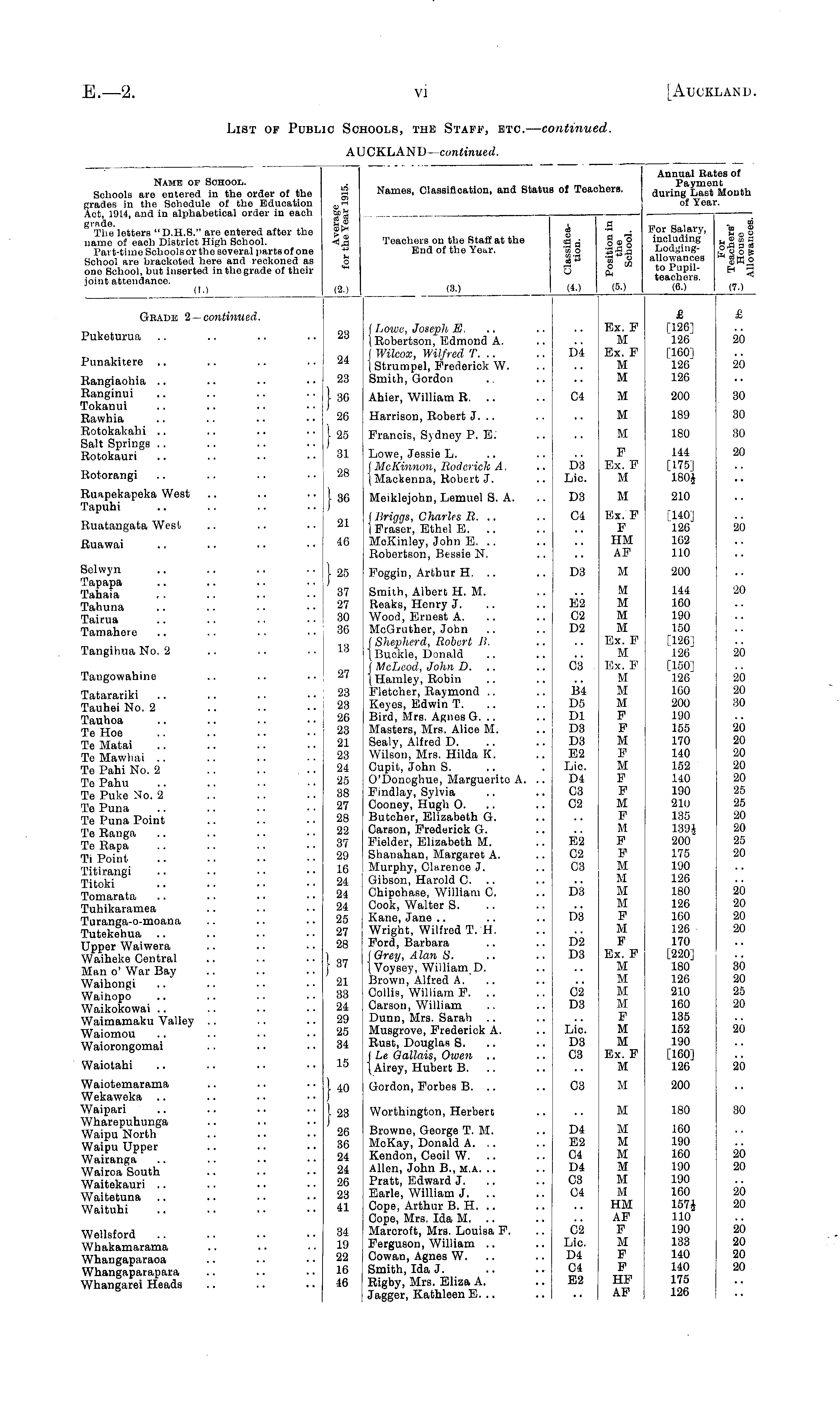Name of School. Schools are entered in the order of the grades in the Schedule of the Education Act, 1914, and in alphabetical order in each grade. The letters " D.H.S." are entered after the name of each District High School. Part-time Schools or the several jiarts of one School aro bracketed here and reckoned as one School, but inserted in tho grade of their joint attendance. (I.) cm SrH +4 h o Names, Classification, and Status of Teachers. Annual Kates of Payment during Last Mouth of Year. Teachers on the Staff at the End of the Year. (3.) i I'i ca o 01 -H ca-s-0 (4.) a irll -r^rC] 1 & Pa (8.) For Salary, "g § including fc oSo Lodging- .?■§ g S allowances m g^o to Pupil- f_, ta teachors. -"- (6.) (7.) (2.) Grade 2— continued. £ [126] 126 [160] 120 126 £ Puketurua Punakitere 23 24 f Lowe, Joseph E. (Robertson, Edmond A. ( Wilcox, Wilfred T. .. j Strumpel, Frederick W. Smith, Gordon D4 Ex. P M Ex. P M M 20 20 Rangiaohia Ranginui Tokanui Rawhia Rotokakahi Salt Springs Rotokauri 23 | 36 Ahier, William R. C4 M 200 30 26 Harrison, Robert J. .. M 189 30 I 25 Francis, Sydney P. E. Lowe, Jessie L. (MoKinnon, Roderick A. (Mackenna, Robert J. M 180 30 31 D3 Lio. P Ex. F M 144 [175] 180*. 20 Rotorangi 28 Ruapekapeka West Tapuhi | 36 Meiklejohn, Lemuel S. A. D3 M 210 21 j Hriggs, Charles R. .. I Fraser, Ethel E. .. MoKinley, John E. Robertson, Bessie N. C4 Ex. F F HM AF [140] 126 102 110 20 Ruatangata West Ruawai 46 Selwyn Tapapa Tahaia Tahuna Tairua Tamahete l 25 Poggin, Arthur H. .. D3 M 200 37 27 30 36 Smith, Albert H. M. Reaks, Henry J. Wood, Ernest A. McGruther, John j Shepherd, Robert ll. (Buckle, Donald j McLeod, John D. .. (Hamley, Robin Fletcher, Raymond Keyes, Edwin T. Bird, Mrs. Agnes G. .. Masters, Mrs. Alice M. Sealy, Alfred D. Wilson, Mrs. Hilda K. Cupit, John S. O'Donoghue, Marguerite A. .. Flndlay, Sylvia Gooney, Hugh 0. Butcher, Elizabeth G. Carson, Proderick G. Fielder, Elizabeth M. Shanahan, Margaret A. Murphy, Clarence J. Gibson, Harold C. .. Chipcbase, William C. Cook, Walter S. Kane, Jane Wright, Wilfred T.H. Ford, Barbara (Grey, Alan S. \Voysey, William D. Brown, Alfred A. Collis, William F. .. Carson, William Dunn, Mrs. Sarah Musgrove, Frederick A. Rust, Douglas S. J he Gallais, Owen .. \ Airey, Hubert B. .. Gordon, Forbes B. .. E2 C2 D2 M M M M Ex. P M Ex. P M M M F P M P M P P M P M P P M M M M P M P Ex. F M M M M F M M Ex. F M 144 160 190 150 [126] 126 [150] 126 160 200 190 155 170 140 152 140 190 210 135 139J 200 175 190 126 180 126 160 126 • 170 [220] 180 126 210 160 135 152 190 [160] 126 20 Tangihua No. 2 13 20 27 08 20 20 30 Tangowahine B4 D5 Dl D3 D3 E2 Lie. D4 03 C2 Tatarariki Tauhei No. 2 Tauboa Te Hoe Te Matai To Mawhai .. Te Pahi No. 2 Te Pahu Te Puke No. 2 Te Puna Te Puna Point To Ranga Te Rapa Ti Point Titirangi Titoki Tomarata Tuhikaramea Turanga-o-moana Tutekehua Upper Waiwera Waiheke Central Man o' War Bay Waihongi Waihopo Waikokowai Waimamaku Valley Waiomou Waiorongomai 23 23 26 23 21 23 24 25 38 27 28 22 37 29 16 24 24 24 25 27 28 20 20 20 20 20 25 25 20 HO 25 20 E2 C2 03 D3 D3 20 20 20 20 D2 D3 } 37 21 33 24 29 25 34 02 D3 30 20 25 20 Lio. D3 03 20 Waiotahi 15 20 Waiotemarama Wekaweka Waipari Wharepuhunga Waipu North Waipu Upper Wairanga Wairoa South Waitekauri Waitetuna Waituhi | 40 I 23 C3 M M 200 180 30 Worthington, Herbert 26 36 24 24 26 23 41 Browne, George T. M. McKay, Donald A. .. Kendon, Cecil W. Allen, John B., m.a. Pratt, Edward J. Earle, William J. .. Cope, Arthur B. H. .. Cope, Mrs. Ida M. .. Marcroft, Mrs. Louisa F. Ferguson, William .. Cowan, Agnes W. .. Smith, Ida J. Rigby, Mrs. Eliza A. Jagger, Kathleen E. .. D4 E2 C4 D4 03 04 M M M M M M HM AF P M P P HP AF 160 190 160 190 190 160 157* 110 190 133 140 140 175 126 20 20 20 20 Wellsford Whakamarama Whangaparaoa Whangaparapara Whangarei Heads 34 19 22 16 46 02 Lio. D4 04 E2 20 20 20 20