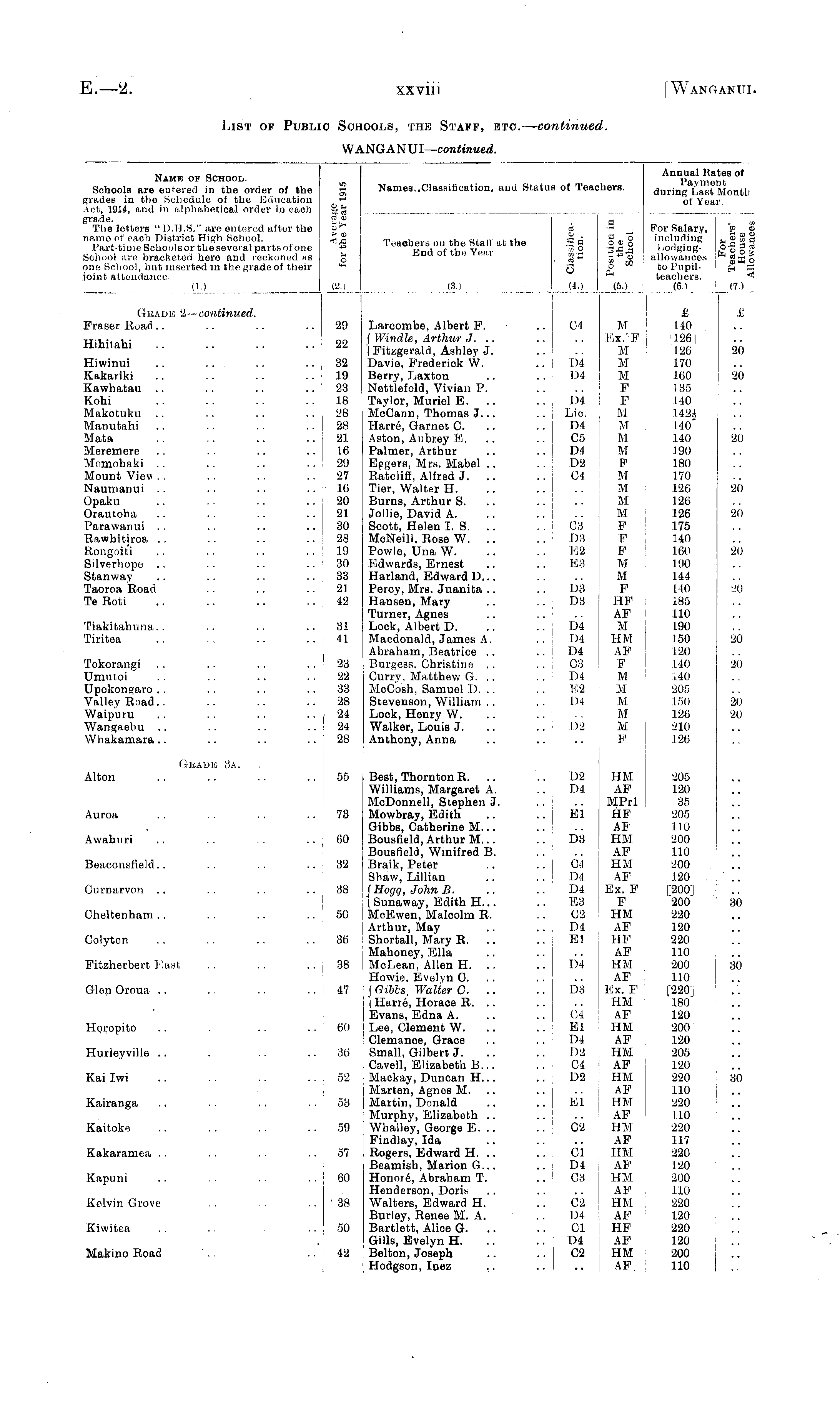Name of School. Schools are entered in the order of the g grades in the Schedule of the loducation th Act, 1914, and in alphabetical order in each o%\t grade. ,? The letters " D.H.S." are entered after the name of each District High School. < j^ Part-time Schooisor the several parts of one ' ■*= School are. bracketed here and reckoned us £ one School, but inserted in the grade of their *" joint attendance Names.,Classification, and Status of Teachers. Annual Kates of Payment during Last Month of Year a oi oi . fl "o Teachers on the Staff at the a o oo 0 End of the Vear I.S '35-g •a s » : (3.1 : «J (S.) I For Salary, £ <£ including h o q Lodging- o|gg allowances o to Pupil- I £h ;s teachers. (6.) i (7.) 0.) (2.) Grade 2— continued. Eraser Road.. .. .. 29 I Larcombe, Albert F. 04 M ' IWindle, Arthur J, .. .. .. Ex.'F I Fitzgerald, Ashley J. .. .. M Davie, Frederick W. D4 M Berry, Laxton .. .. D4 M Nettlefold, Vivian P. .. .. F Taylor, Muriel E. .. D4 F McGann, Thomas J... .. Lie. M Harre, Garnet C. .. .. D4 M Aston, Aubrey E. .. .. 05 M Palmer, Arthur .. .. D4 M Eggers, Mrs. Mabel .. D2 F Ratcliff, Alfred J. .. .. 04 M Tier, Walter H. .. .. .. M Burns, Arthur S. .. .. .. M Jollie, David A. .. .. .. M Scott, Helen I. S. .. .. 03 F McNeill, Rose W. .. .. D3 F Powle, Una W. .. .. E2 F Edwards, Ernest .. .. B8 M Harland, Edward D... .. .. M Percy, Mrs. Juanita .. .. D3 F Hansen, Mary .. .. D3 HF Turner, Agnes .. .. .. AF Lock, Albert D. .. .. D4 M Macdonald, Jamos A. .. D4 HM Abraham, Beatrice .. .. D4 AF Burgess. Christine .. .. 03 F Curry, Matthew G. .. .. D4 M McOosh, Samuel D. .. .. E2 ] M Stevenson, William .. .. D4 ■ M Lock, Henry W. .. .. .. M Walker, Louis J. .. .. D2 M Anthony, Anna .. .. .. F 140 1126] 126 20 170 160 20 1 35 140 142J 140 140 20 190 180 170 126 20 126 126 20 175 140 160 20 190 144 140 20 185 110 190 150 20 120 140 20 140 205 150 20 126 20 210 126 Hihitahi .. ..22 Hiwinui .. ... 32 Kakariki .. .. ., 19 Kawhatau .. .. .. 23 Kohi .. .. .. ..18 Makotuku .. .. .. ..28 Manutahi .. .. .. ..28 Mata .. .. .. ..21 Meremere .. .. .. 16 Momohaki .. .. .. 29 Mount View . . .. .-. ..27 Naumanui .. .. .. .. 16 Opaku .. .. .. ..20 Orautoha .. .. .. 21 Parawanui .. .. .. 30 Rawhitiroa .. .. .. 28 Kongoiti .. .. .. 19 Silverhope .. .. .. 30 Stanway .. .. .. 33 Taoroa Road .. .. .. 21 Te Roti .. .. .. .. ; 42 Tiakitahuna.. .. .. .. 81 Tiritea .. .. •. .. 41 20 Tokorangi . . .. .. .. I 28 Umutoi .. .. .. .. | 22 Upokongaro .. .. .. .. ' 88 Valley Road.. .. .. ..28 Waipuru .. .. .. ..24 Wangaehu .. .. .. 24 Whakamara.. .. .. 28 20 20 20 Grade 3a. Alton .. .. .. 55 Best, Thornton R. .. .. D2 HM Williams, Margaret A. .. D4 AF McDonnell, Stephen J MPrl Mowbray, Edith .. .. El HF Gibbs, Catherine M... .. .. AF Bousfield.ArthurM... .. D3 HM Bousfield, Winifred B. .. .. AF Braik, Peter .. .. 04 HM Shaw, Lillian .. .. D4 AF f Hogg, John B. .. .. D4 Ex. F (Sunaway, Edith H... .. E3 F McEwen, Malcolm R. 02 HM Arthur, May .. .. D4 AF Shortall, Mary R. .. .. El HF Mahoney, Ella .. .. .. AF McLean, Allen H. .. .. D4 HM Howie, Evelyn 0. .. .. .. AF I Gibbs, Walter 0. .. .. D8 Ex. F 1 Harre, Horace R. .. .. .. HM Evans, Edna A. .. .. 04 AF Lee, Clement W. .. .. El HM Clemance, Grace .. .. D4 AF Small, Gilbert J. .. .. j D2 HM Cavell, Elizabeth B... .. 04 AF Maokay, Duncan H... .. D2 HM Marten, Agnes M. .. .. .. AF Martin, Donald .. .. El HM Murphy, Elizabeth .. .. .. AF ; Wh.ftlJ.ey, George E. .. .. 02 HM Findlay, Ida .. .. .. AF Rogers, Edward H. .. .. 01 HM Beamish, Marion G... .. D4 AF Honore, Abraham T. 08 HM Henderson, Doris .. .. .. AF Walters, Edward H. 02 HM Burley, Renee M. A. .. D4 AF Bartlett, Alice G. .. .. 01 HF Gills, Evelyn H. .. .. ! D4 AF Belton, Joseph .. .. I 02 HM Hodgson, Inez ,. ..I .. AF. 205 120 85 205 UO 200 110 200 120 [200] 200 30 220 120 220 110 200 I 30 110 [220] 180 120 200 120 205 120 220 30 110 220 110 220 117 220 120 200 110 220 120 220 120 200 110 Auroa .. .. .. : 78 Awahuri .. .. .. .. ; 60 Beaconsfield.. .. .. ,. 82 Ournarvon .. . . ' . . .. I 88 Cheltenham .. .. ,. .. I SO Oolyton .. .. .. .. \ 86 Fitzherbert East .. .. .. I 88 Glen Oroua .. .. .. ..47 Horopito .. .. .. .. j 60 Hurleyville .. .. .. ' 36 Kai Iwi .. .. .. .. j 82 Kairanga .. .. .. .. i 58 Kaitoke .. .. .. ..59 Kakaramea .. .. .. .. i 37 Kapuni .. .. 60 Kelvin Grove . , . . .. ' 38 Kiwitea .. . . 50 Makino Road '.. .. ! 42