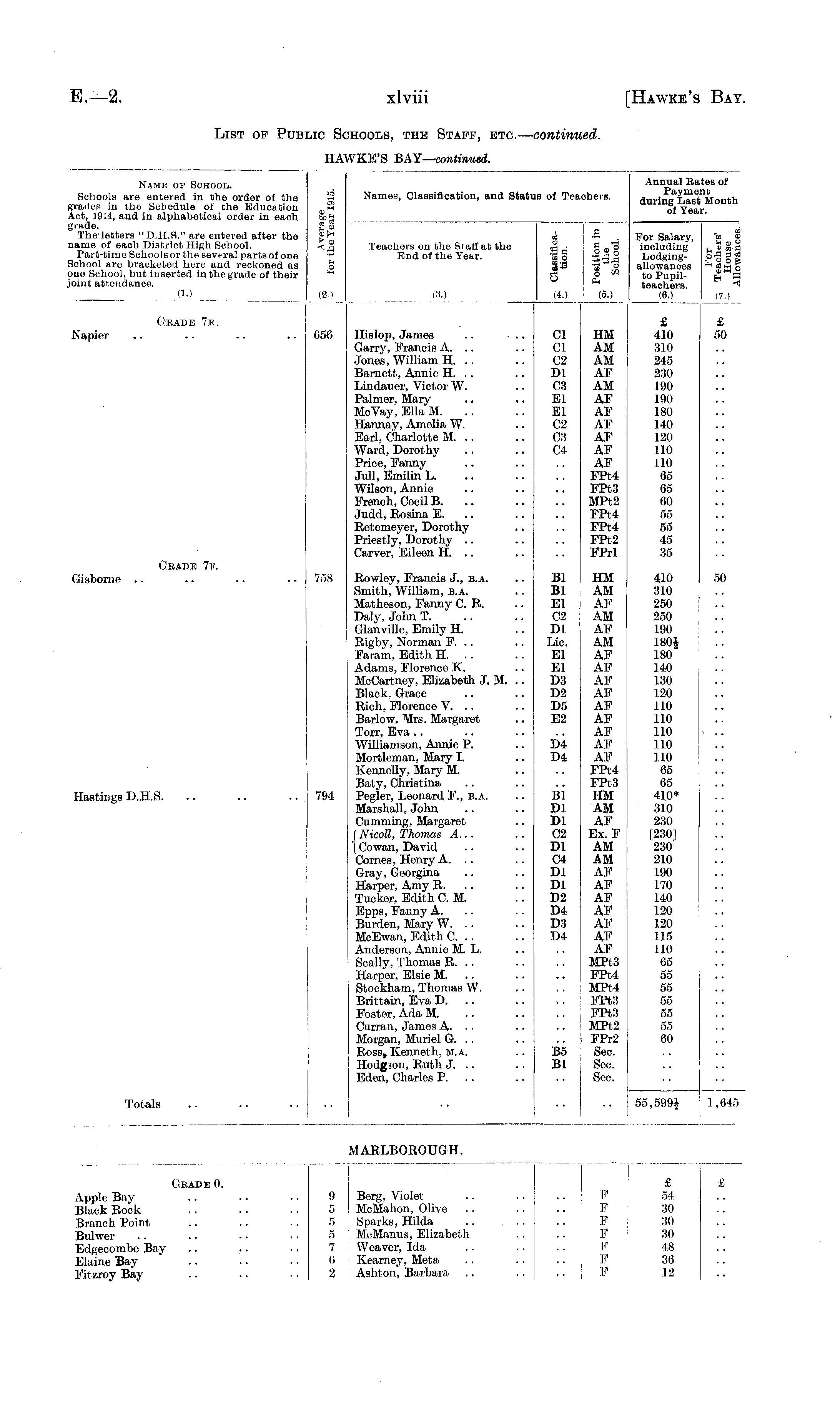 Name OS School. Schools are entered in the order of the grades in the Schedule of the Education Act, 1914, and in alphabetical order in each grade. The'letters "D.H.S." are entered after the name of each District High School. Par t-tiine School 8 or the several parts of one School are bracketed hero and reckoned as one School, but inserted in the grade of their joint attendance. ID O■dT 1 SPS 03 p-t a. ° _. o -H Names, Classification, and Status of Teachers. Annual Rates of Payment during Last Month of Year. Teachers on the Staff at the End of the Year. (30 cd e 3 a "co o CQ-n 3 (4.) .a .hi _ t 3 t £i 1 " O -- ft (5.) For Salary, *to e including „ e $ a Lodging- eg a ed allowances gtrj o to Pupil- fn 9 teachers. *s (6.) (7.) (L) (2.) I I Grade 7e. 656 £ 410 310 245 230 190 190 180 140 120 110 110 65 65 60 55 55 45 35 £ 50 Napier Hislop, James .. Garry, Francis A. .. Jones, William H. .. Barnett, Annie H. . . Lindauer, Victor W. Palmer, Mary McVay, Ella M. Hannay, Amelia W. Earl, Charlotte M. .. Ward, Dorothy Price, Fanny Jull, Emilin L. Wilson, Annie French, Cecil B. Judd, Rosina E. Retemeyer, Dorothy Priestly, Dorothy Carver, Eileen H. .. Cl Cl C2 Dl 03 El El C2 03 04 Cl Cl C2 Dl C3 El EI C2 C3 C4 HM AM AM AF AM AF AF AF AF AF AF FPt4 FPt3 MPt2 FPt4 FPt4 FPt2 FPrl HM 410 AM 310 AM 245 AF 230 AM 190 AF 190 AF 180 AF 140 AF 120 AF 110 AF 110 FPt4 65 FPt3 65 MPt2 60 FPt4 55 FPt4 55 FPt2 45 FPrl 35 50 Grade 7e. Rowley, Francis J., b.a. Smith, William, b.a. Matheson, Fanny OR. Daly, John T. ' .. Glanville, Emily H. Rigby, Norman F. .. Faram, Edith H. .. Adams, Florence K. McCartney, Elizabeth J. M. Black, Grace Rich, Florence V. .. Barlow, Mrs. Margaret Torr, Eva Williamson, Annie P. Mortleman, Mary I. Kennedy, Mary M. Baty, Christina Pegler, Leonard F., b.a. Marshall, John Cumming, Margaret (Nicoll, Thomas A... (Cowan, David Comes, Henry A. .. Gray, Georgina Harper, Amy R. Tucker, Edith CM. Epps, Fanny A. Burden, Mary W. .. McEwan, Edith C. .. Anderson, Annie M. L. Scally, Thomas R. .. Harper, Elsie M. .. Stookham, Thomas W. Brittain, Eva D. .. Foster, Ada M. Curran, James A. .. Morgan, Muriel G. .. Ross, Kenneth, m.a. Hodgson, Ruth J. .. Eden, Charles P. Bl Bl El 02 Dl Lio. El El D3 D2 D5 E2 D4 D4 Bl Dl Dl 02 Dl 04 Dl Dl D2 D4 D3 D4 B5 Bl Bl Bl El C2 Dl Lie. El El D3 D2 D5 E2 HM AM AF AM AF AM AF AF AF AP AF AF AF AF AF FPt4 PPt3 HM AM AF Ex. F AM AM AF AF AF AF AF AF AF MPt3 FPt4 MPt4 FPt3 FPt3 MPt2 FPr2 Sec. Sec. Sec. HM 410 AM 310 AF 250 AM 250 AF 190 AM 180J AF 180 AF 140 AF 130 AP 120 AF 110 AF 110 AF 110 AF 110 AF 110 FPt4 65 FPt3 | 65 HM ! 410* AM : 310 AF I 230 Ex. F ' [230] AM | 230 AM i 210 AF i 190 AP 170 AF ! 140 AF ' 120 AF 120 AF 115 AF UO MPt3 65 FPt4 55 MPt4 55 FPt3 55 FPt3 55 MPt2 55 PPr2 60 Sec. Sec. Sec. 410 310 250 250 190 180J 180 140 130 120 110 110 110 110 110 65 65 410* 310 230 [230] 230 210 190 170 140 120 120 115 UO 65 55 55 55 55 55 60 50 50 Gisbome 758 Hastings D.H.S. D4 D4 794 Bl Dl Dl C2 Dl C4 Dl Dl D2 D4 D3 D4 B5 Bl Totals 55,599* 1,645 MARLBOROUGH. Grade 0. Apple Bay Black Rock Branch Point Bulwer Edgecombe Bay Elaine Bay Fitzroy Bay 9 Berg, Violet 5 McMahon, Olive 5 Sparks, Hilda 5 McManus, Elizabeth 7 Weaver, Ida 6 Kearney, Meta 2 Ashton, Barbara £ F 54 F 30 F 30 F 30 P 48 F 30 F 12 F V ¥ F F F F £