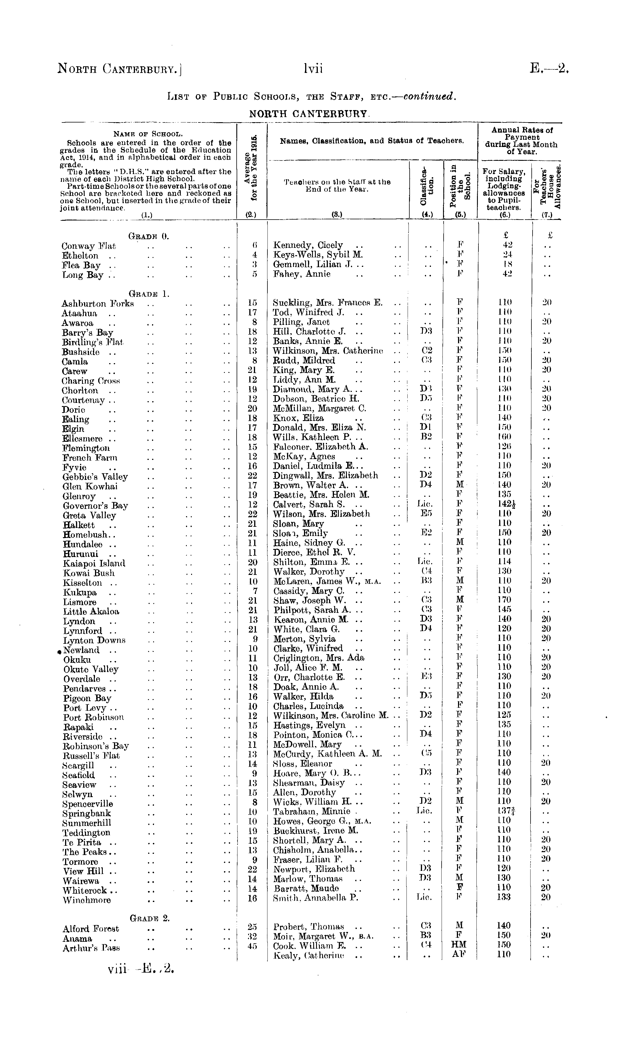 Namf, or School. Schools are entered in the order of the grades in the Schedule of the Education Act, 1014, and in alphabetical order in each grade. The letters " D.H.S." are entered after the name of each District High School. Part-time Schools or the several parts of one Sohool are bracketed here and reckoned as one School, but inserted in the grade of their joint attendance. iri oc rH e i4 5»3 cd e £ o <A -4-» u o •H Names, Classification, and Statu: of Teai thers. Annual Kates of Payment during Last Month of Year. Teaohers on the Staff at the End of tho Year. dl *> . ca O I a 5 a a _ .2 2° ra-wi; § to Ph (SO For Salary, £ e including b e £ g Lodging- o|gcd allowances EC o tO Pltpil- f_, *3 teachers. *J (6.) (7.) . (2.) (3.) wo. ao Grade 0. Conway Flat Ethelton Flea Bay .. f.ong Bay F F • F F £ £ £ 42 24 IS 42 6 4 3 5 Kennedy, Cicely Keys-Wells, Sybil M. Gemmell, Lilian J. .. Fahcy, Annie 42 24 IS 42 Grade 1. Ashburton Forks Ataahua Awaroa Barry's Bay Birdling's Flat Bushside Camla Carew Charing Cross Chorlton Courtenay Doric Ealing Elgin Ellesmere Flemington French Farm Fyvic Gebbie's Valley Glen Kowhai Glenroy Governor's Bay Greta Valley Halkett Homebush.. Hundalee Hurunui Kaiapoi Island Kowai Bush Kissolton Kukupa Lismore Little Akaloa Lyndon Lynnford Lynton Downs . Newlantl Okuku Okute Valley Overdale Pendarves Pigeon Bay Port Levy Port Robinson Rapaki Riverside Robinson's Bay Russell's Plat Scargill Seaticld Seaview Selwyn Spencerville Springbank Summerhill Teddington Te Pirita The Peaks Tormoro View Hill .. Wairewa Whiterock Winohmore 15 17 8 18 12 13 8 21 12 19 12 20 18 17 is 15 12 16 22 17 I!) 12 22 21 21 11 11 20 21 Ml 7 21 21 13 21 9 10 11 10 13 18 16 Id 12 15 18 II 13 14 9 13 15 8 10 Ml III 15 13 9 22 14 14 16 Suckling, Mrs. Prances E. .. Tod, Winifred J. .. Pilling, Janet .. Hill, Charlotte J. .. Banks, Annie E. .. Wilkinson, Mrs. Catherine .. Rudd, Mildred King, Mary E. .. Liddy. Ann M. -. Diamond, Mary A. .. Dobson, Beatrice H. McMillan, Margaret C. Knox, Eliza .. .-. Donald, Mrs. Eliza N. .. i Wills. Kathleen P. .. Falconer. Elizabeth A. McKay, Agnes Daniel, Ludmila E... Dingwall, Mrs. Elizabeth Brown, Walter A. .. Beattie, Mrs. Helen M. Calvert, Sarah S. .. Wilson, Mrs. Elizabeth Sloan, Mary Sloai, Emily Haine, Sidney G. .. Dierce. Ethol R. V. Shilton, Emuu E. .. Walker, Dorothy McLaren, James W., m.a. Oassidy, Mary 0. .. Shaw, Joseph W. .. Philpott, Sarah A. .. Kearon, Annio M. .. White, Clara G. Morton, Sylvia .. Clarke, Winifred .. Origlington, Mrs. Ada Jolt, Alioe F. M. .. Orr, Charlotte E. .. Doak, Annie A. Walker, Hilda Charles, Lucinda .. .. Wilkinson, Mrs. Caroline M. .. ' Hastings, Evelyn Pointon, Monica 0... McDowell. Mary McCurdy, Kathleen A. M. Sloss, Eleanor .. Hoare, Mary (). 15... Shearman, Daisy Allen. Dorothy Wicks. William H. .. Tabraham, Minnie . Howes, George G., m.a. Buckhurst. Irene M. Shortcll, Mary A. .. Ohishoiin, Anabella.. Fraser, Lilian F. Newport, Elizaboth Marlow, Thomas Barratt, Maude Smith. Anualiella P. D3 02 03 Dl 1)5 03 Dl 152 D2 D4 Lie. E5 E2 Lie. 04 153 03 03 D3 1)4 E3 Dr. D2 D4 05 D3 D2 Lio. 1)3 D3 Lie. ¥ F F F F P F F F F F F F F F F F F 1' M F F F F F M F F F M F M F F F F F F 1'' F F F F F F F F F P F !■' F M F M F F F F F M F F 110 20 11(1 110 20 IK) 11(1 20 150 150 20 110 20 11(1 13(1 20 III) 20 III) 20 140 150 100 120 mi 110 20 1.50 140 20 I OK 135 142$ 110 20 110 150 20 110 110 114 .130 no 20 uo no 11(1 no no mi 15(1 180 no no 13(1 no no 140 150 ion 120 llll no 150 140 135 142$ no no 150 no no 114 130 no no 170 145 140 120 110 110 110 110 130 no no no 125 135 no no no no 140 no no 110 1.37, no no mi no no 120 130 no 133 170 145 140 20 120 20 110 20 UO 110 20 110 20 130 20 UO no 2o 110 125 I Oft 135 110 1.10 20 20 20 20 20 20 20 20 Grade 2. 25 32 45 Probert, Thomas Moir. Margaret. W., b.a. Cook. William E. .. Kealy, Catherine 03 B3 04 M F HM AF 140 150 150 no 20 Alford Forest Anama Arthur's Pass